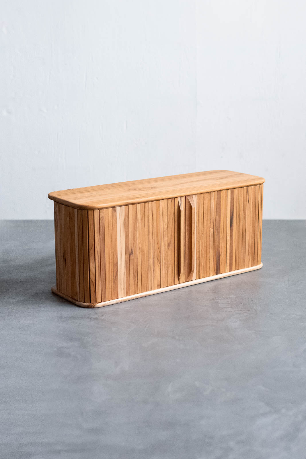 するすると開く蛇腹扉が特徴的なミニシェルフ。装飾性と実用性を兼ねており、コンパクトながら目を惹く存在感があります。ヴィンテージ家具のような情緒あふれる佇まいが素敵です。