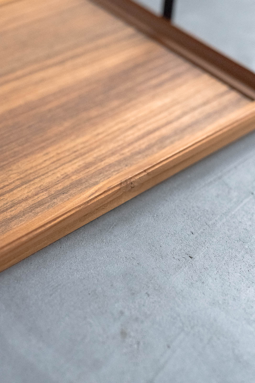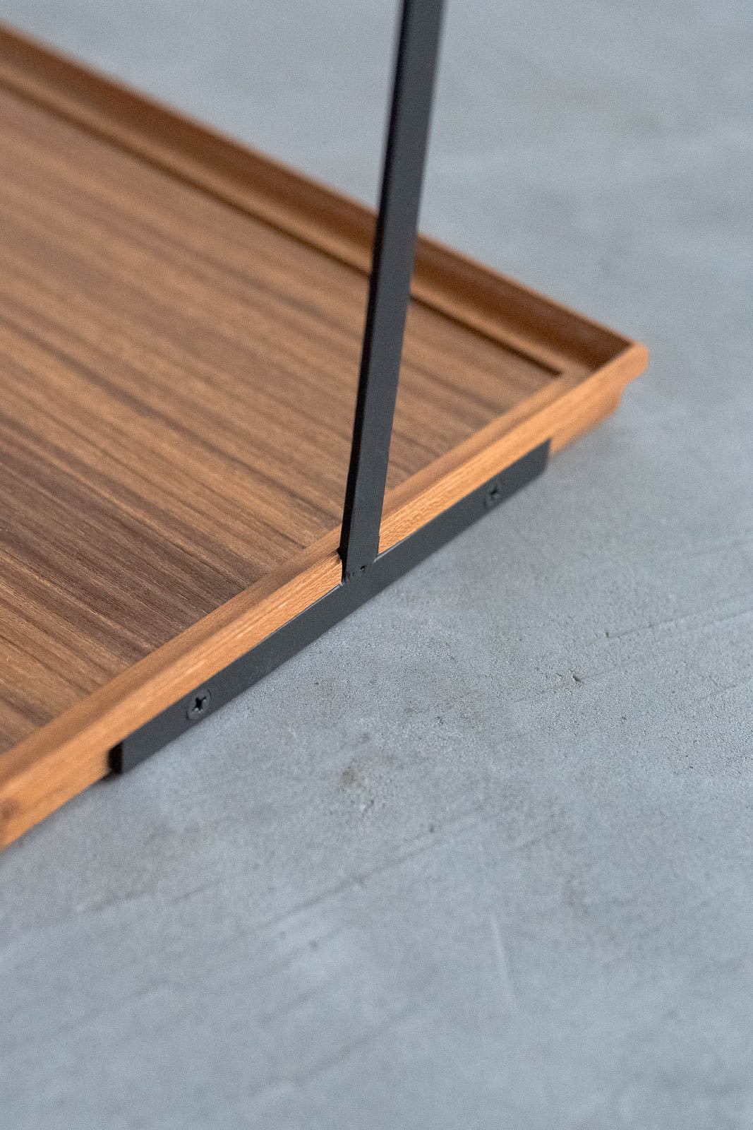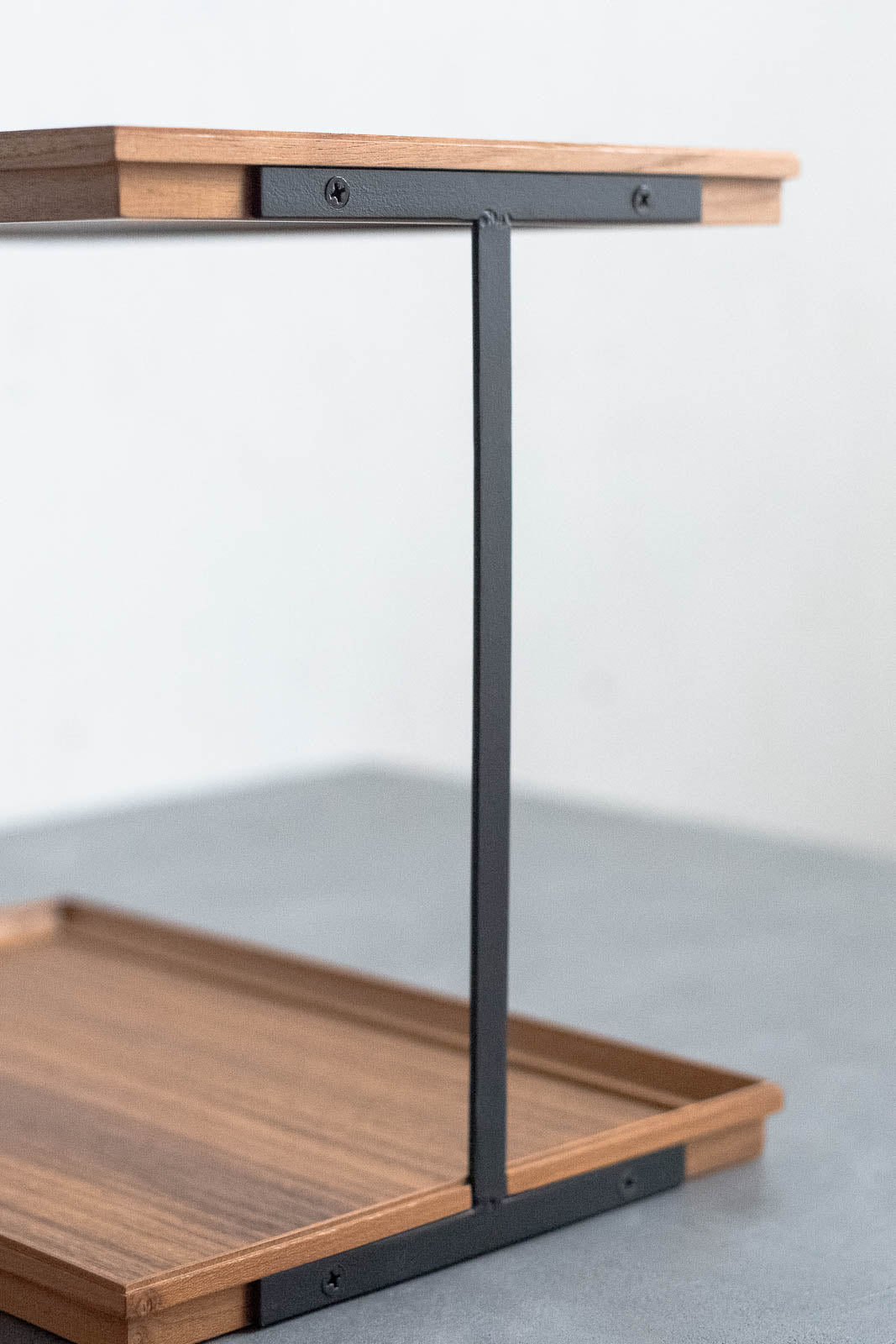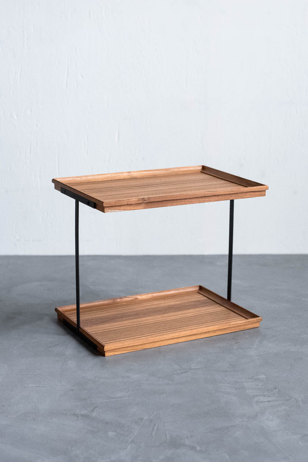 無垢チーク材×アイアンスタンドのシンプルな2段式トレイ。シンプルなデザインながら、温かみあるチークの風合いが目を惹く、各所で活躍するシェルフです。
