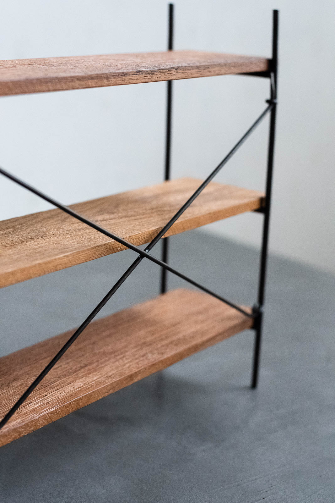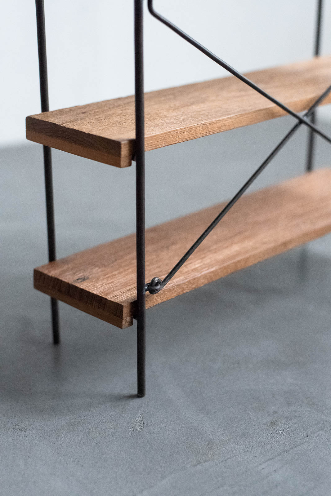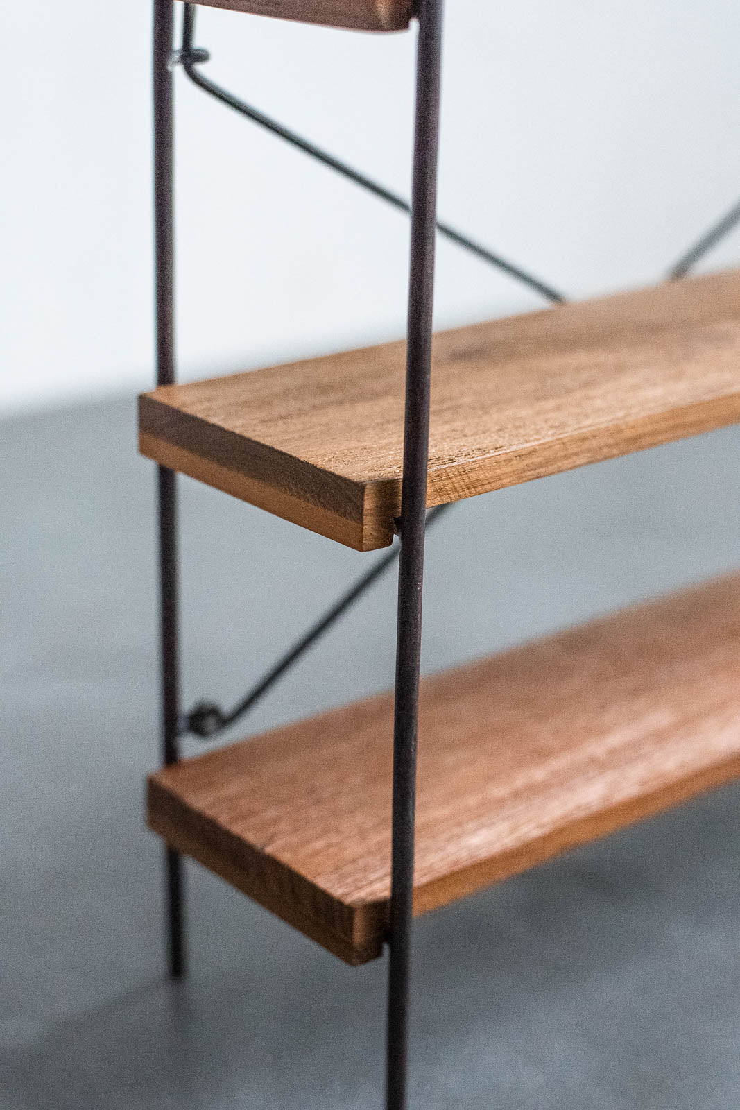 無垢チーク材×アイアンスタンドのシンプルな置き型シェルフ。シンプルなデザインながら、温かみあるチークの風合いが目を惹く、各所で活躍間違いなしのシェルフです。