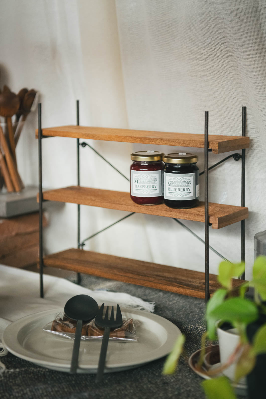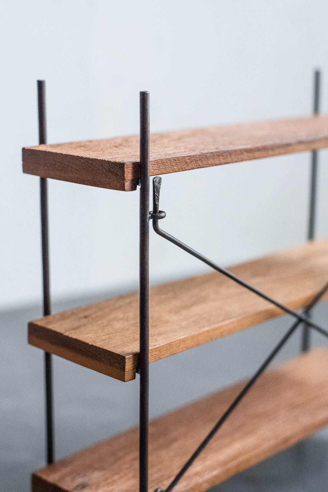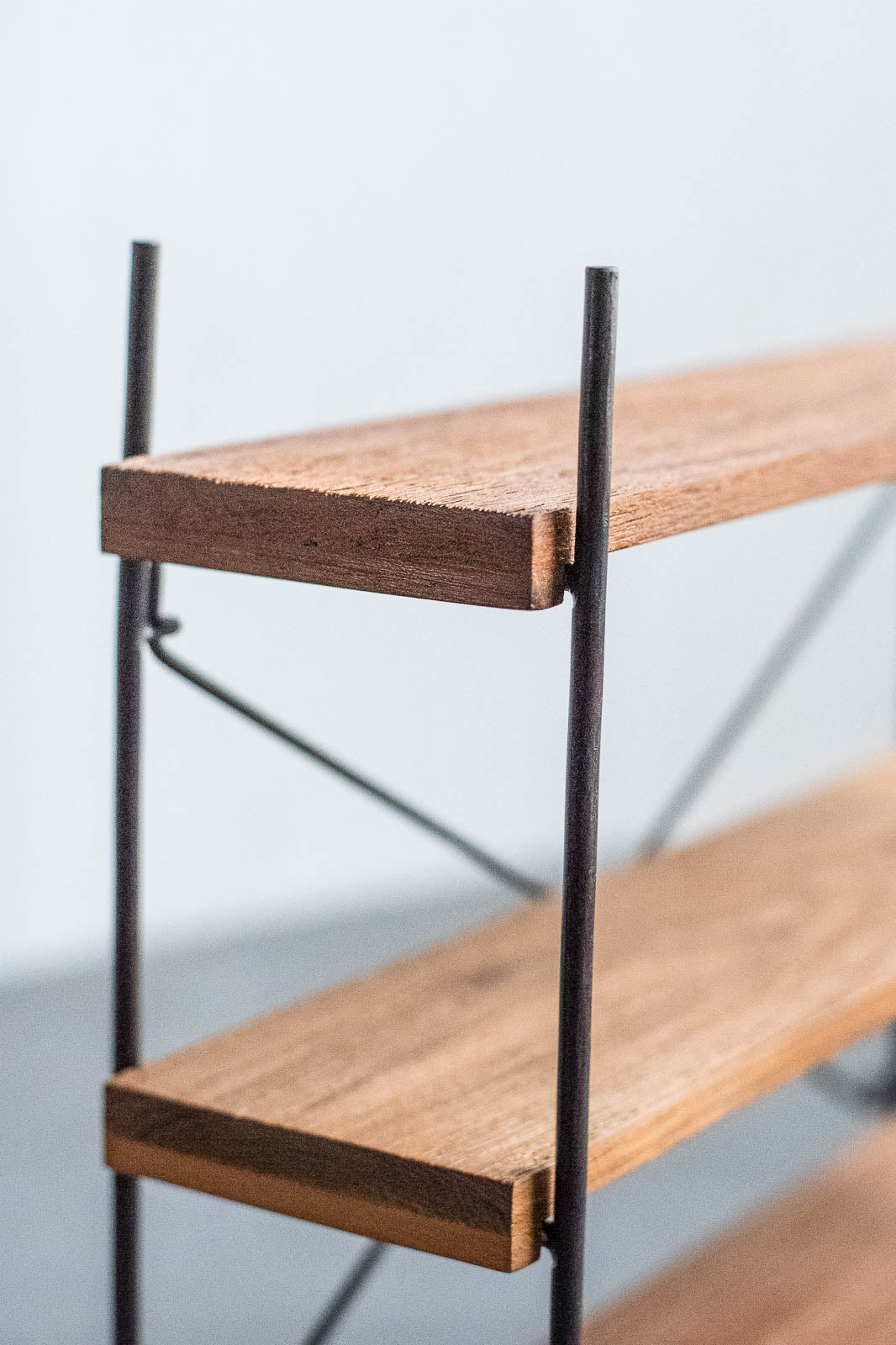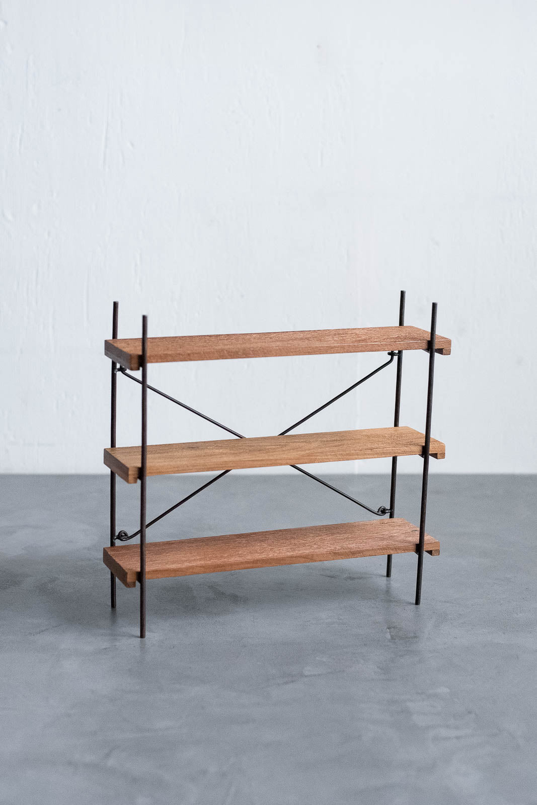 無垢チーク材×アイアンスタンドのシンプルな置き型シェルフ。シンプルなデザインながら、温かみあるチークの風合いが目を惹く、各所で活躍間違いなしのシェルフです。
