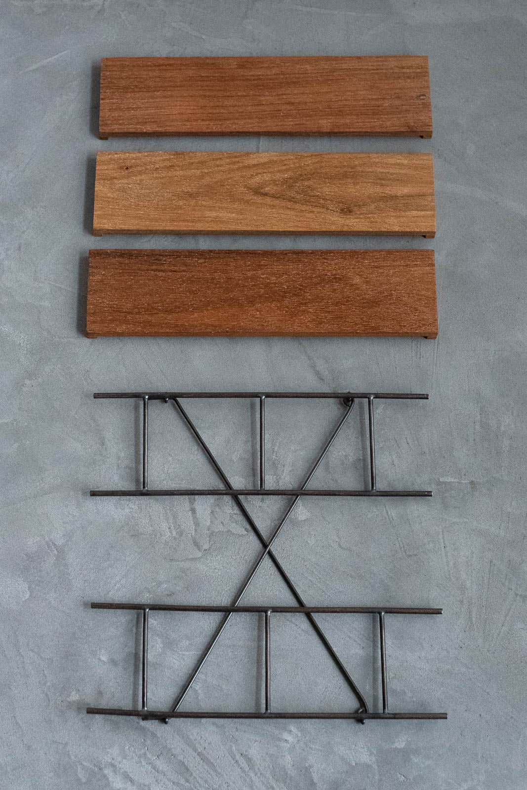 棚板の素材には、長年家具や内装材として使用されてきた高級木材のチークを新たに蘇らせた希少な「リサイクルチーク」を使用。チーク材は伐採後、時間の経過とともに木の水分保有率が下がり、硬く頑丈に変化します。経年による味わいが生み出す深みのある風合いも魅力の素材です。
