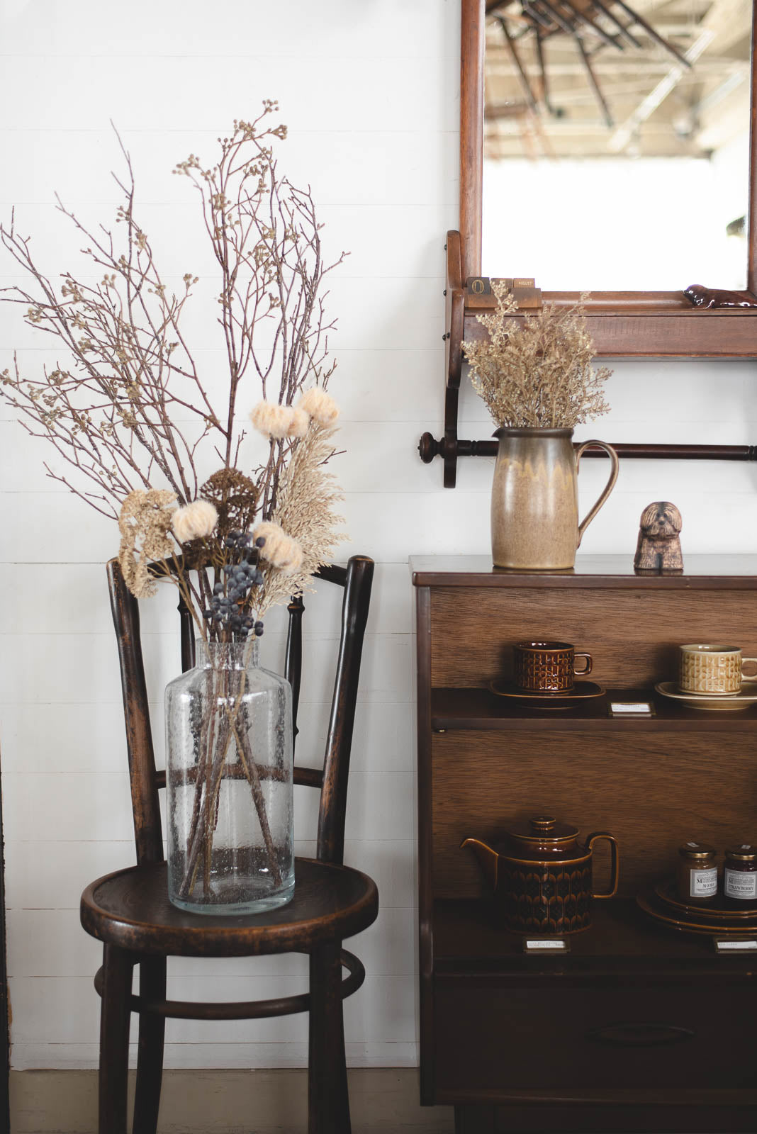 しなやかで扱いやすく、1本でも2本でも空間に自然なアクセントを添えられますが、「1本だけでは少し寂しく感じる」「何を組み合わせればいいかわからない」という方には、フェイクボタニカルセット5本とのコーディネートがおすすめ。