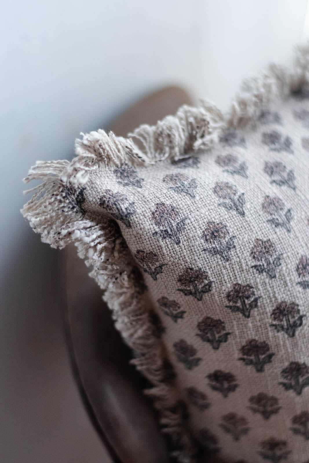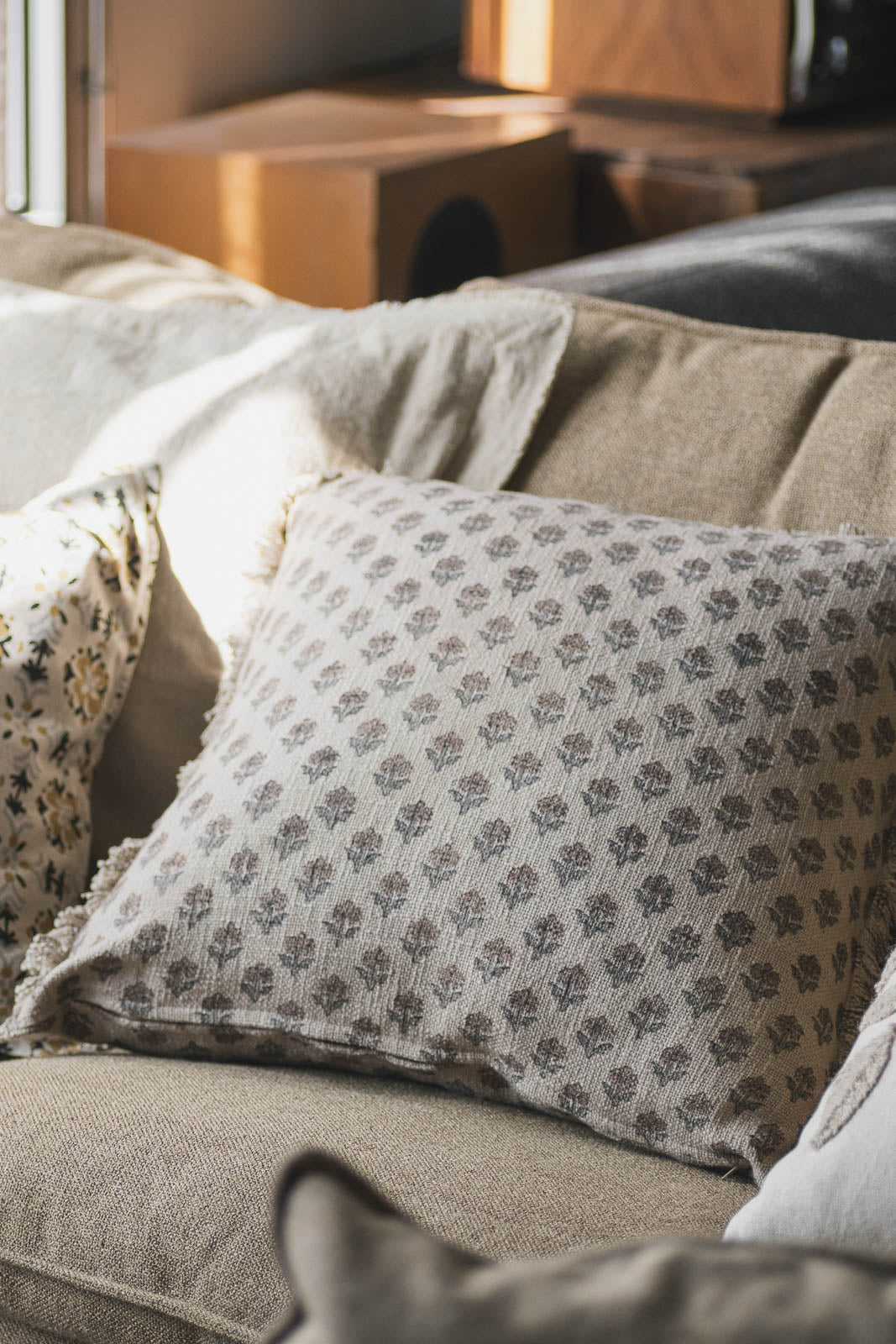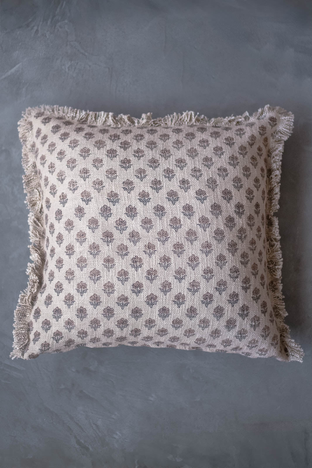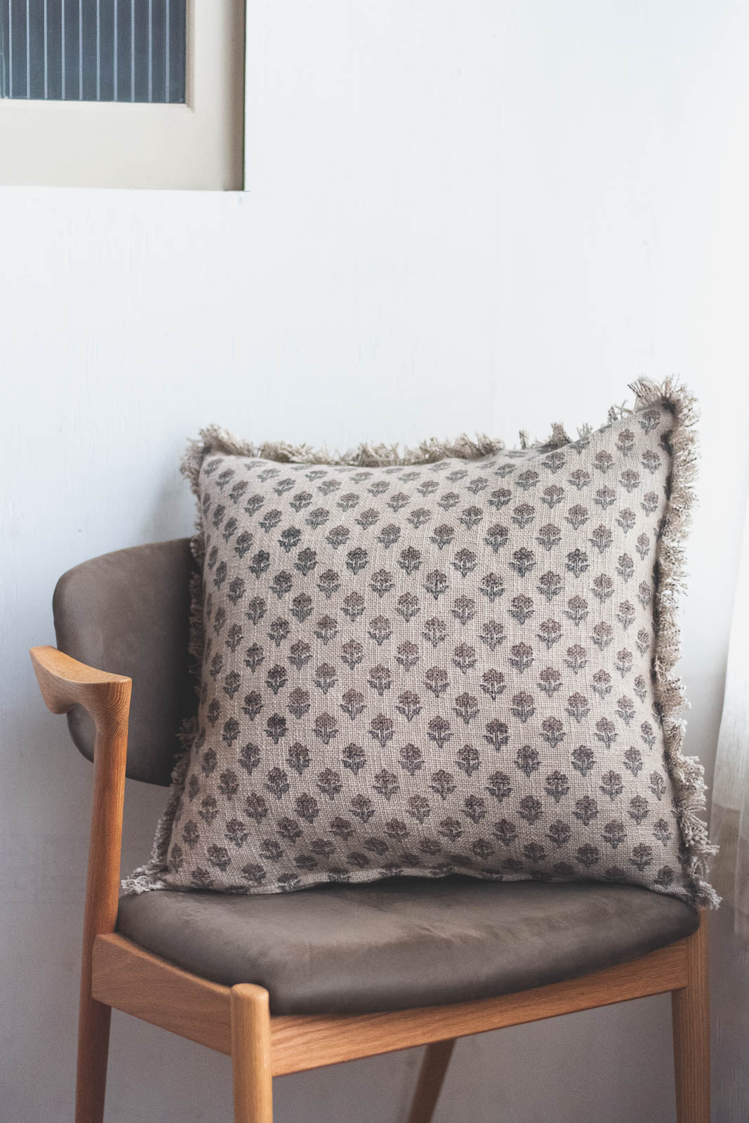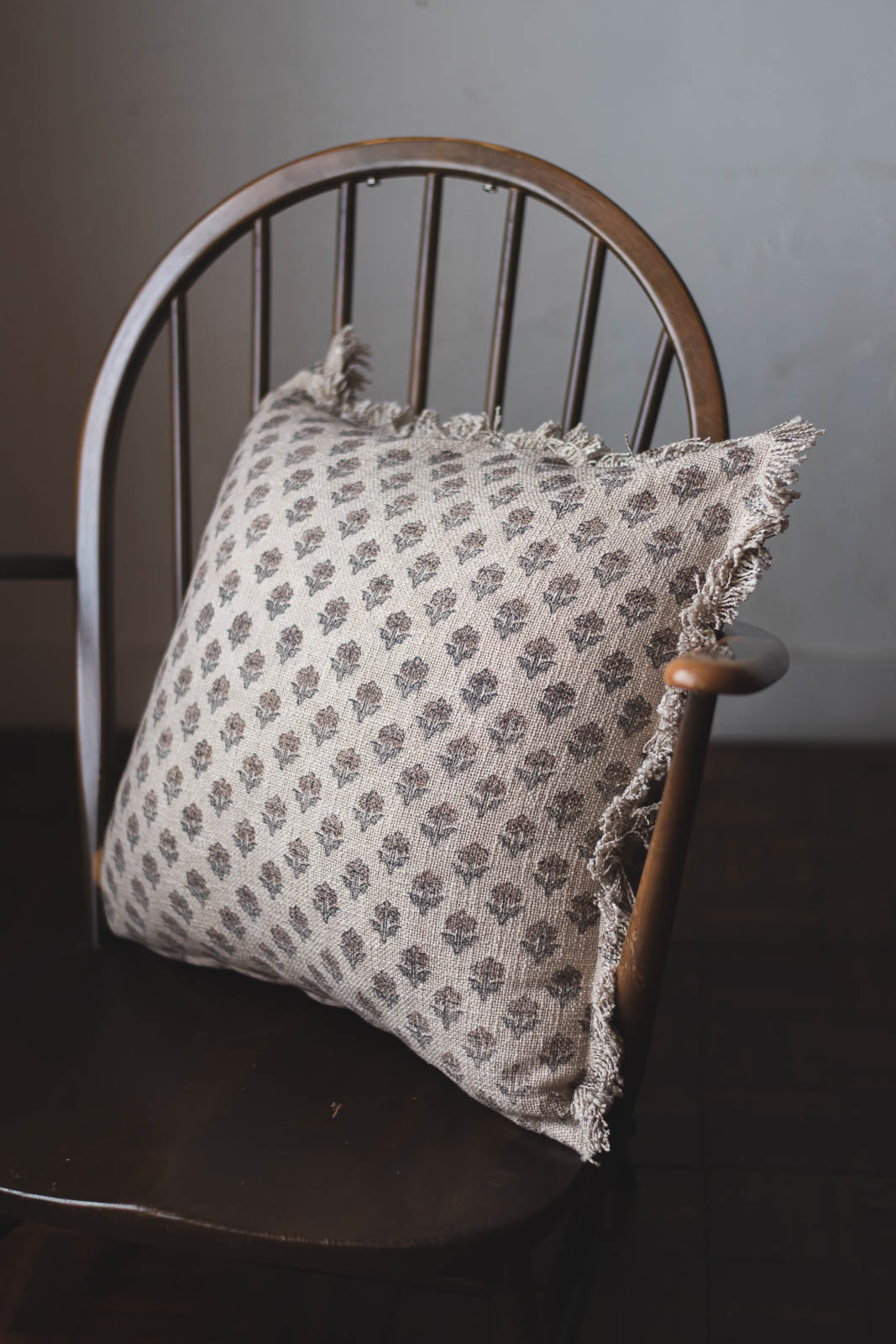 ポン、ポン、と木版を押す音が聞こえてきそうな、手しごとのぬくもりを感じるクッションカバー。