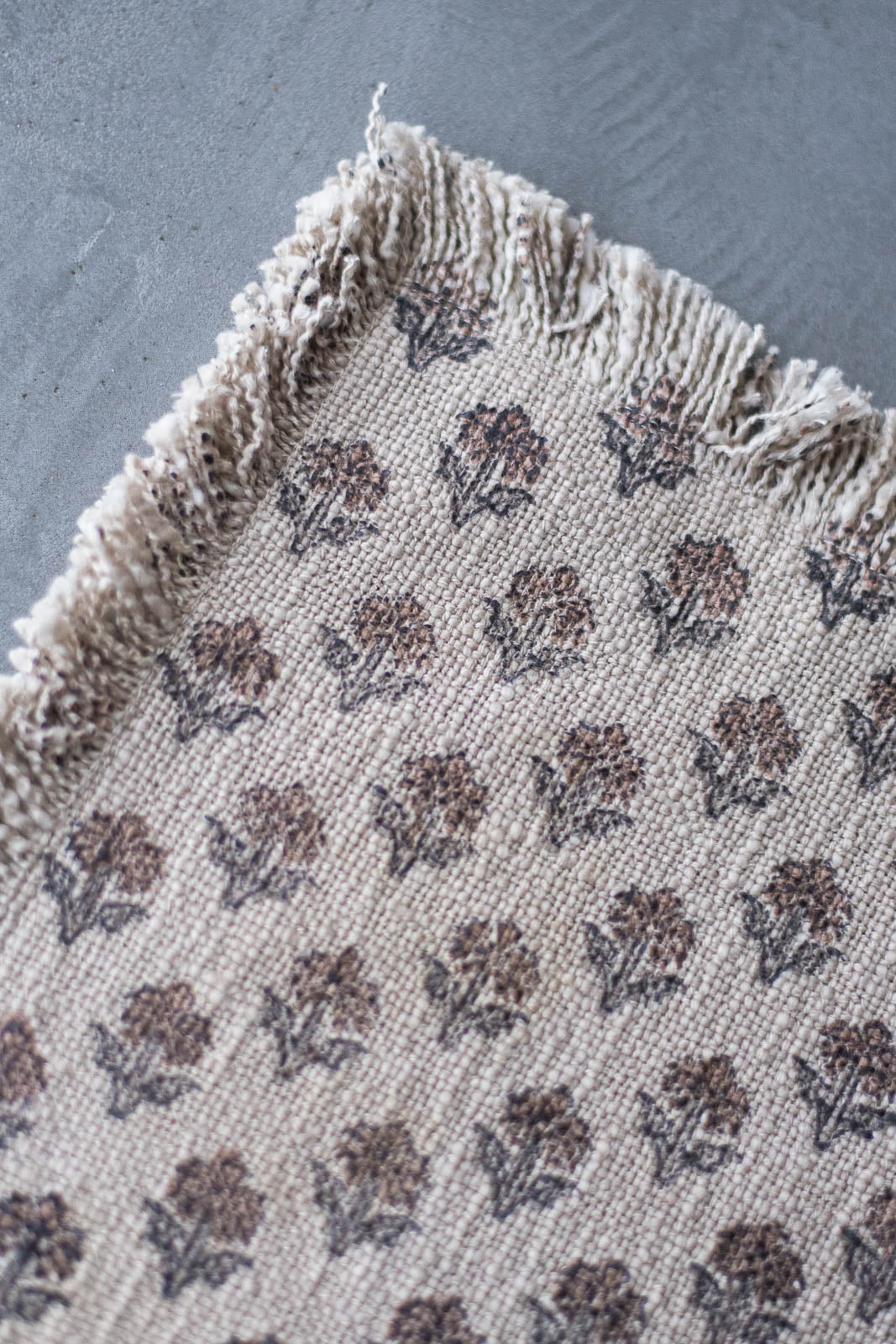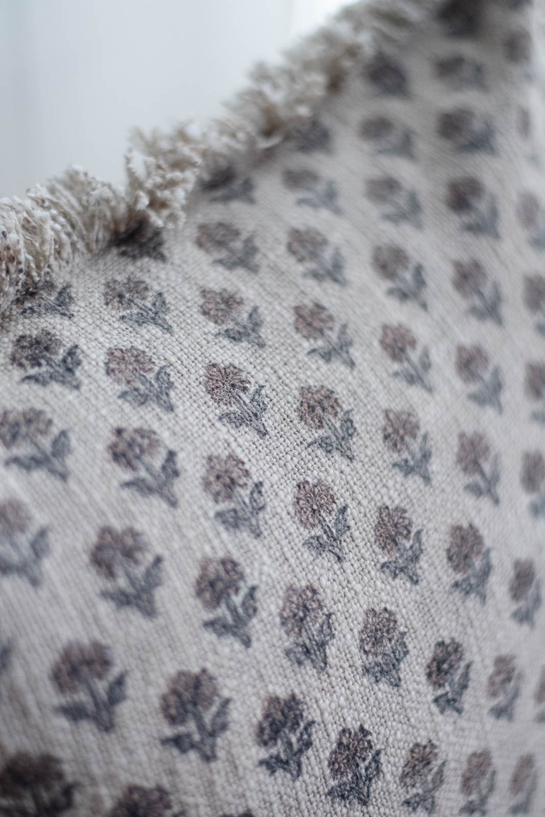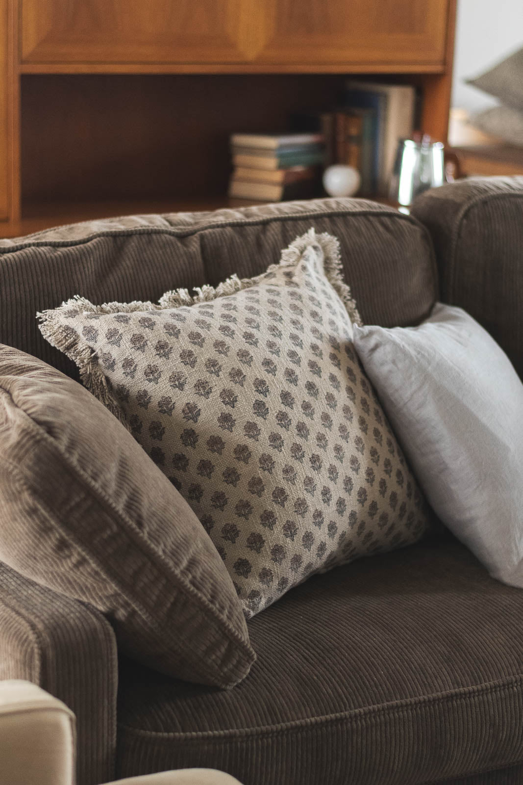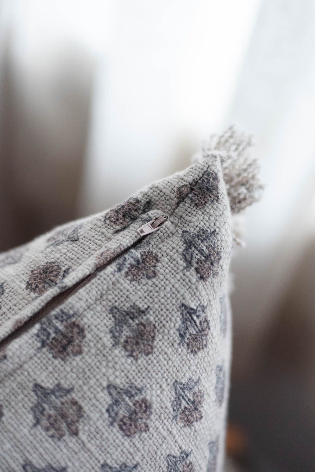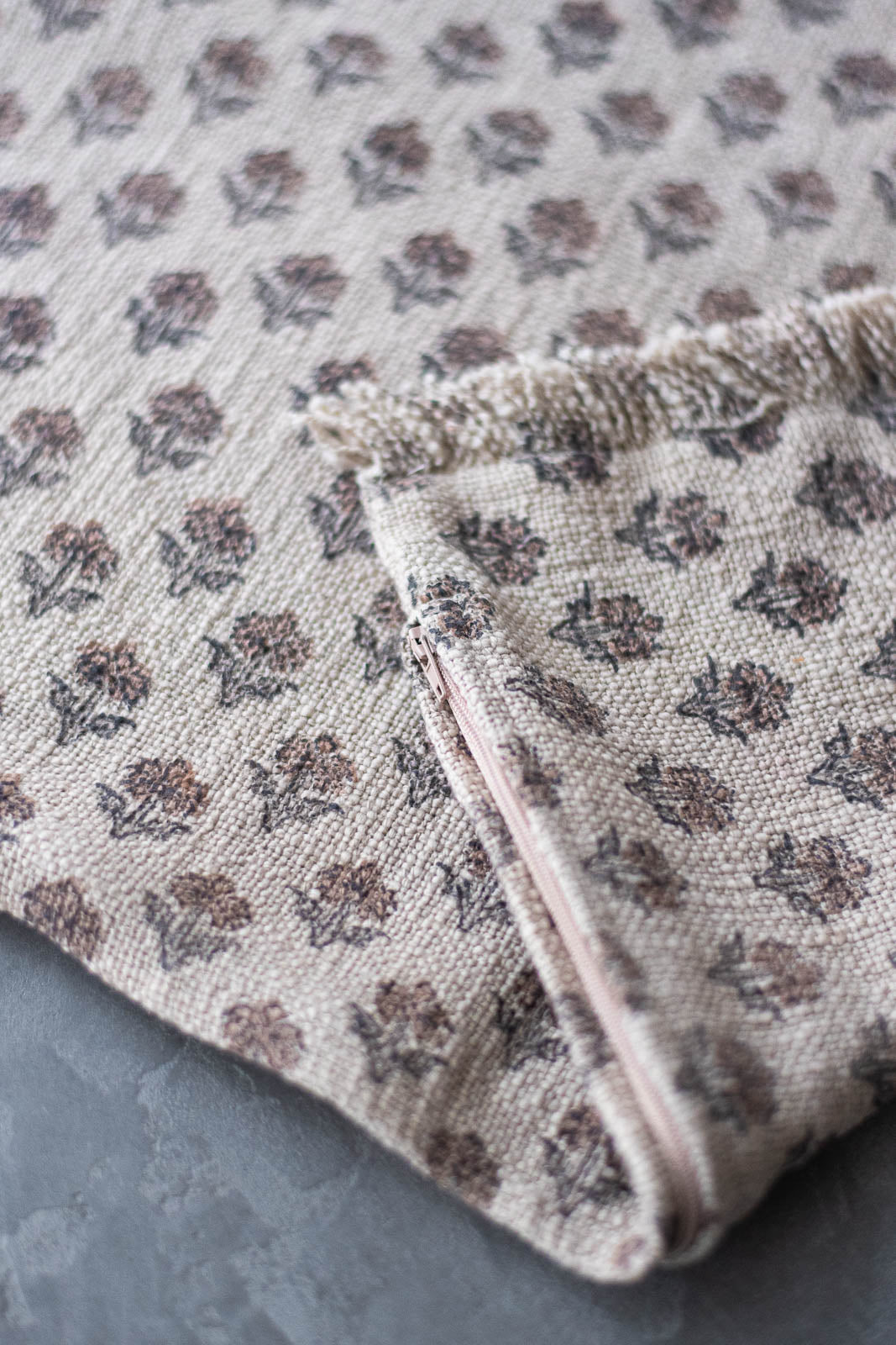 ポン、ポン、と木版を押す音が聞こえてきそうな、手しごとのぬくもりを感じるクッションカバー。