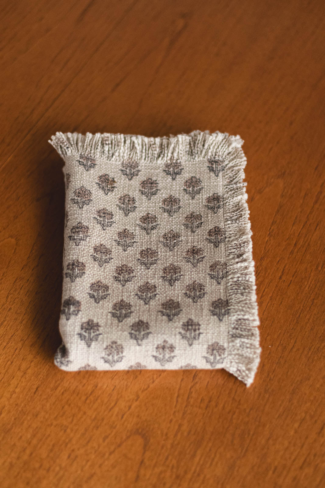 カバーに描かれた模様は、インドで古くから継承されてきた「ブロックプリント」の技法によるもの。図案ごとに彫られた手彫りの木板を使い、職人がひと押しずつ丁寧にプリントを重ねています。