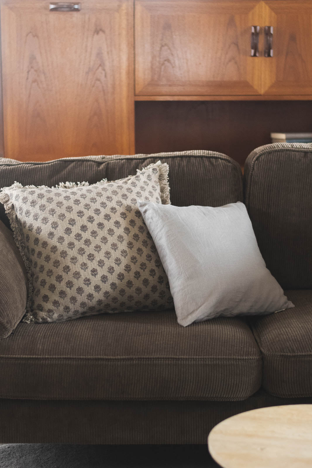 ソファやベッド、ダイニングチェアなど、さまざまなシーンで取り入れやすい大きさです。ひとつ加えるだけで空間のアクセントになり、手仕事ならではの温もりとコットンのやさしさが、空間に落ち着いた上品さをもたらします。