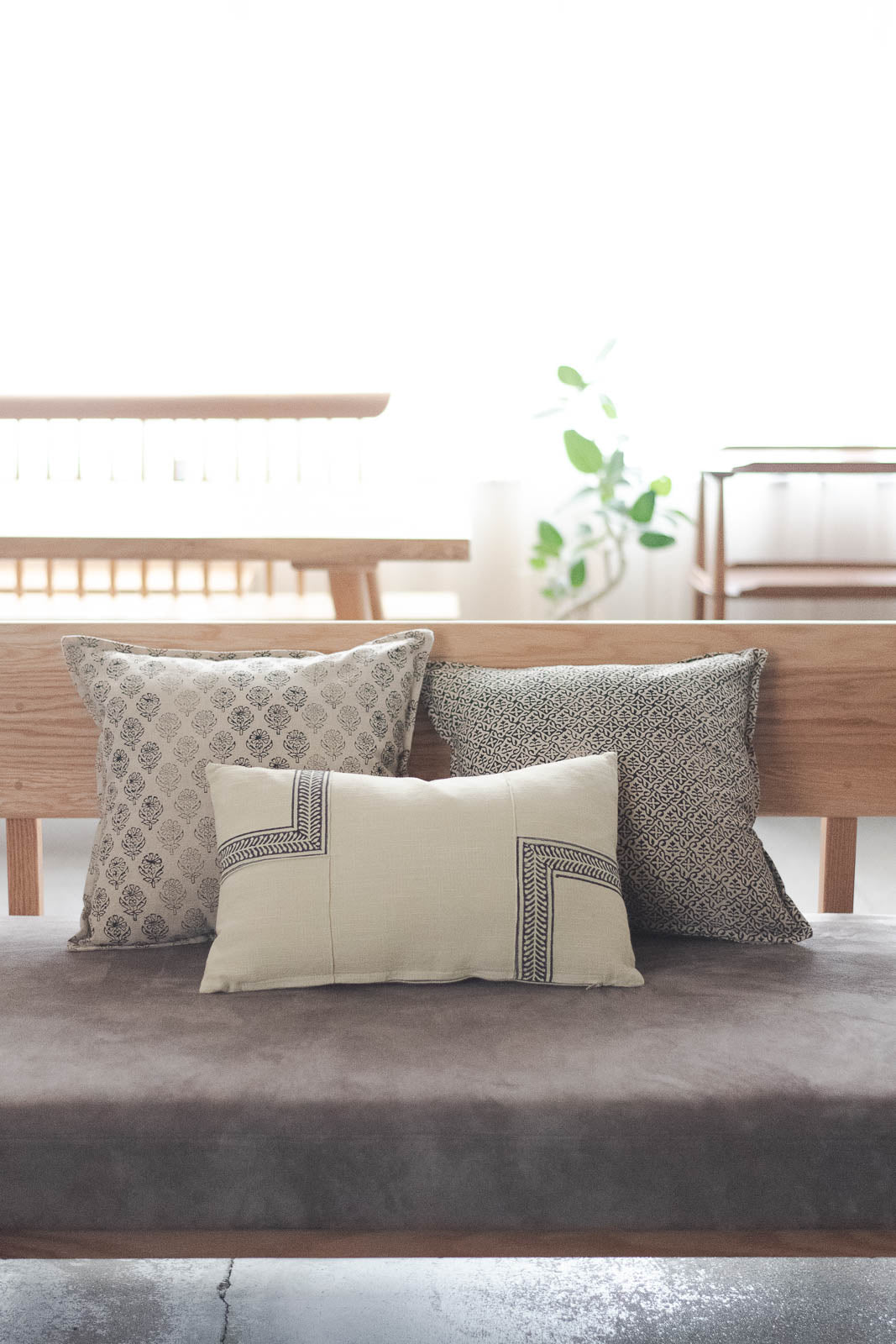 そんなブロックプリント生地で仕立てたクッションカバーは、お気に入りをひとつ選ぶのも、いくつか並べて楽しむのもおすすめ。