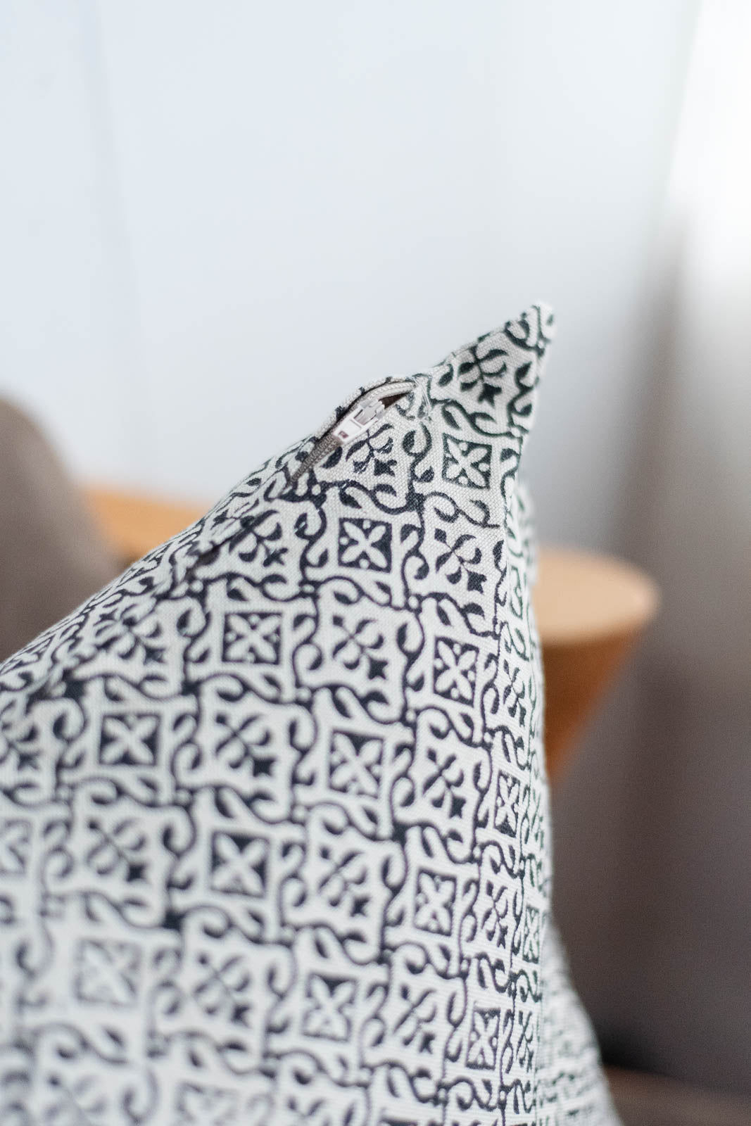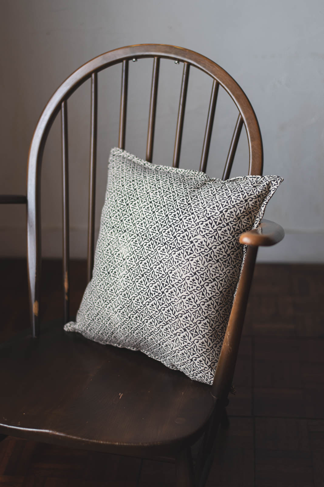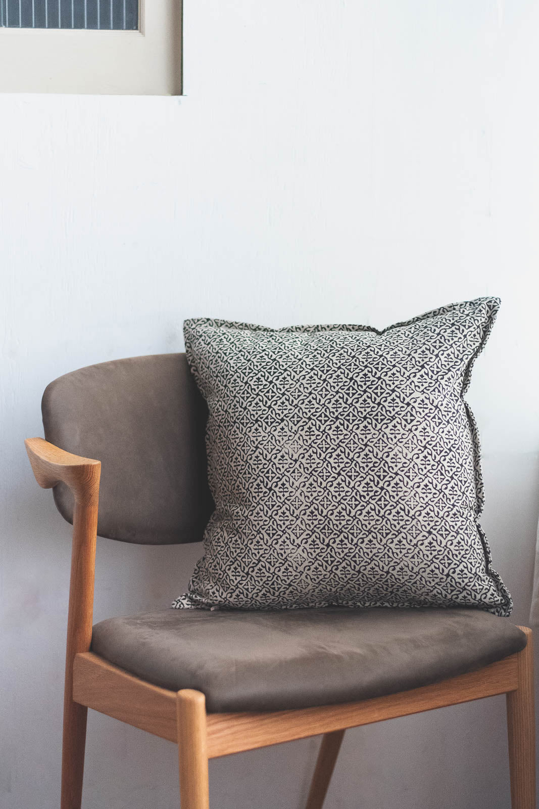 ポン、ポン、と木版を押す音が聞こえてきそうな、手しごとのぬくもりを感じるクッションカバー。