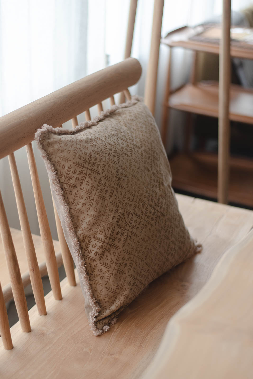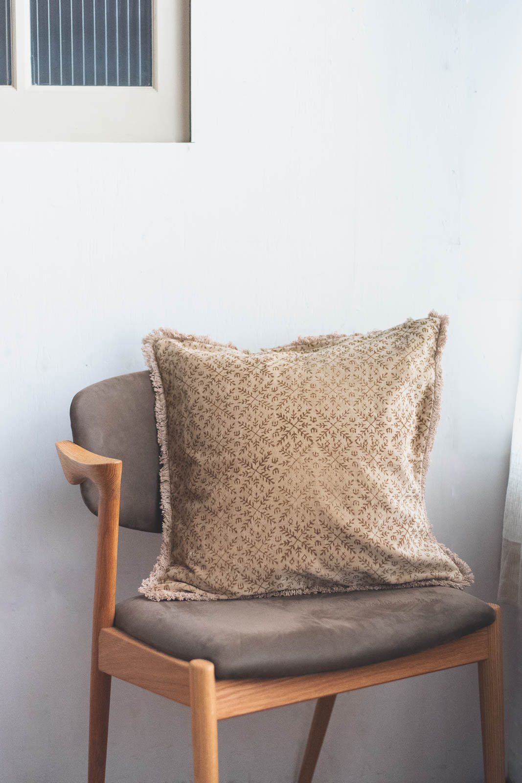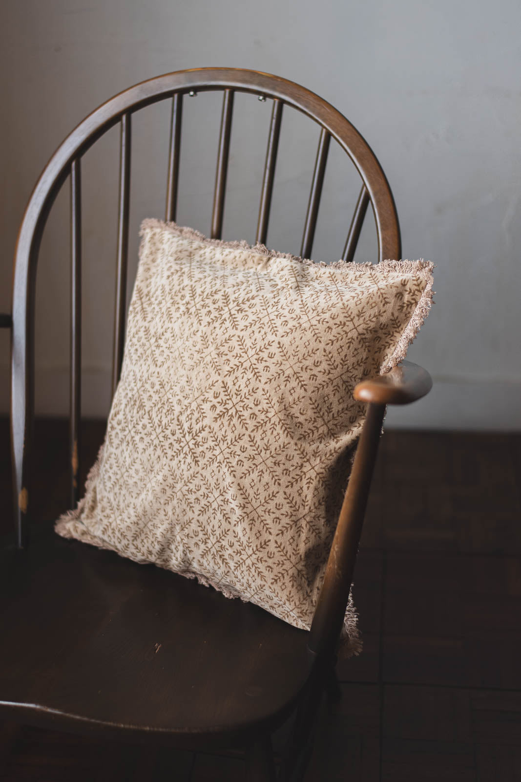 ポン、ポン、と木版を押す音が聞こえてきそうな、手しごとのぬくもりを感じるクッションカバー。