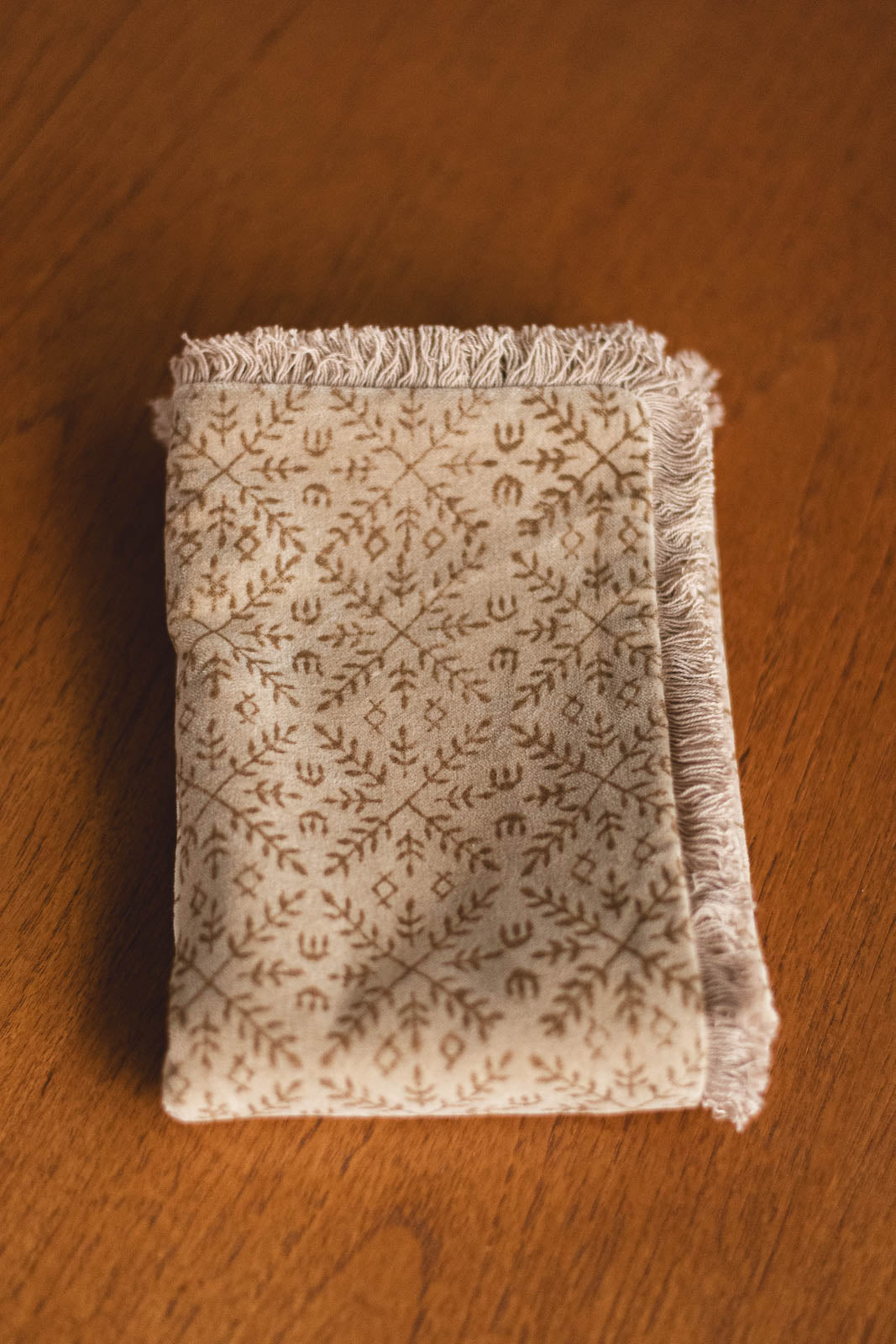 やわらかなベージュの生地に、温もりあるブラウンの模様がプリントされ、控えめながらも印象に残る絶妙なバランスのデザインです。