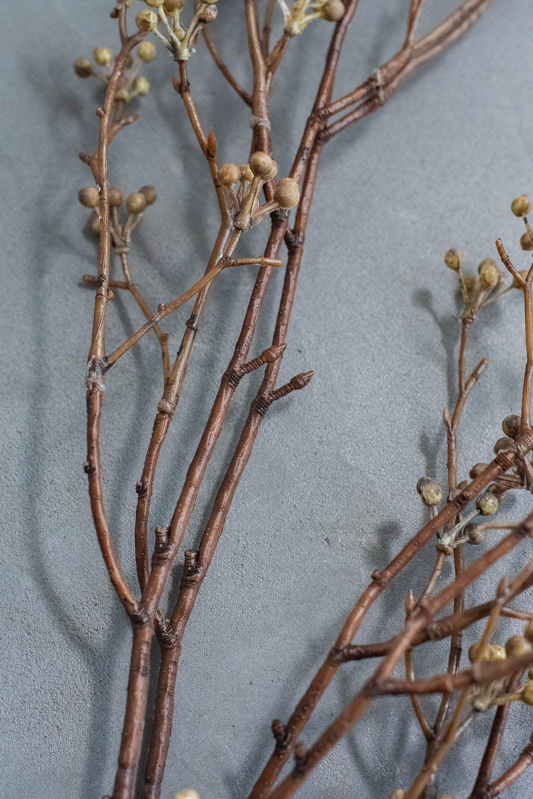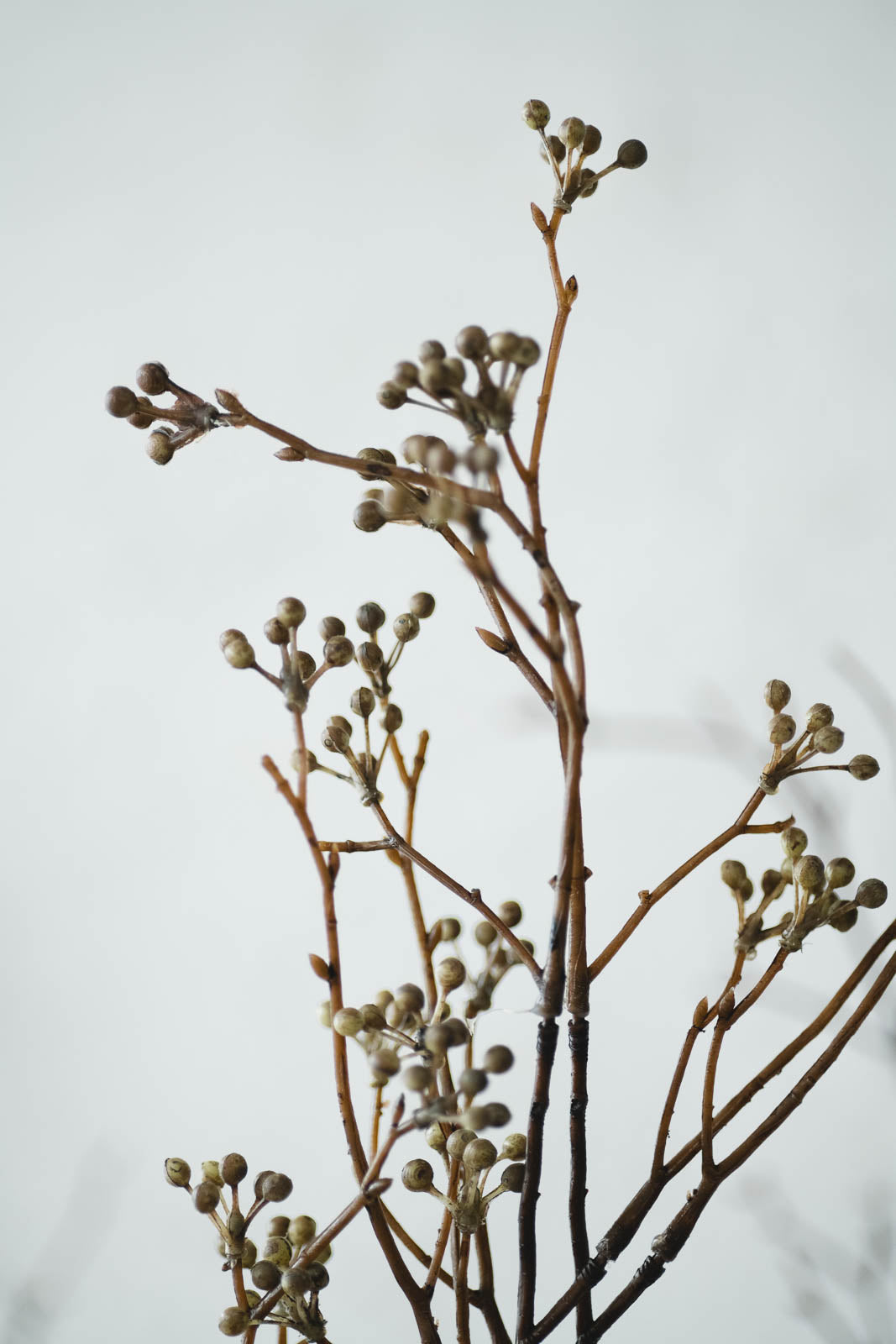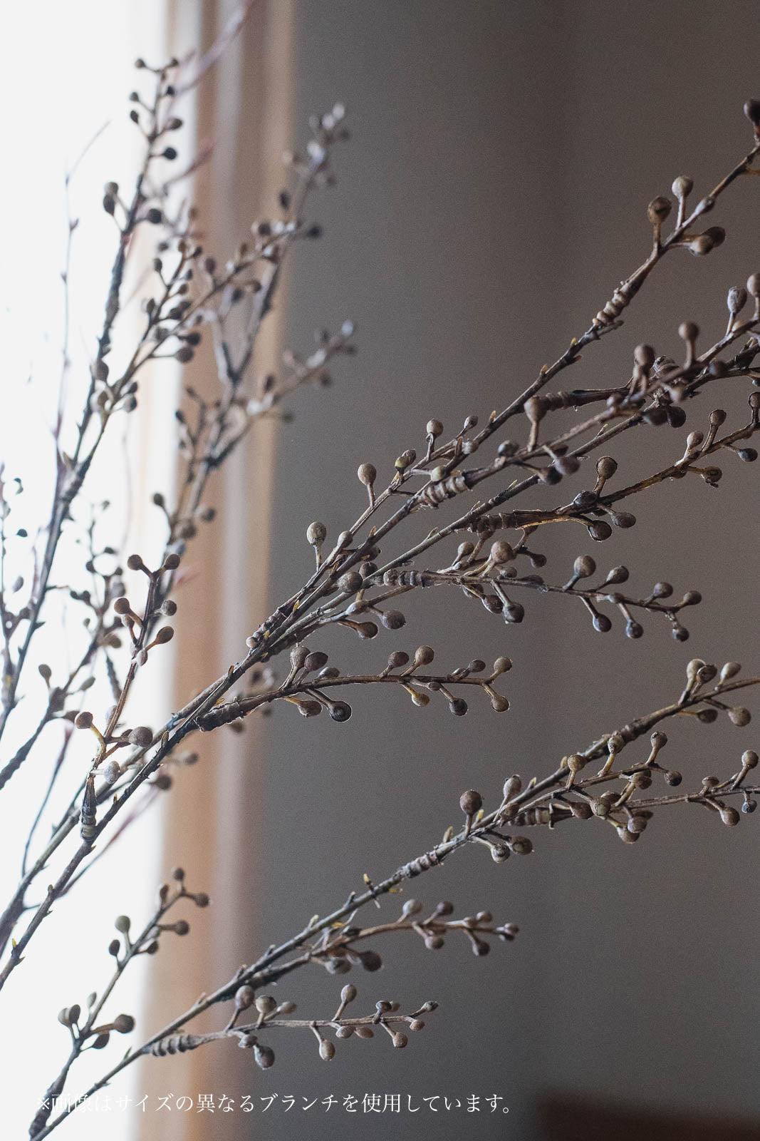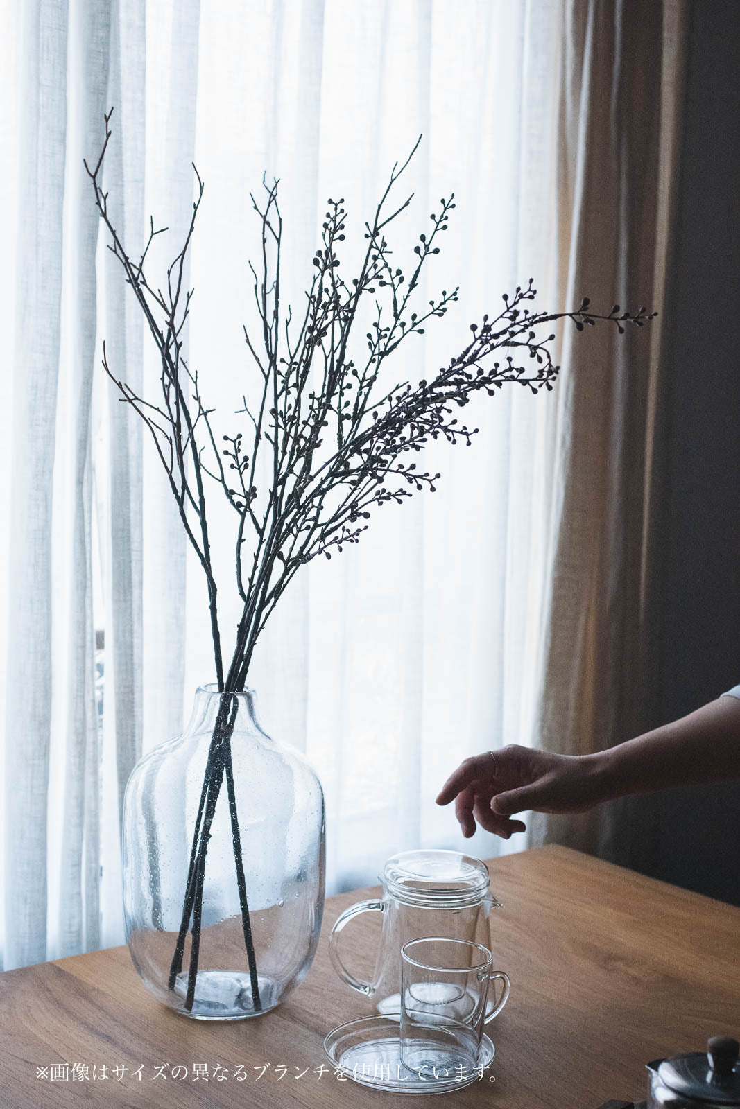 繊細な枝ぶりと控えめな実の彩りが、季節を問わず落ち着いた空間演出に最適。夏の涼やかなディスプレイや、冬にはオーナメントとのコーディネートもおすすめです。