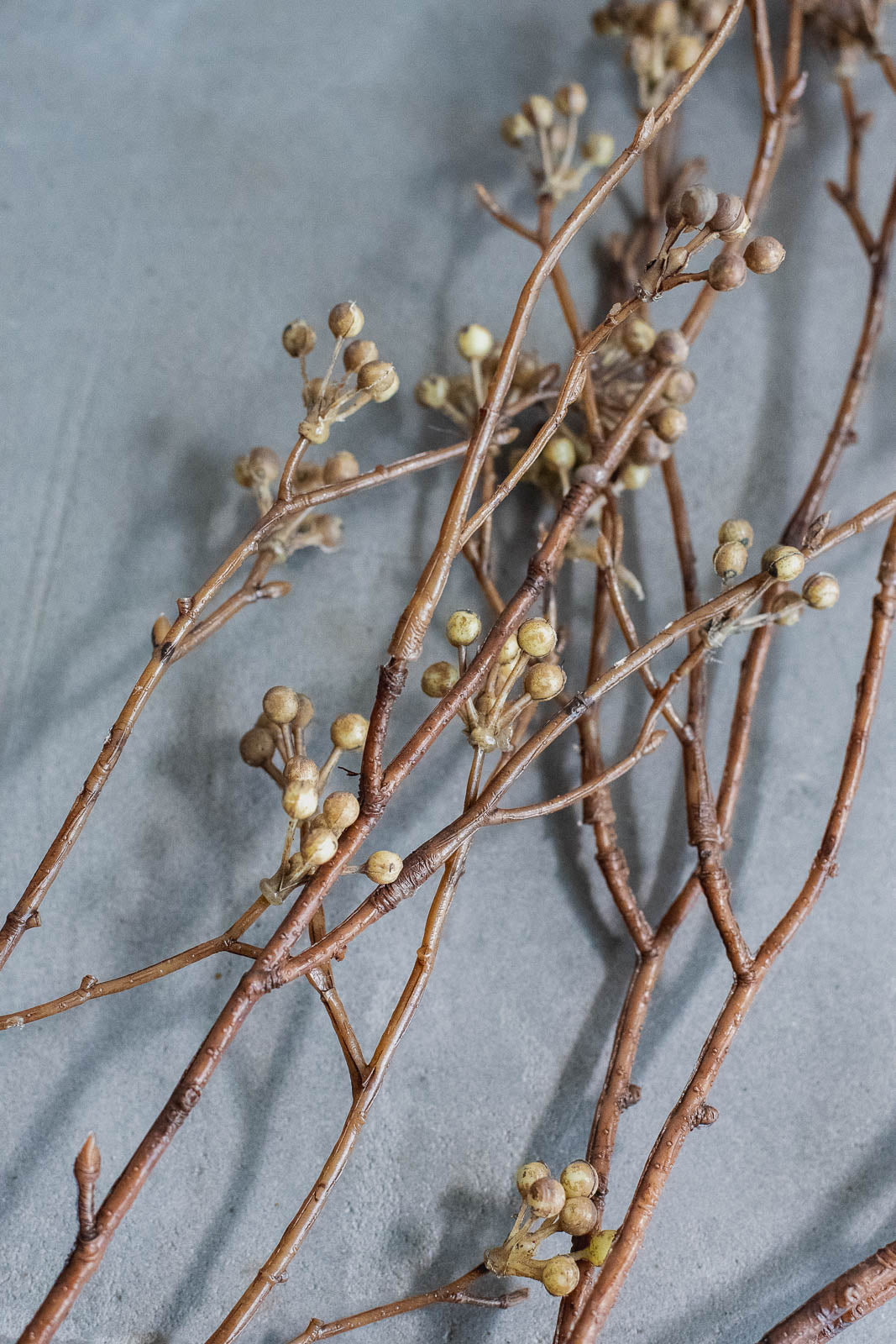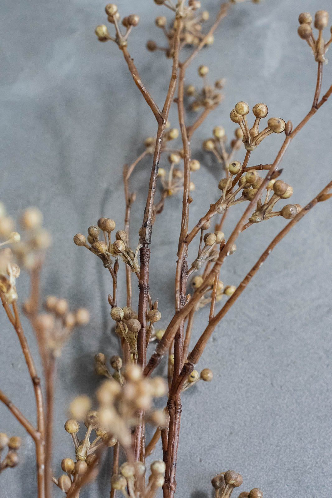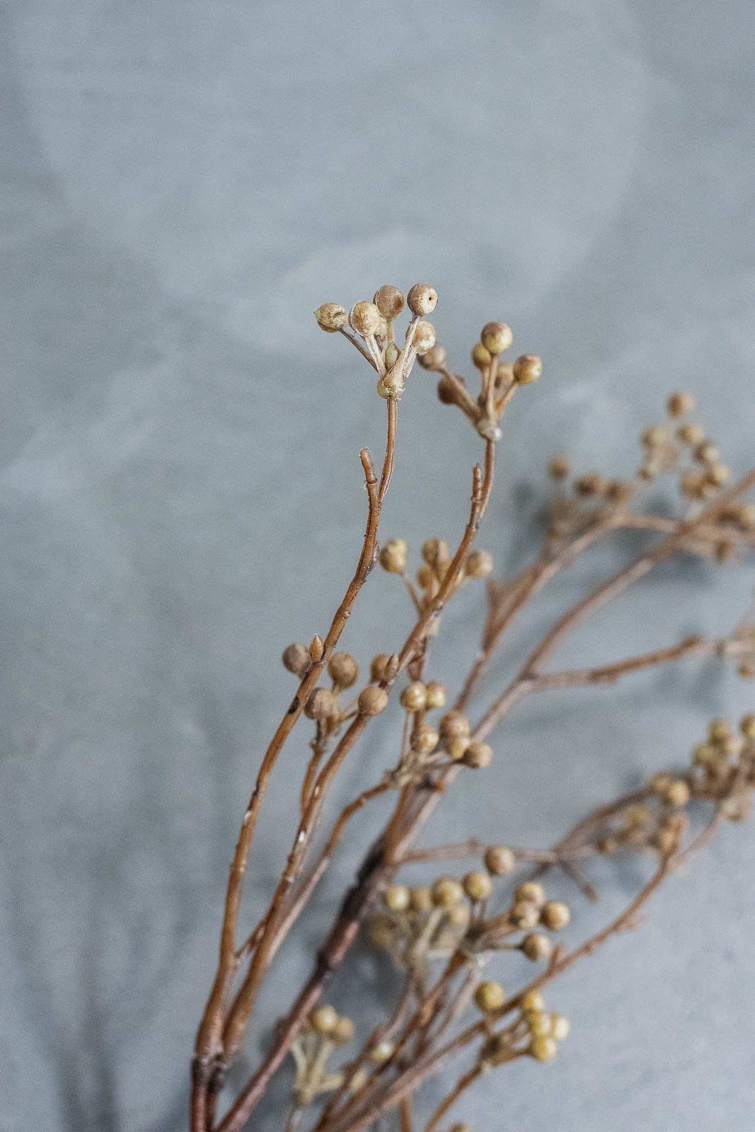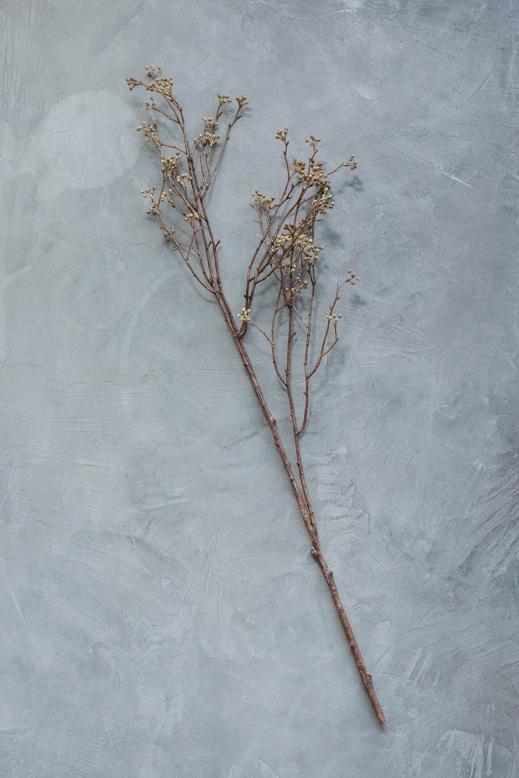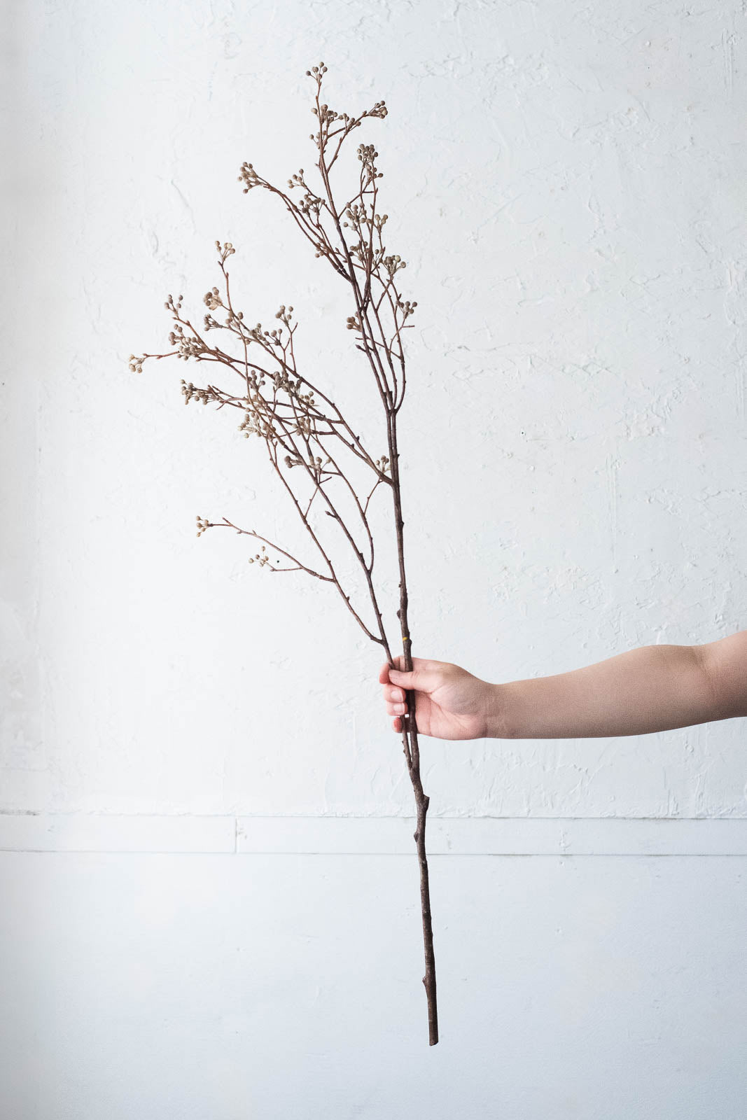 繊細な枝ぶりと控えめな実の彩りが、季節を問わず落ち着いた空間演出に最適。夏の涼やかなディスプレイや、冬にはオーナメントとのコーディネートもおすすめです。