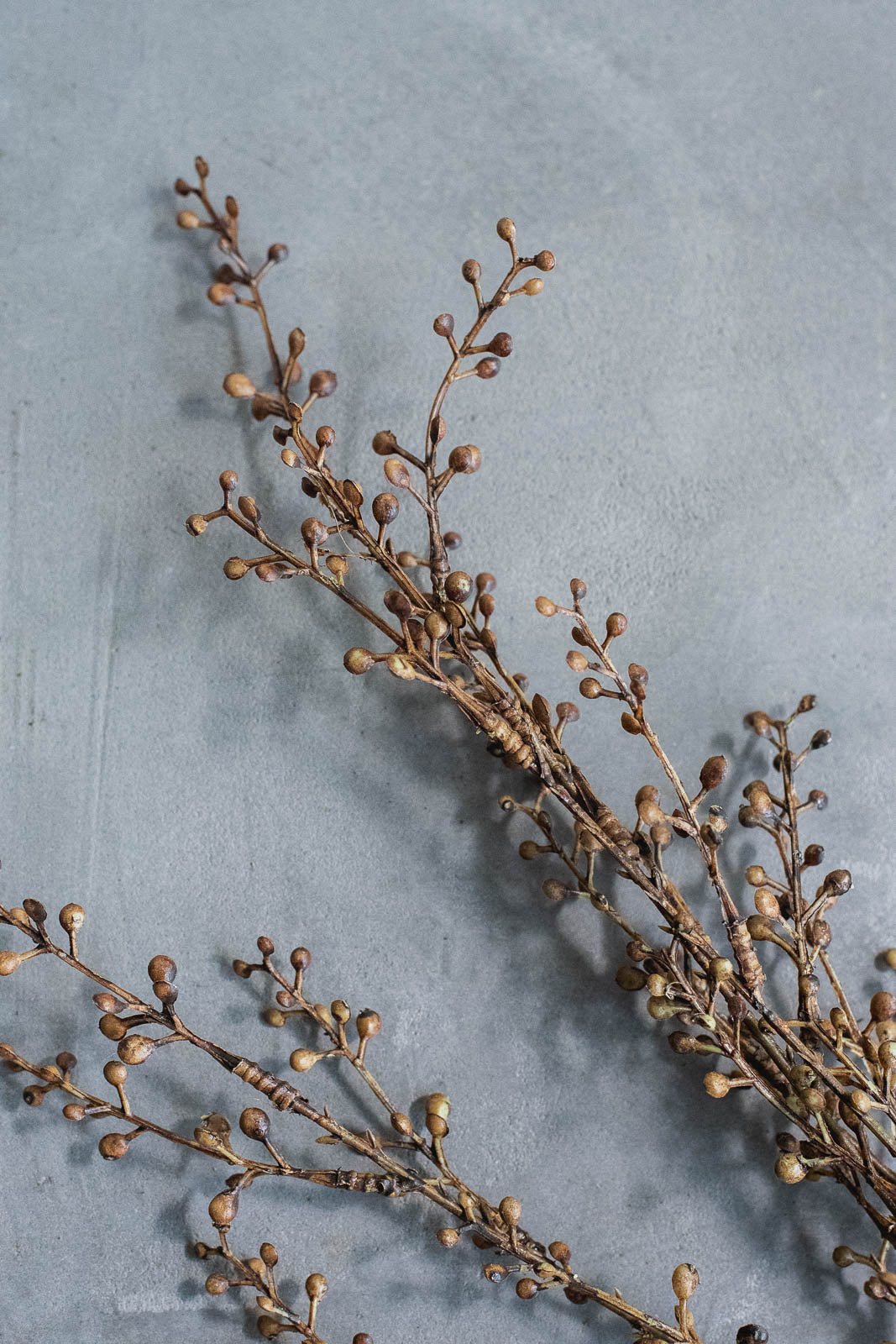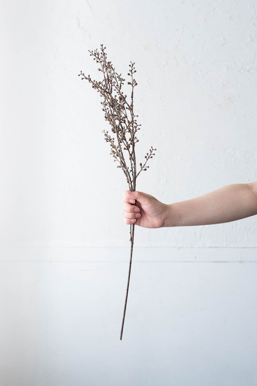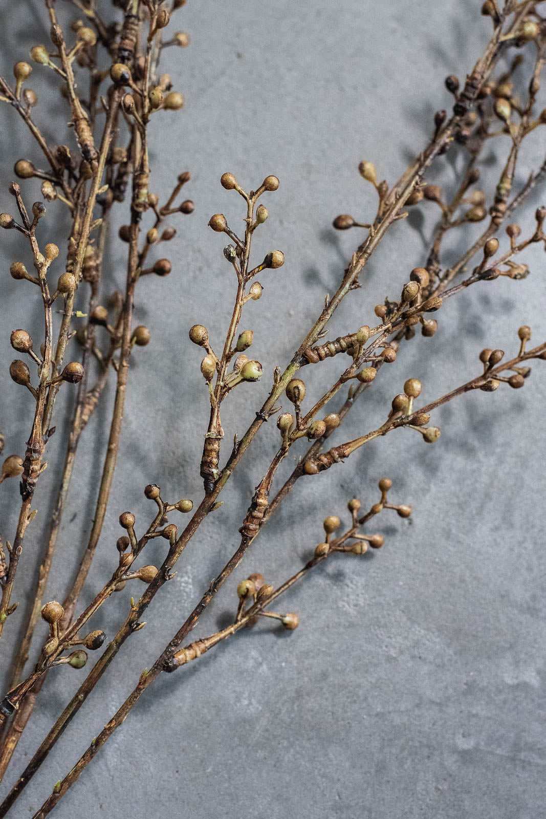 繊細な枝ぶりと控えめな実の彩りが、季節を問わず落ち着いた空間演出に最適。夏の涼やかなディスプレイや、冬にはオーナメントとのコーディネートもおすすめです。