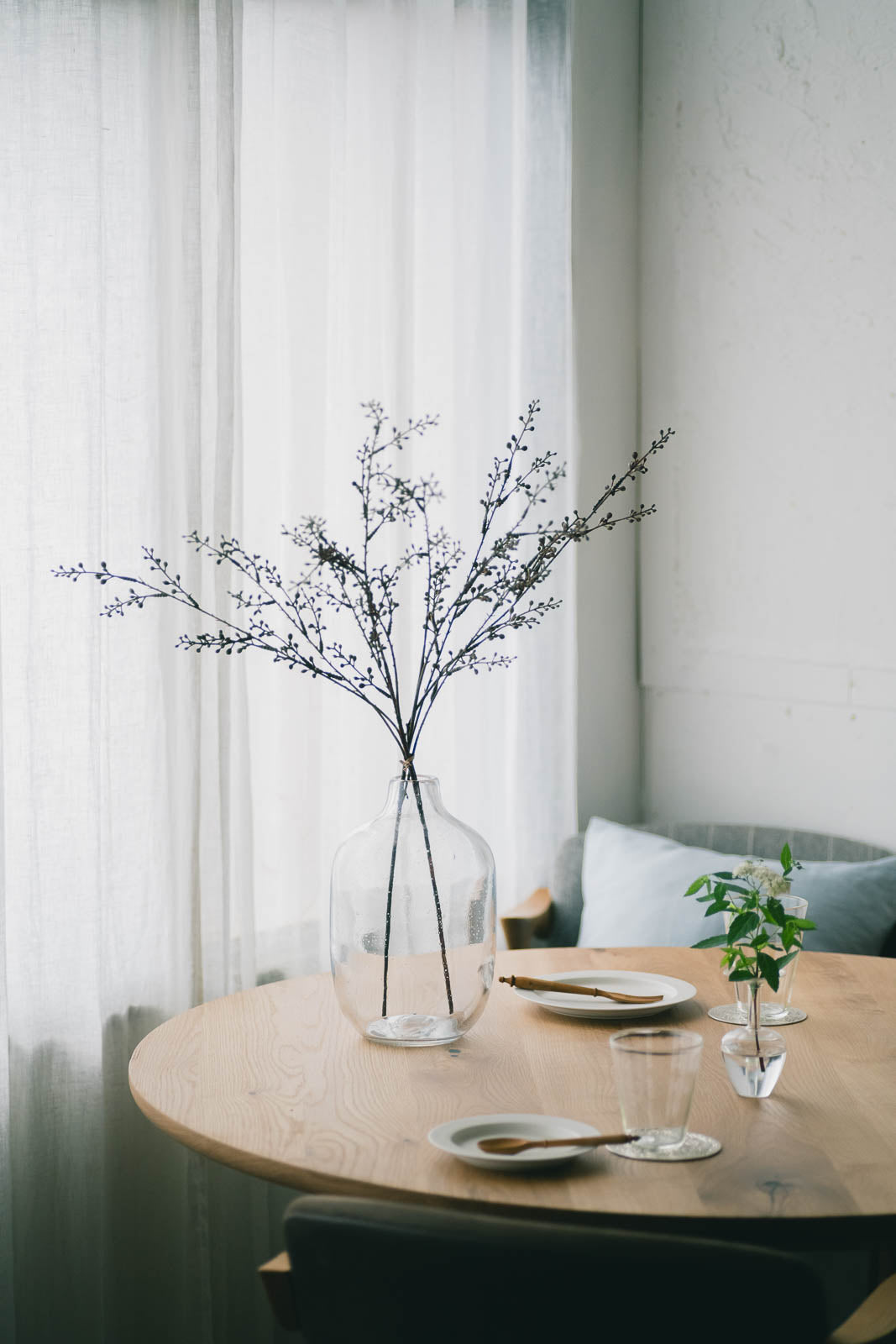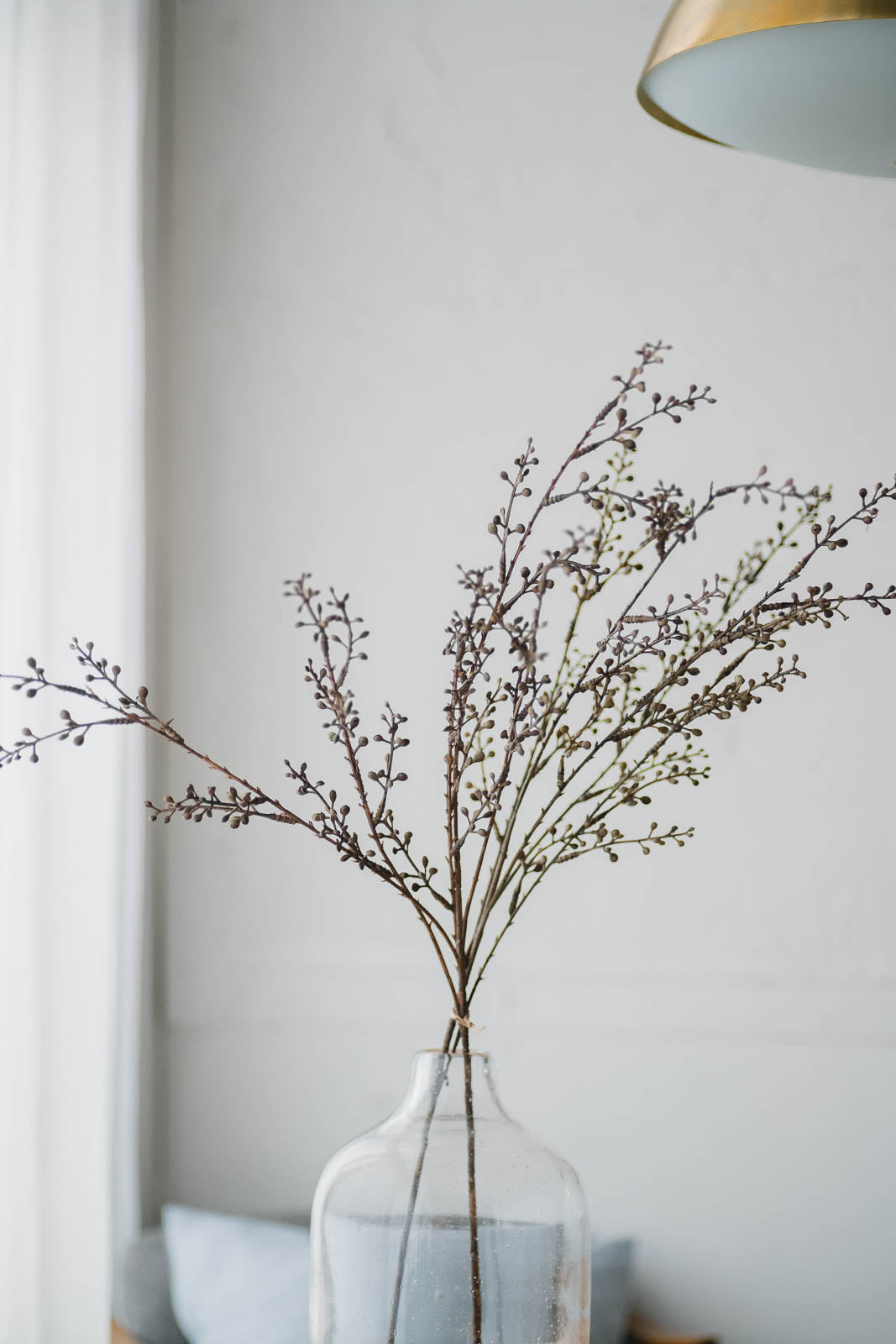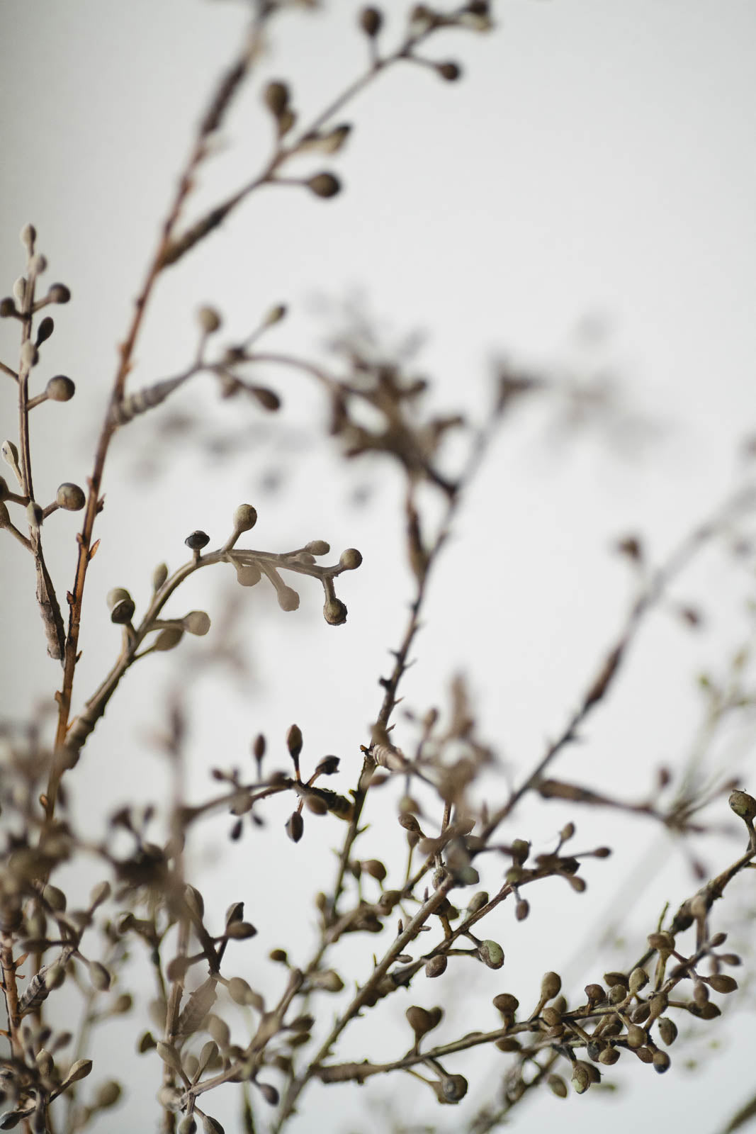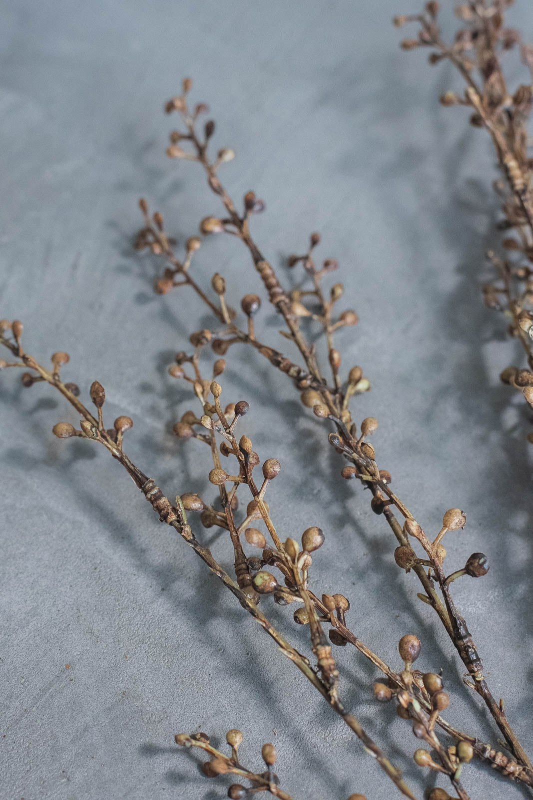 繊細な枝ぶりと控えめな実の彩りが、季節を問わず落ち着いた空間演出に最適。夏の涼やかなディスプレイや、冬にはオーナメントとのコーディネートもおすすめです。