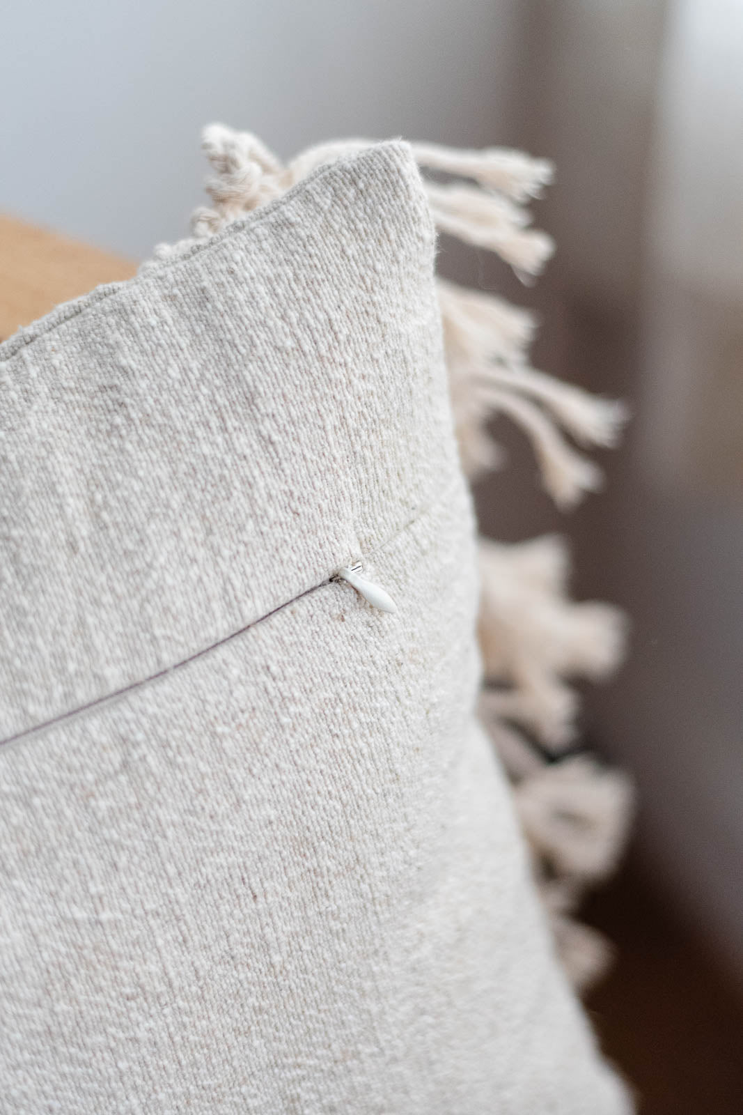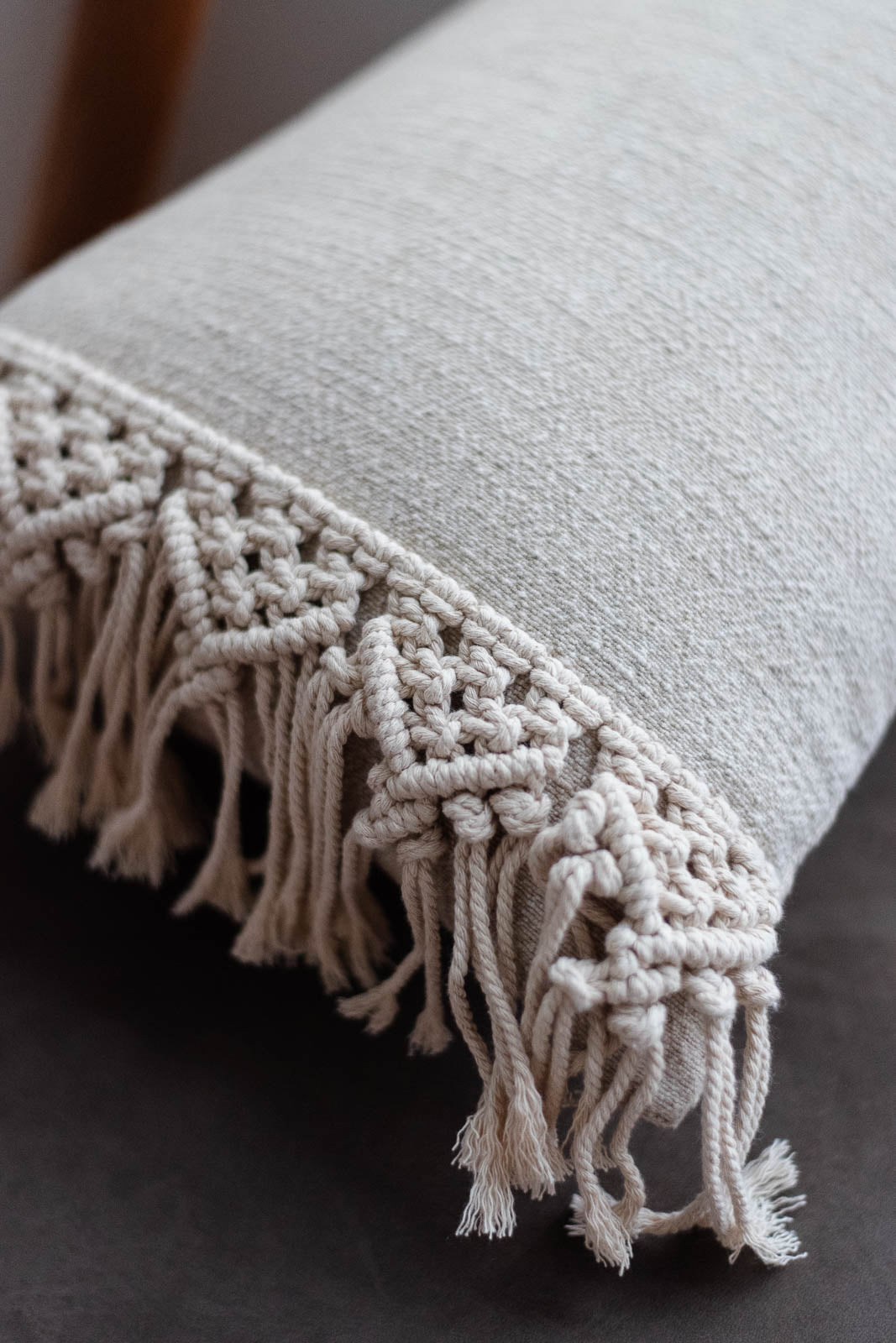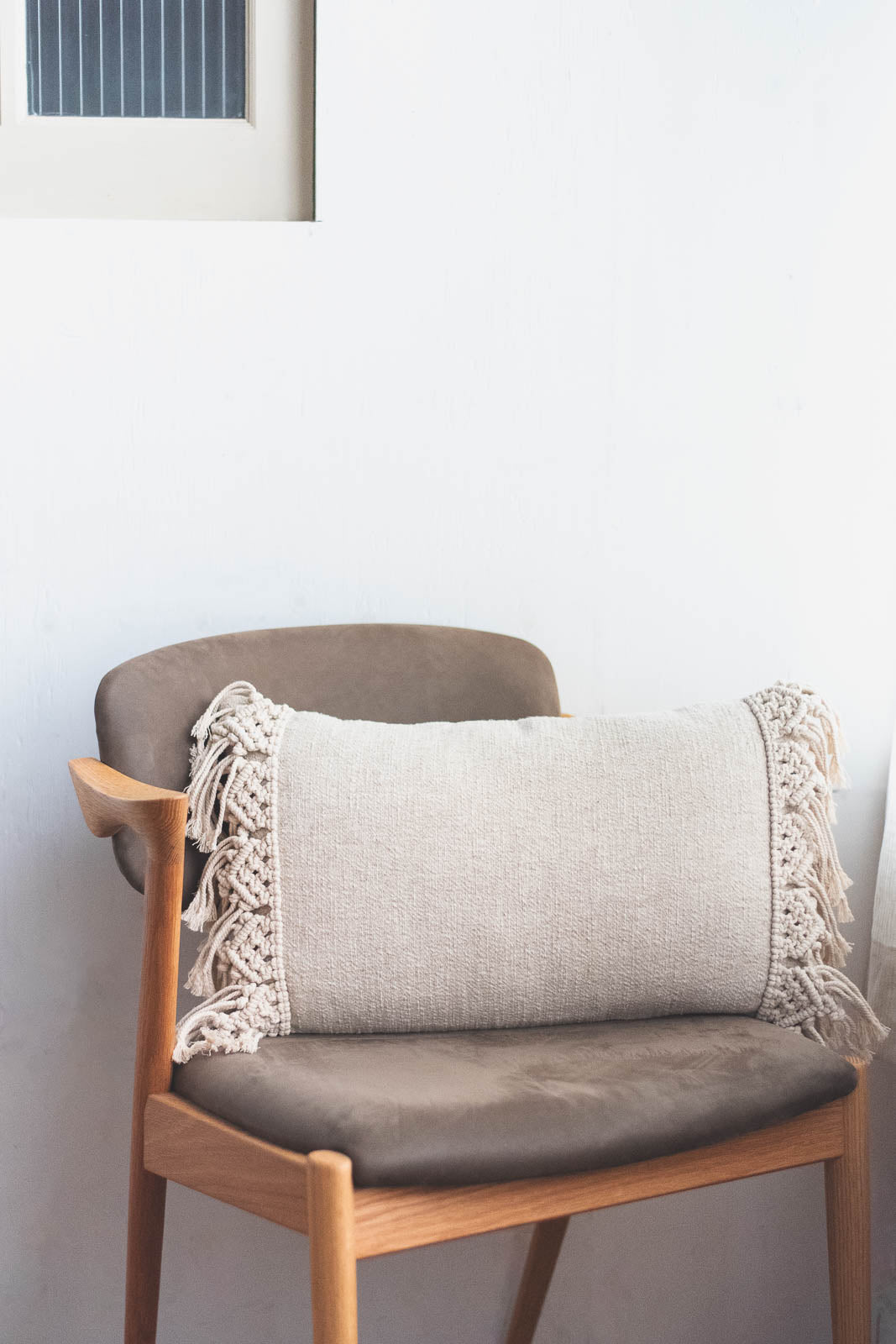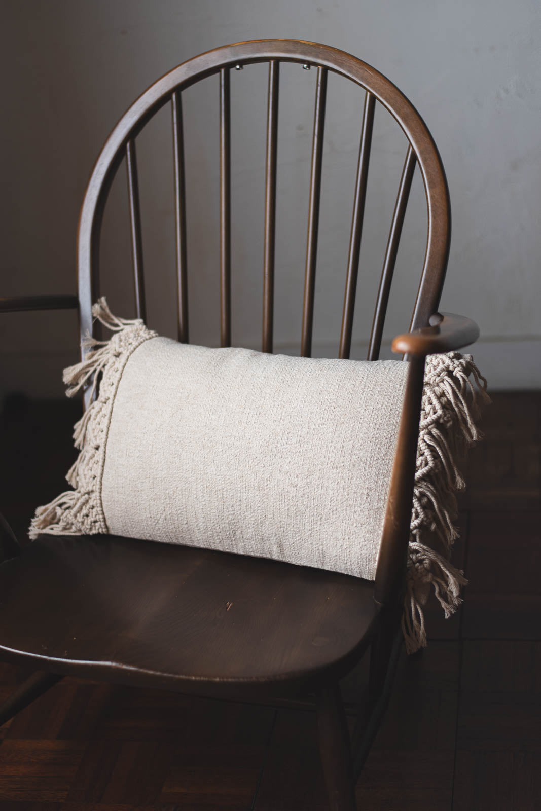 両側面に大胆にあしらわれたマクラメ編みが目を引く、やわらかな表情のクッションピロー。立体的な編み模様が、空間に素材の豊かさと手仕事の温もりを添えます。