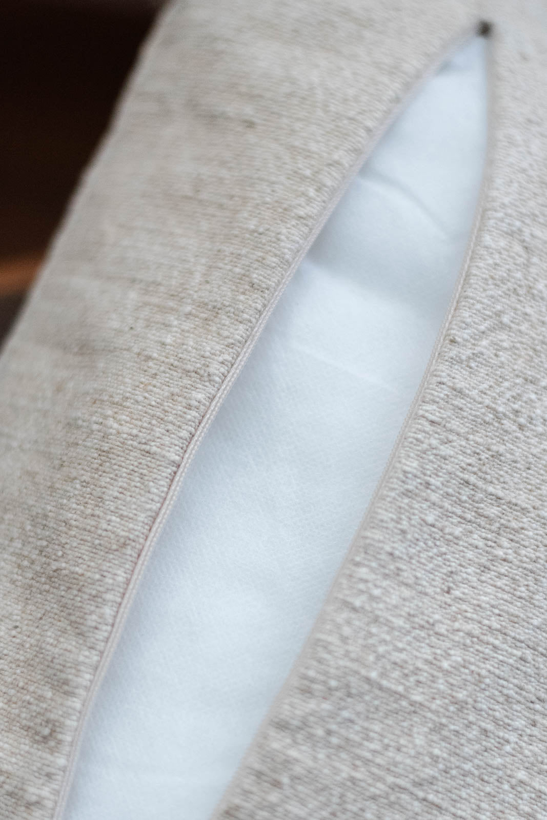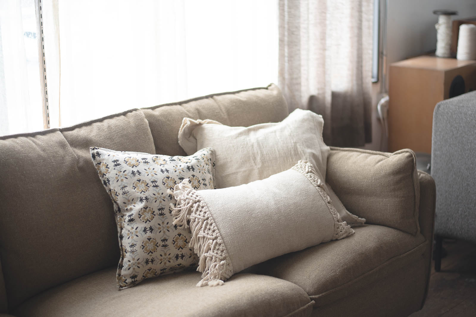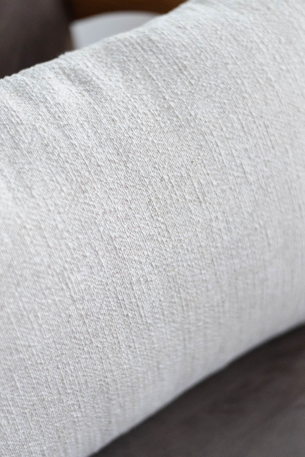 カバー素材は、リネンのシャリ感、コットンのやさしさ、ポリエステルの軽やかさをバランスよくミックス。形崩れしにくく、扱いやすさと素朴な風合いを兼ね備えています。
