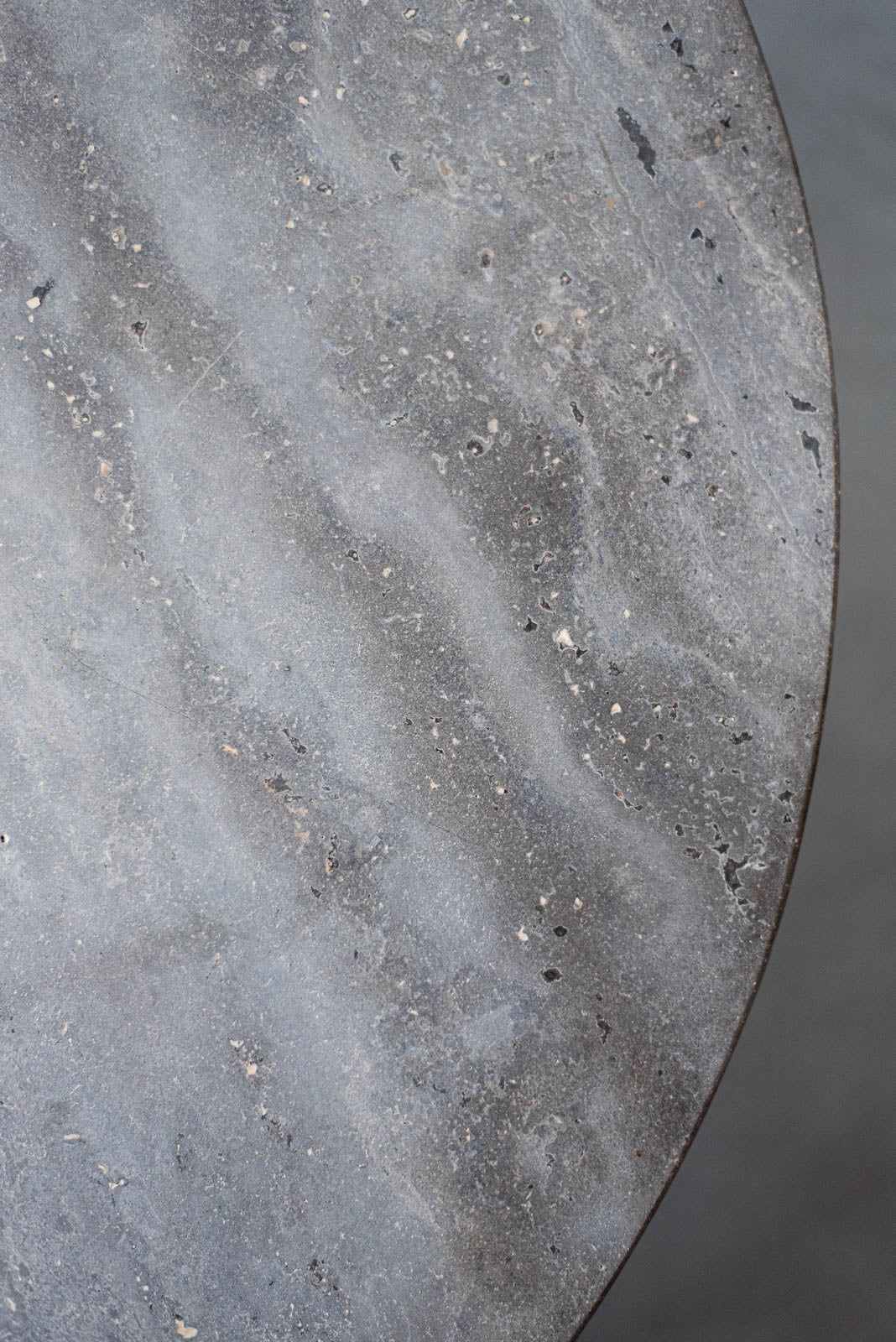 緩やかにすぼまる円錐形のベースが、重厚な石の天板を軽やかに支え、空間に凛とした美しさをもたらします。