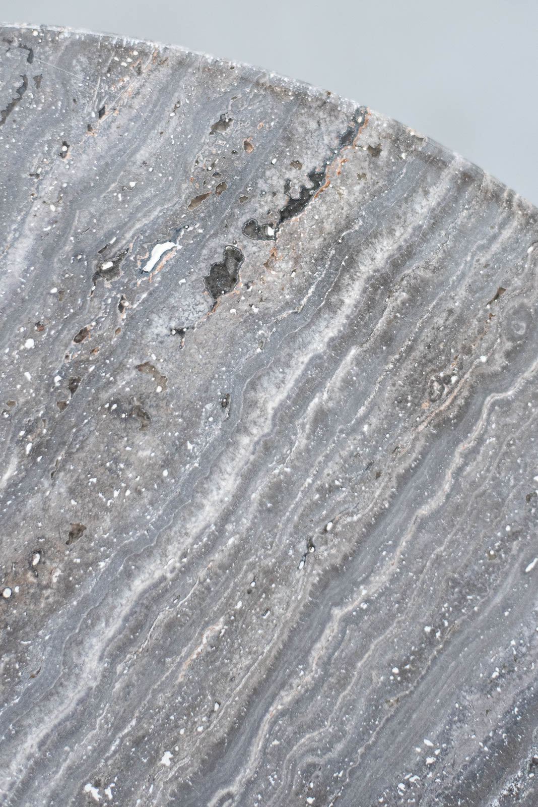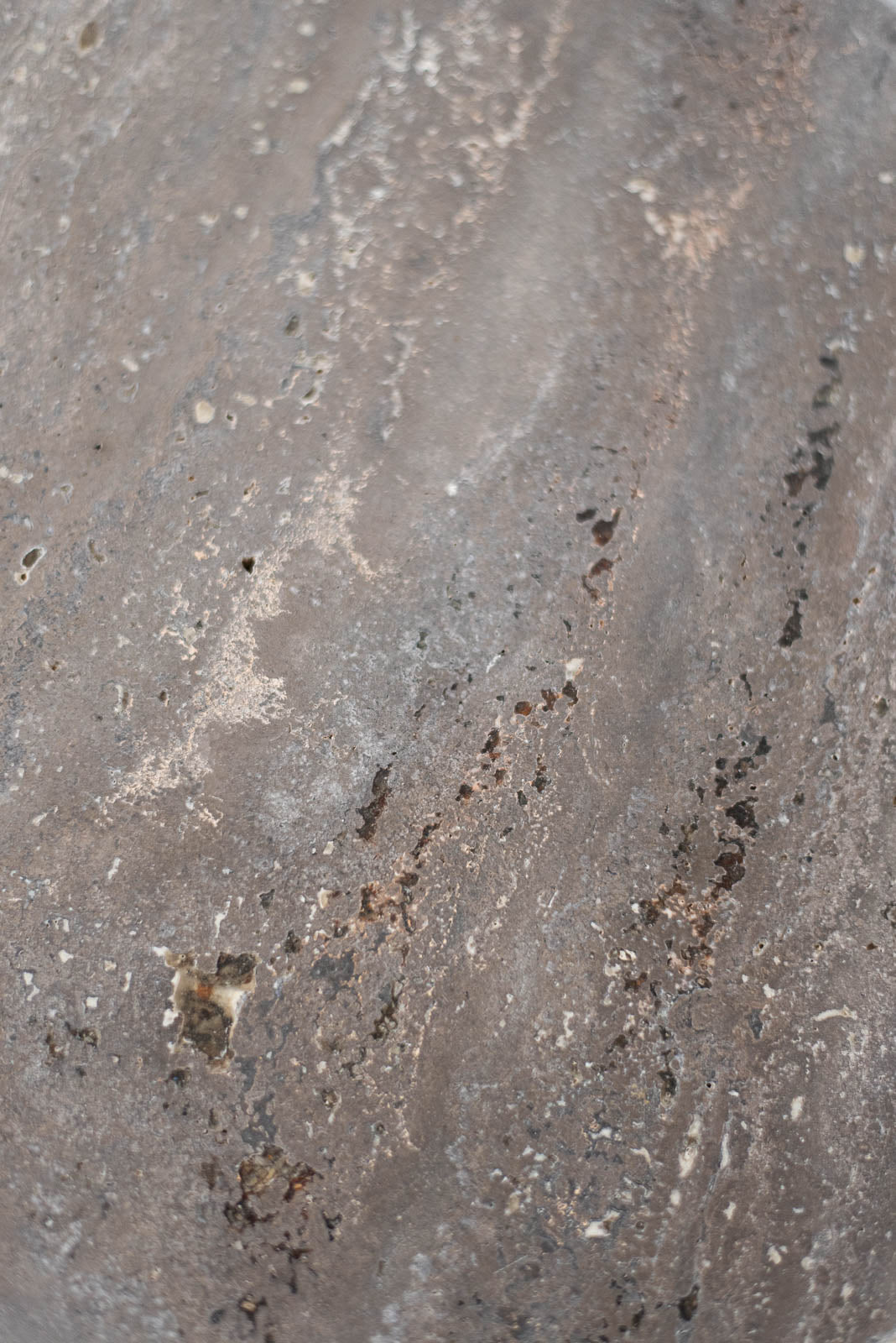 天板には、時間の層を閉じ込めたような模様が美しいグレーのトラバーチンを採用。淡くやさしい色合いと、天然石ならではの繊細な質感が光の角度によって多彩な表情を見せます。自然が刻んだ表情が、一つとして同じもののない個性を生み出します。