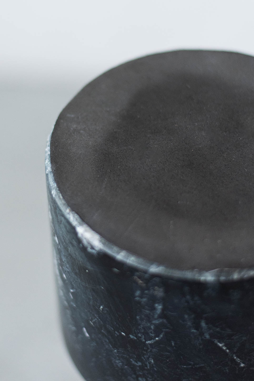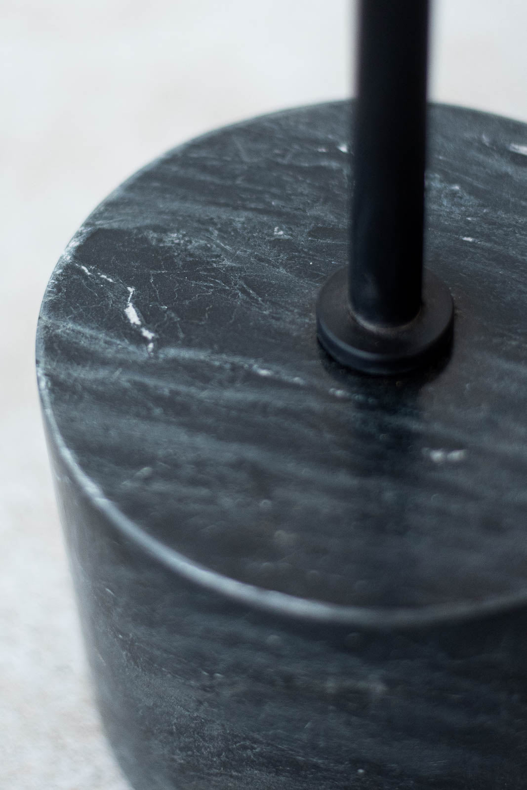 ベースには、時間の層を閉じ込めたような模様が魅力のグレーの大理石を採用。落ち着きのある深い色合いと、天然石ならではの繊細な質感が調和しています。天板と支柱の軽やかな印象に、ベースが安定感を与え、全体のフォルムに落ち着いたバランスを生み出しています。