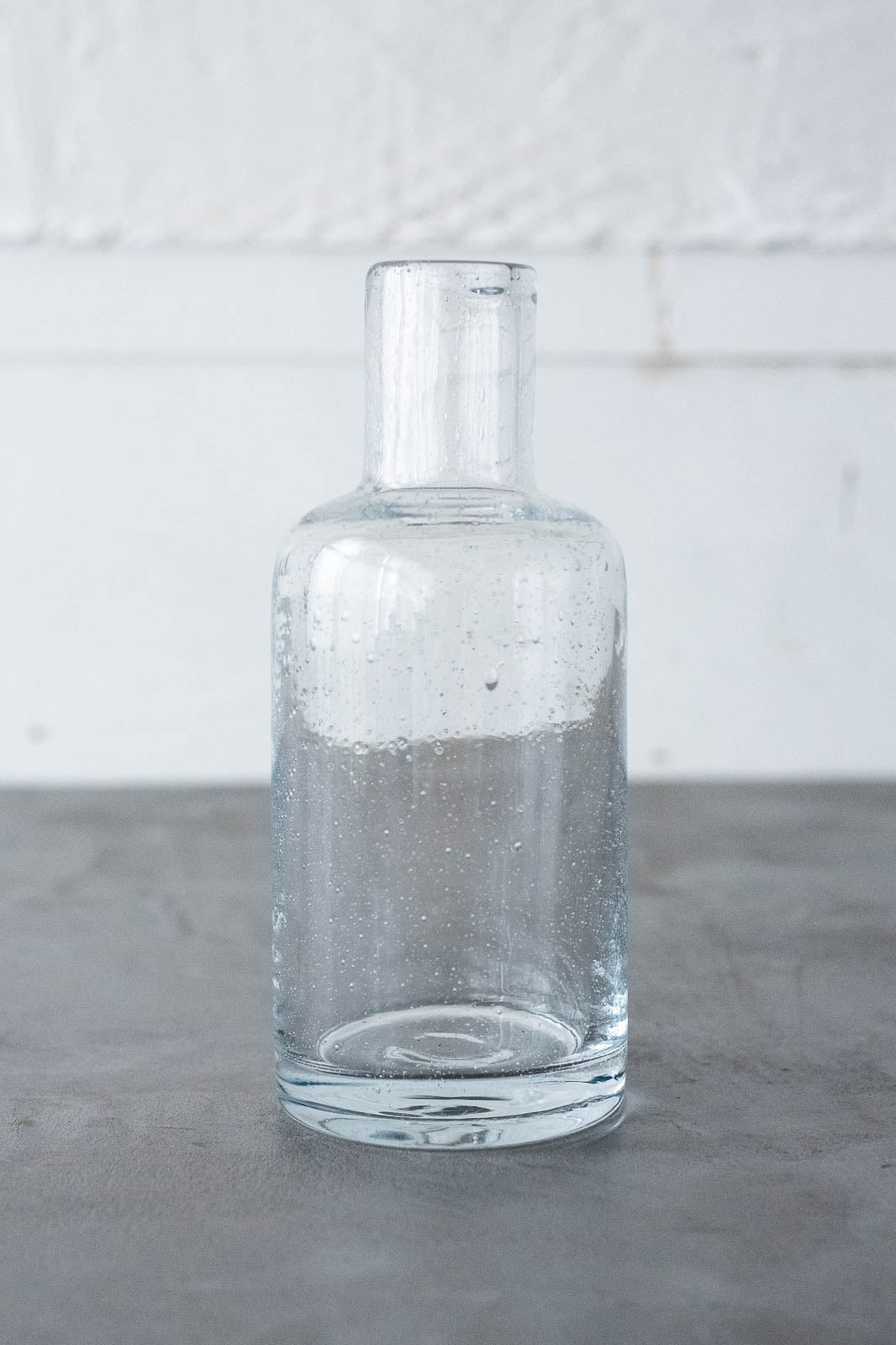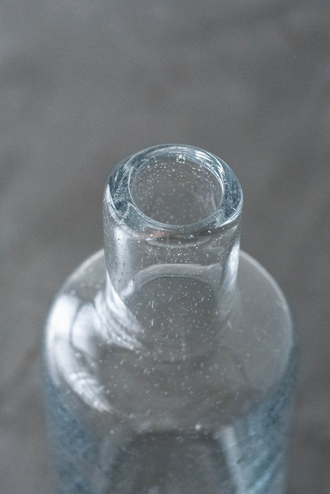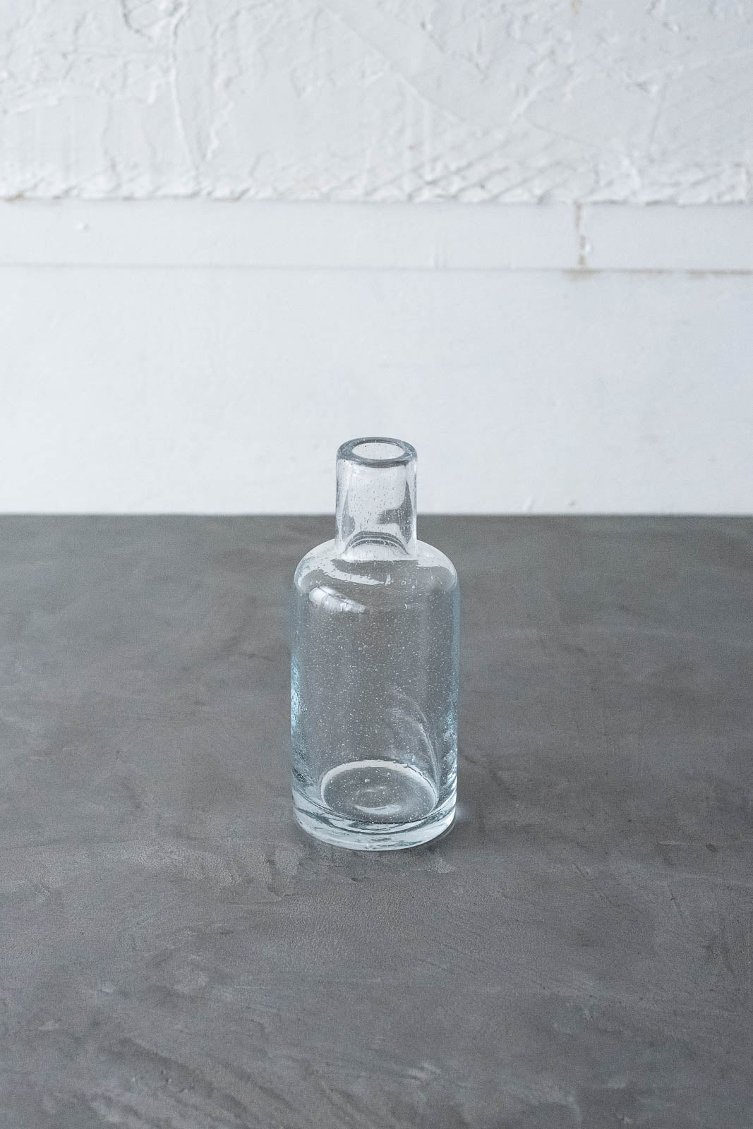 クリアで優しいフォルムには、職人の温もりある手仕事がそっと息づいています。ガラスに浮かぶ気泡は、軽やかさと遊び心、そしてどこか静かな動きを感じさせてくれます。水を入れて光の差し込む場所に置くと、気泡が光をまとい穏やかな輝きを放ちます。