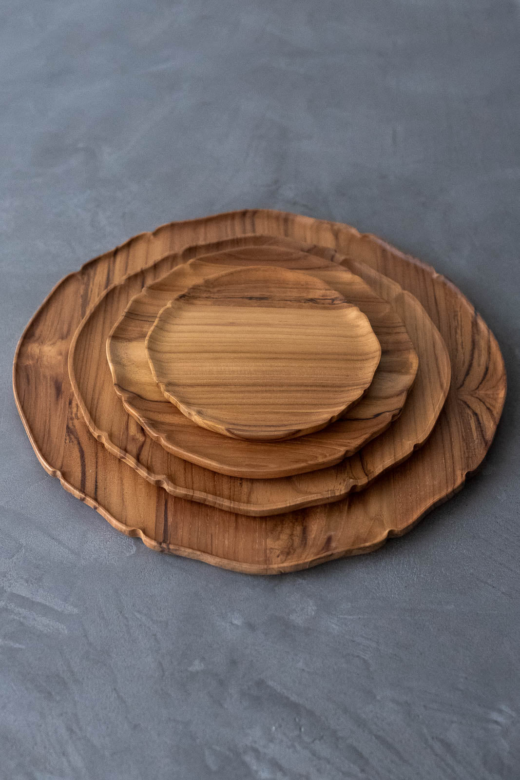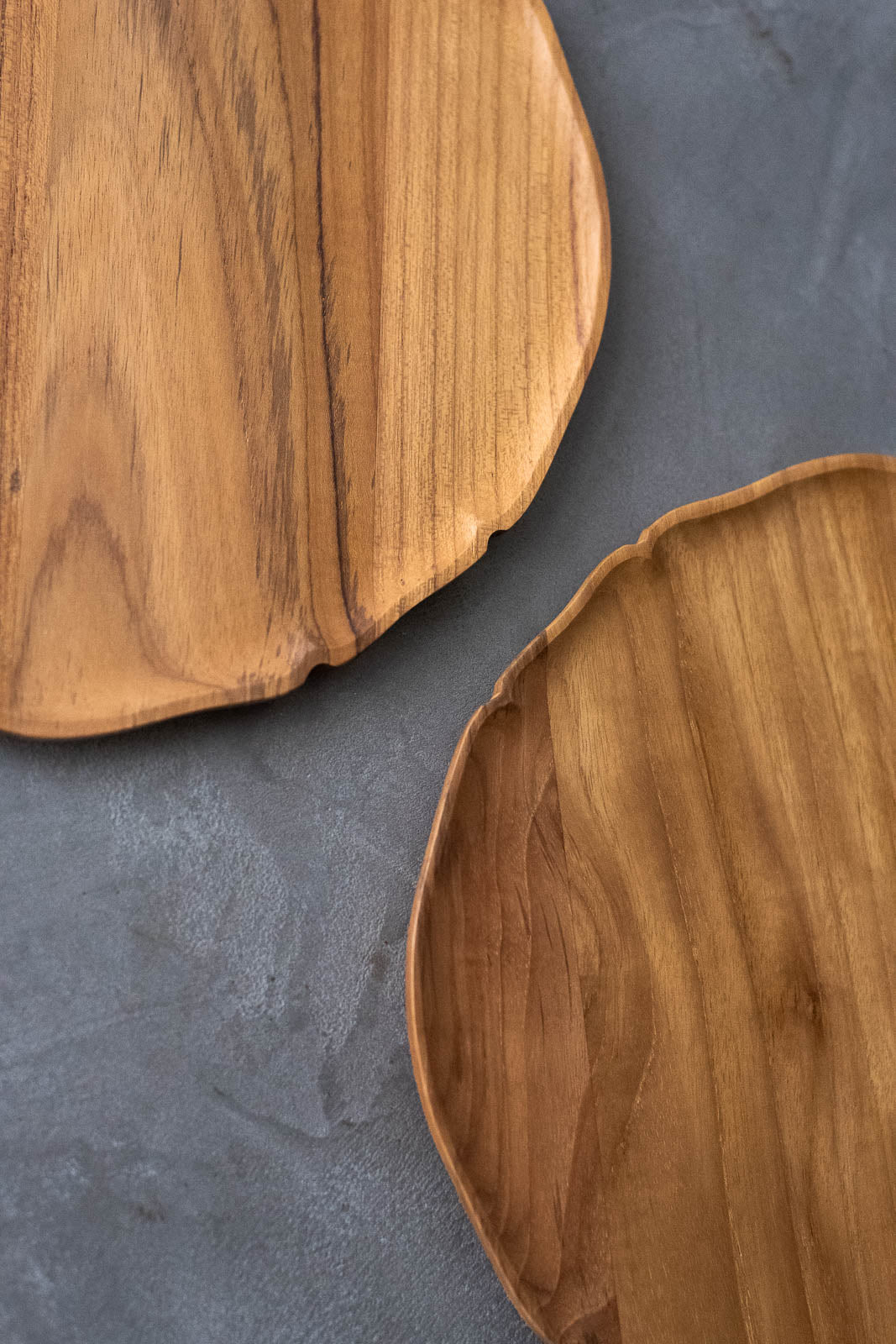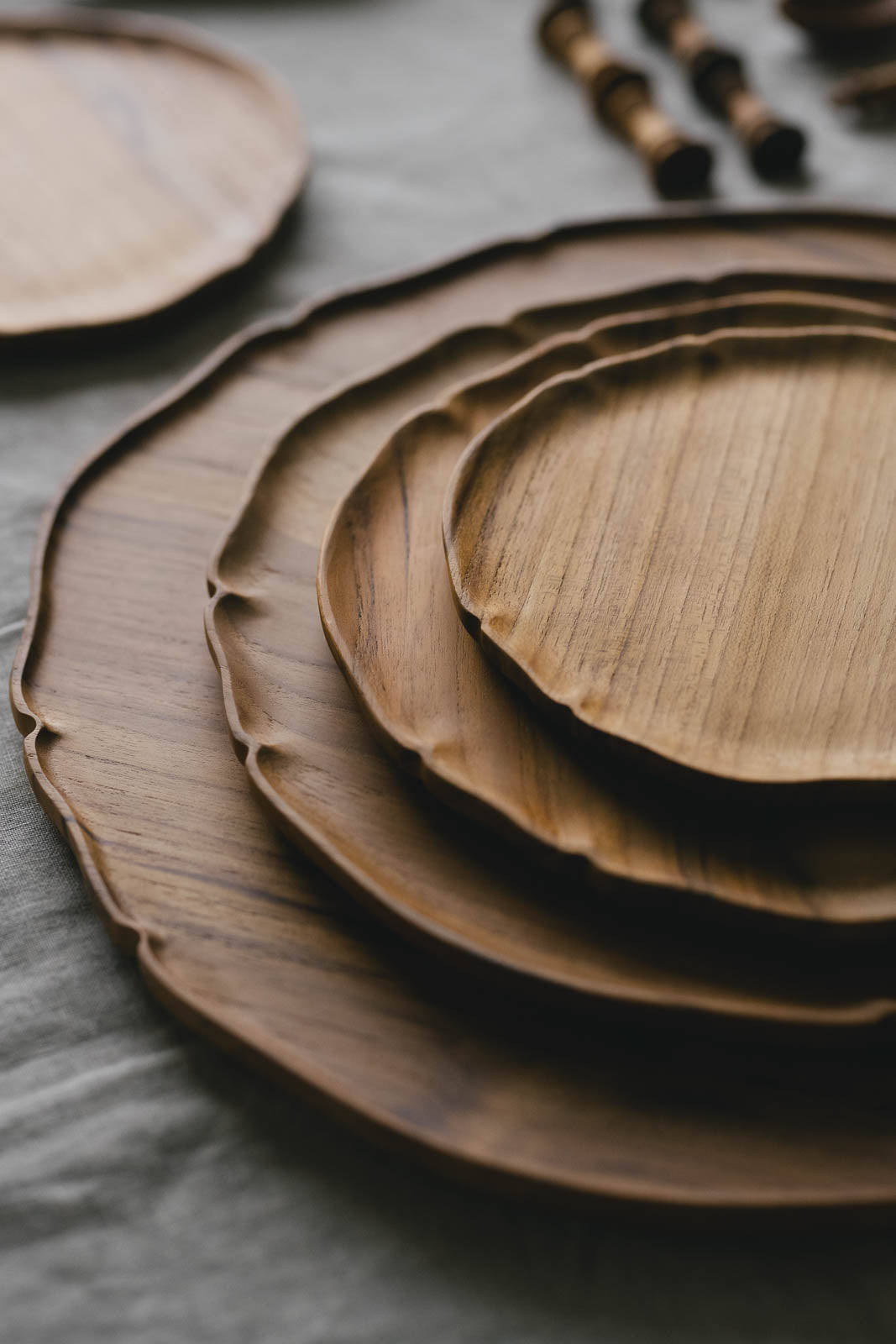 ラウンド型で縁に繊細なカーブデザインが施されているフォルム。チーク材ならではの温かみが加わり、料理を引き立てるだけでなく、テーブルを心地よい雰囲気に仕立てます。