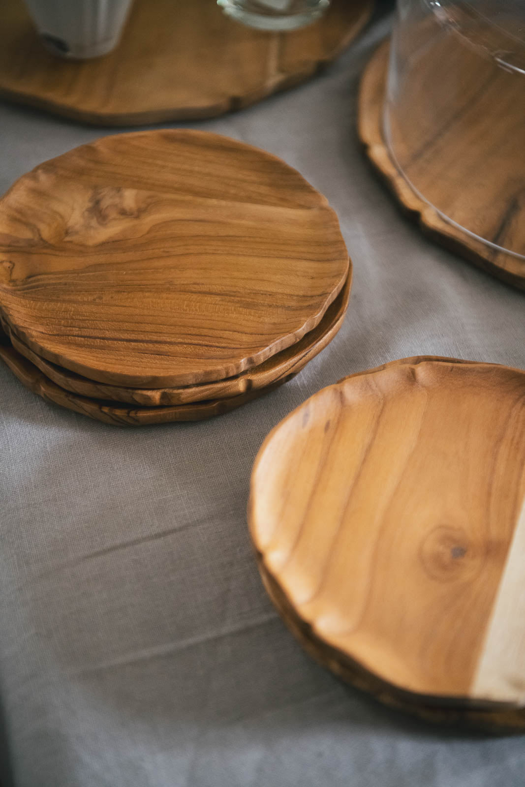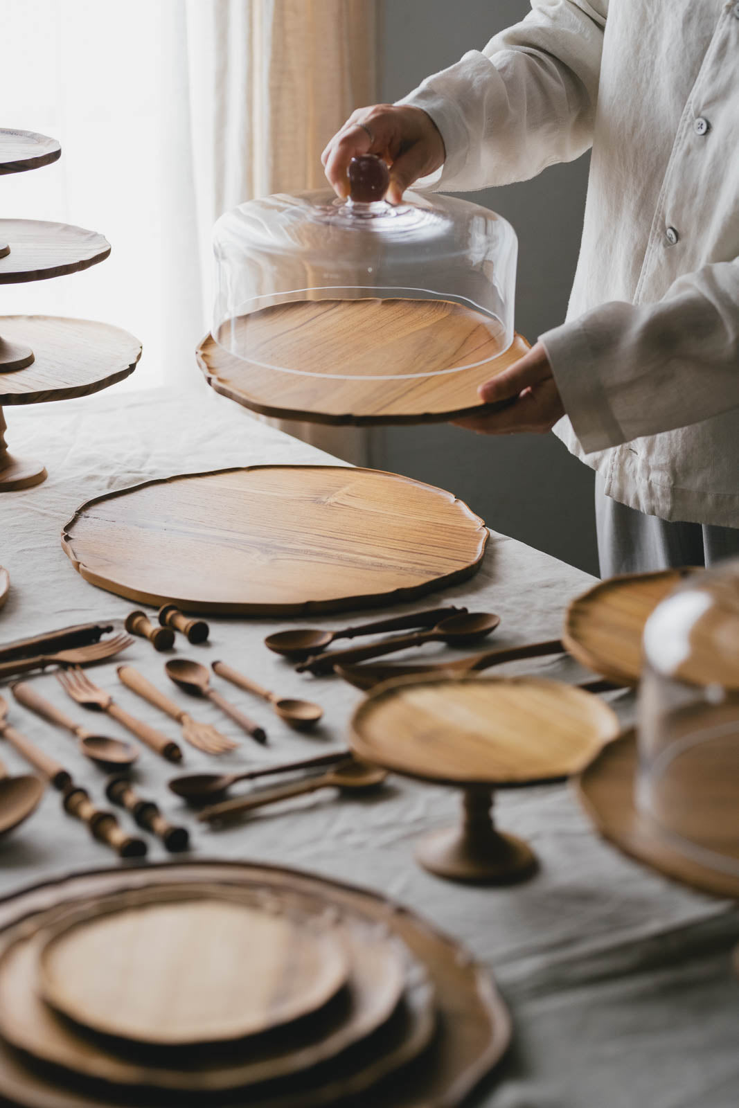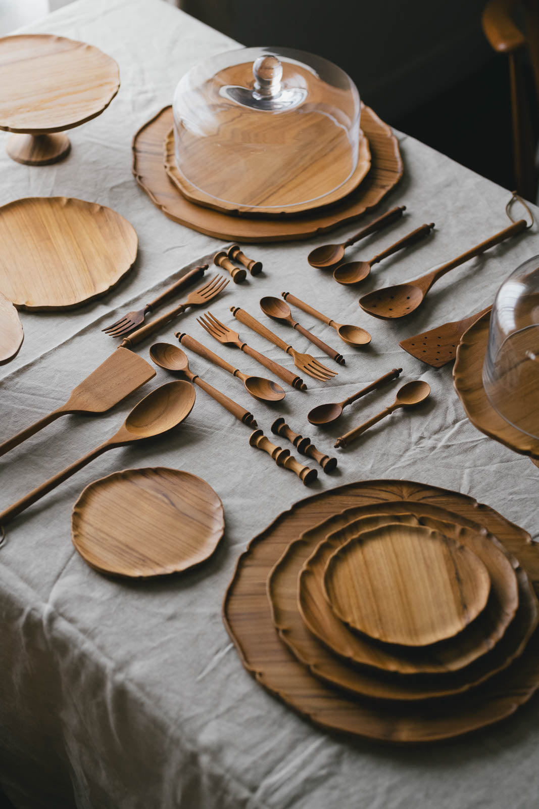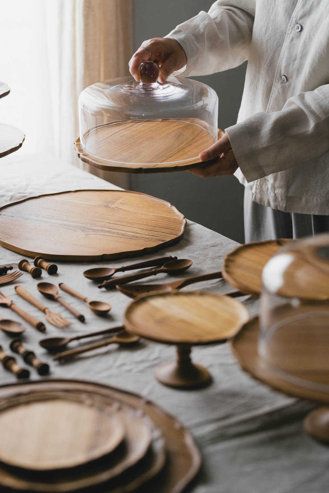 ラウンド型で縁に繊細なカーブデザインが施されているフォルム。チーク材ならではの温かみが加わり、料理を引き立てるだけでなく、テーブルを心地よい雰囲気に仕立てます。