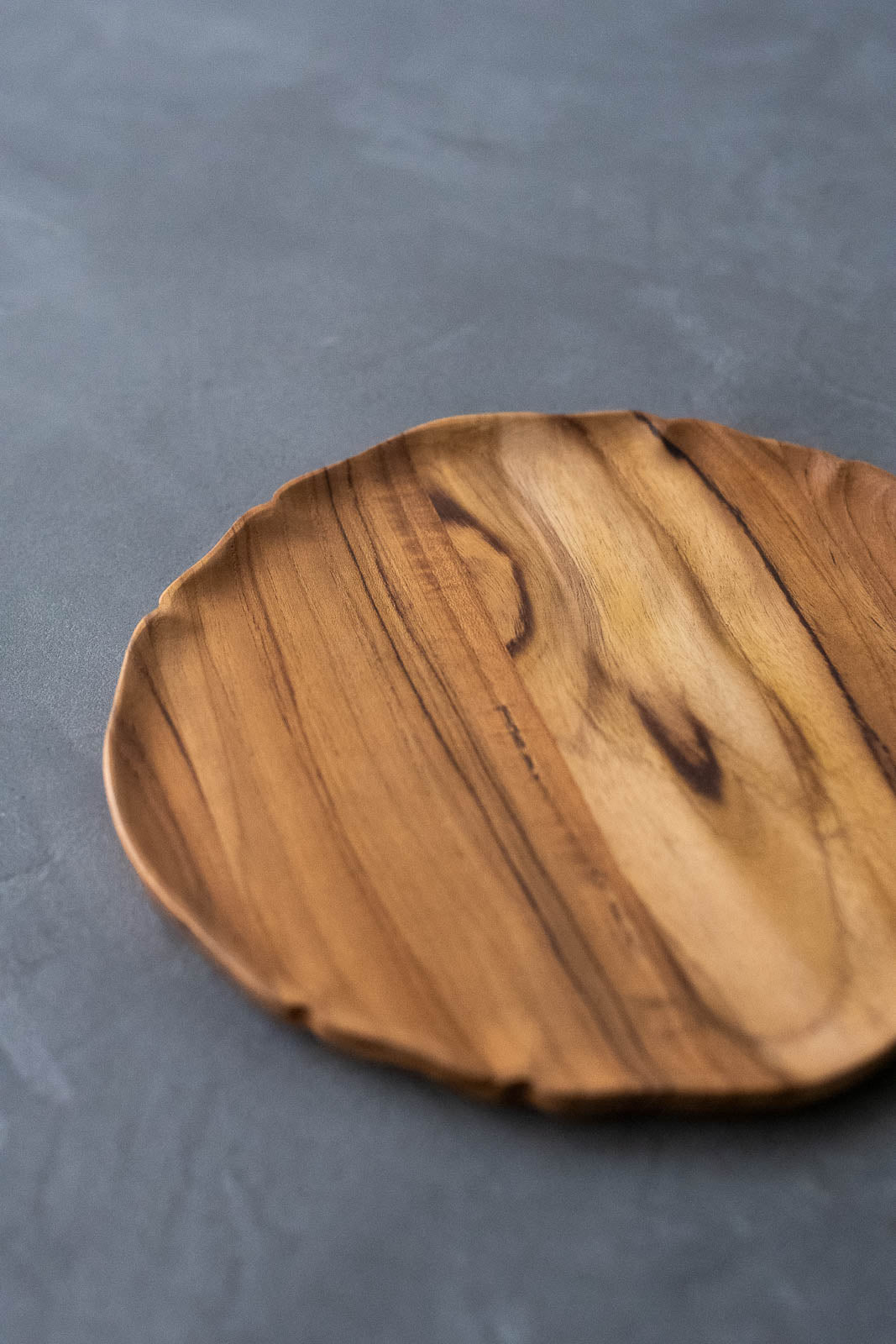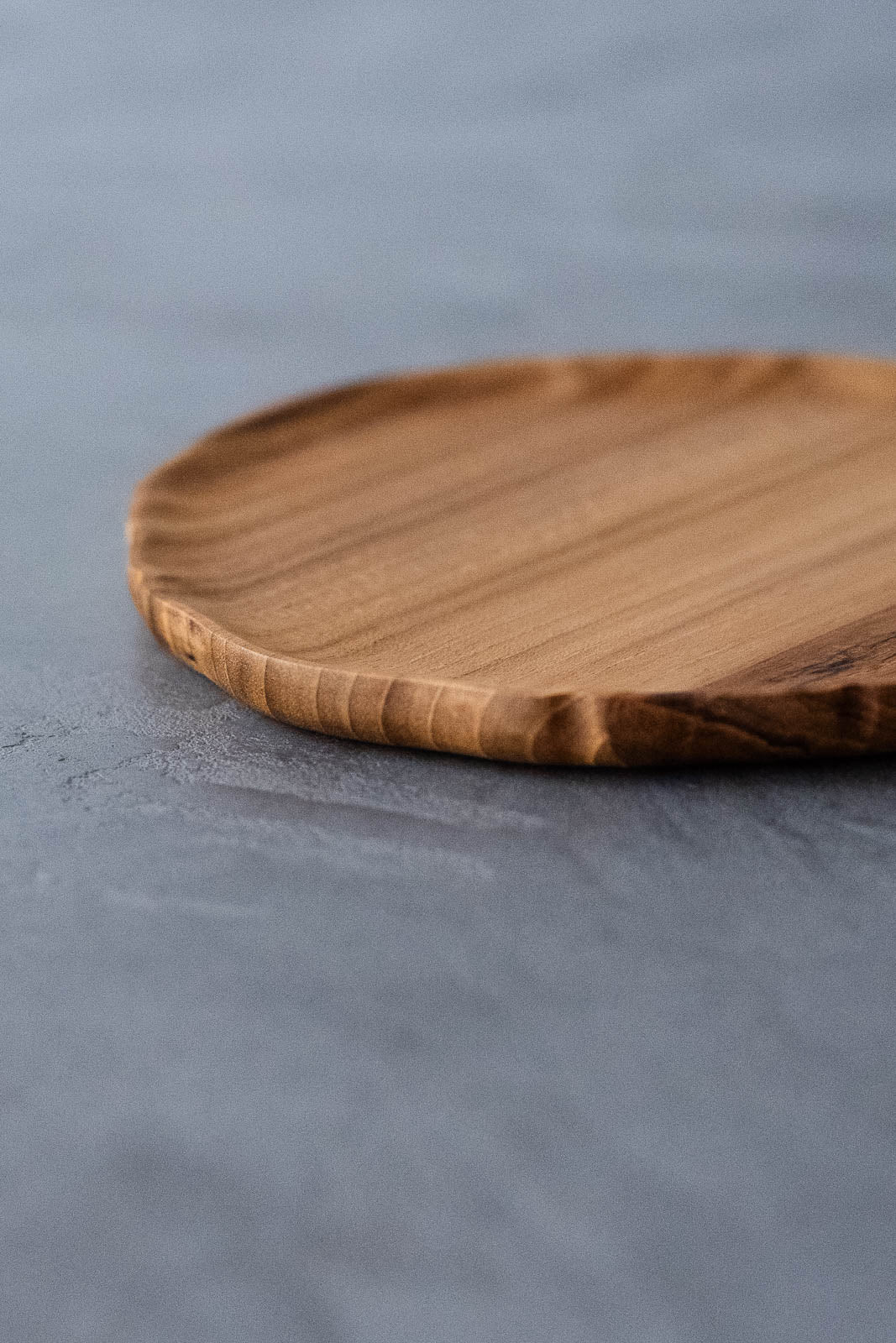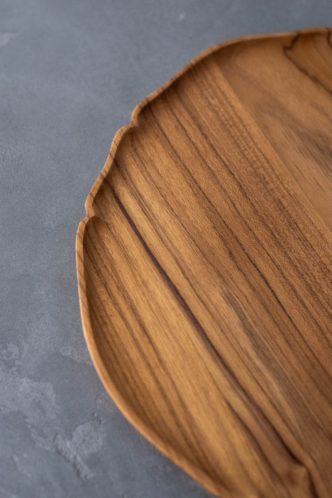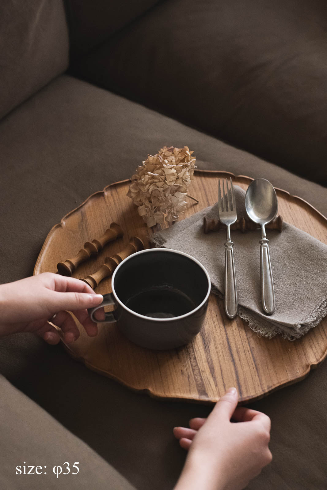 上質なチーク材を使用し、自然の風合いを生かしながら縁にやわらかな動きをつけた円形のトレイ。木を感じる手触りと、美しい木目が特徴です。シンプルなデザインは、日常使いはもちろん、空間のアクセントとしても活躍します。