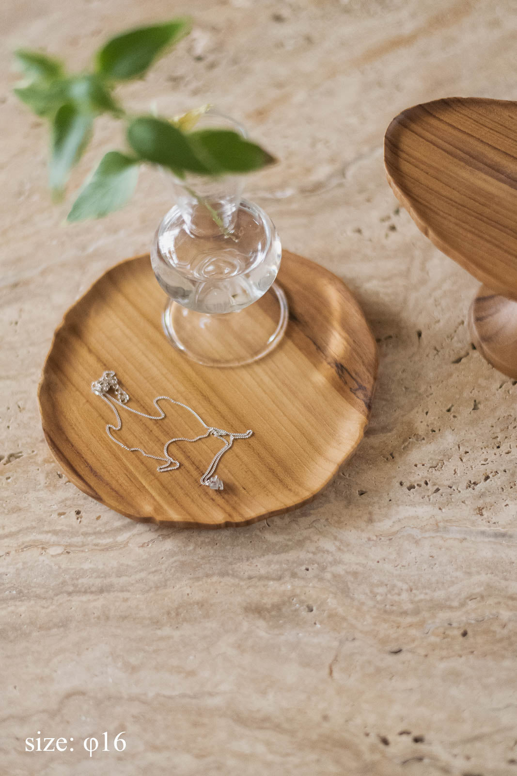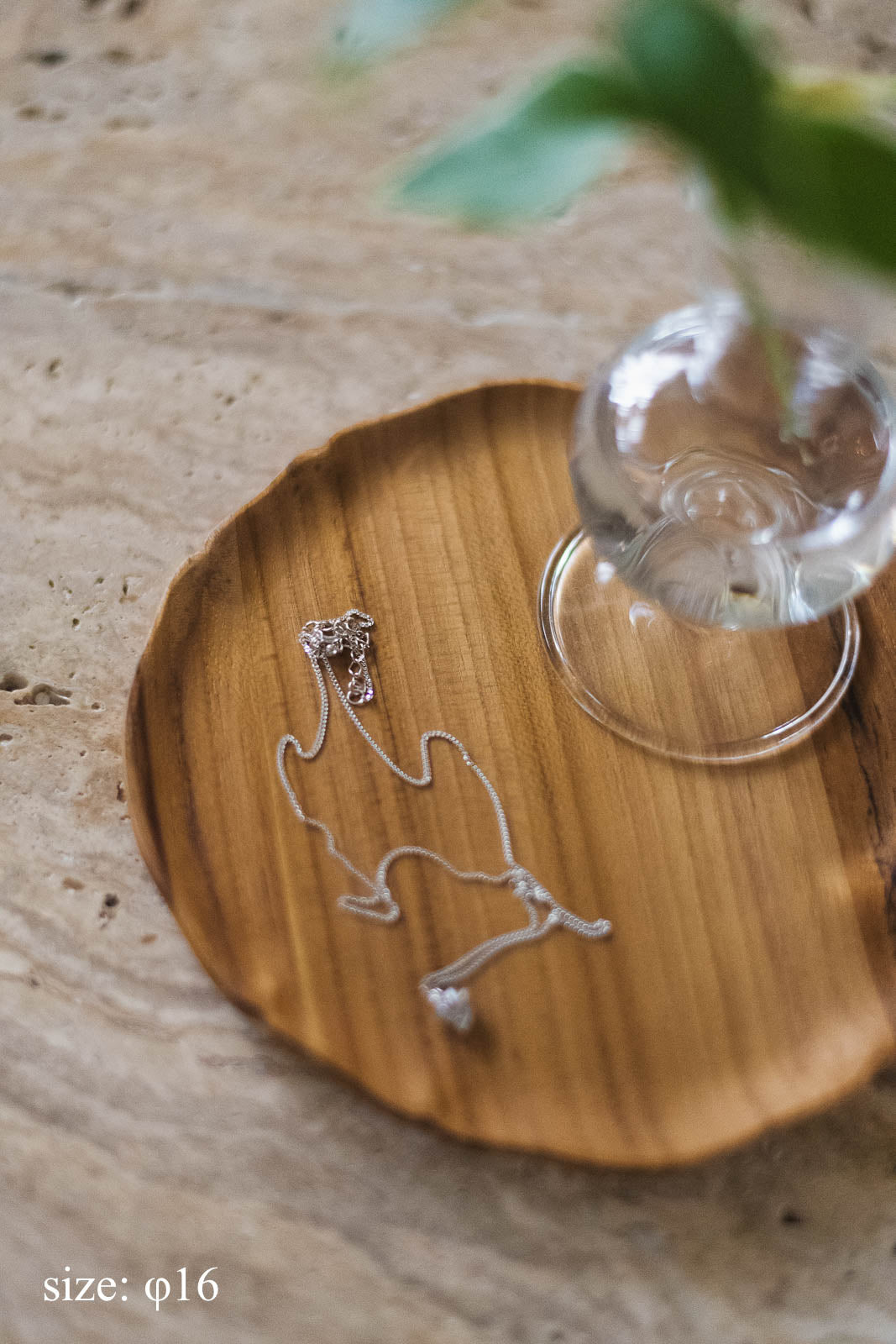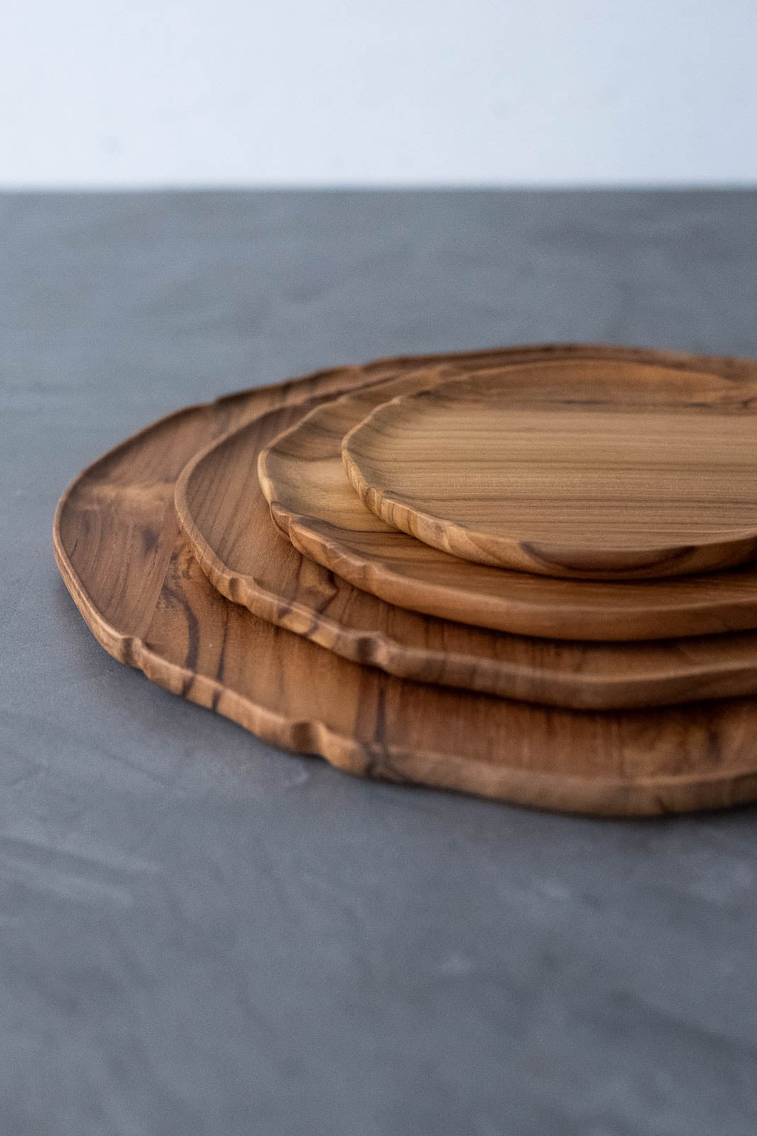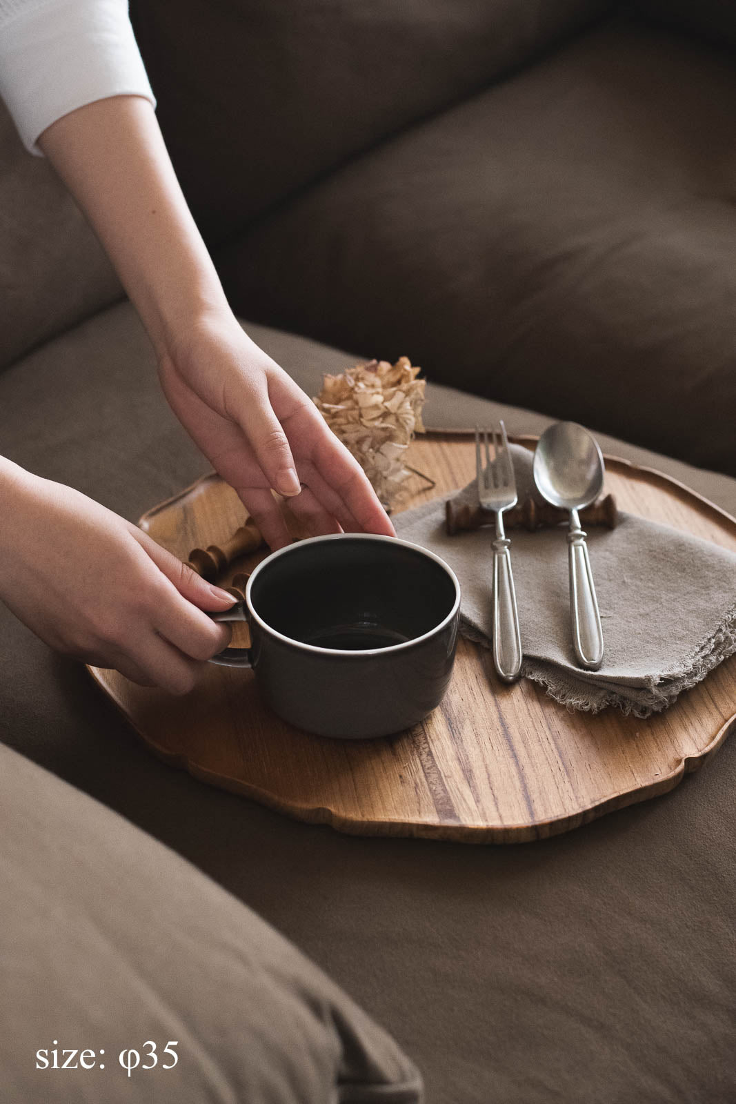上質なチーク材を使用し、自然の風合いを生かしながら縁にやわらかな動きをつけた円形のトレイ。木を感じる手触りと、美しい木目が特徴です。シンプルなデザインは、日常使いはもちろん、空間のアクセントとしても活躍します。