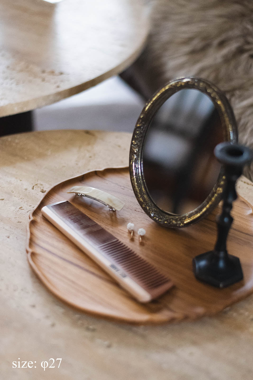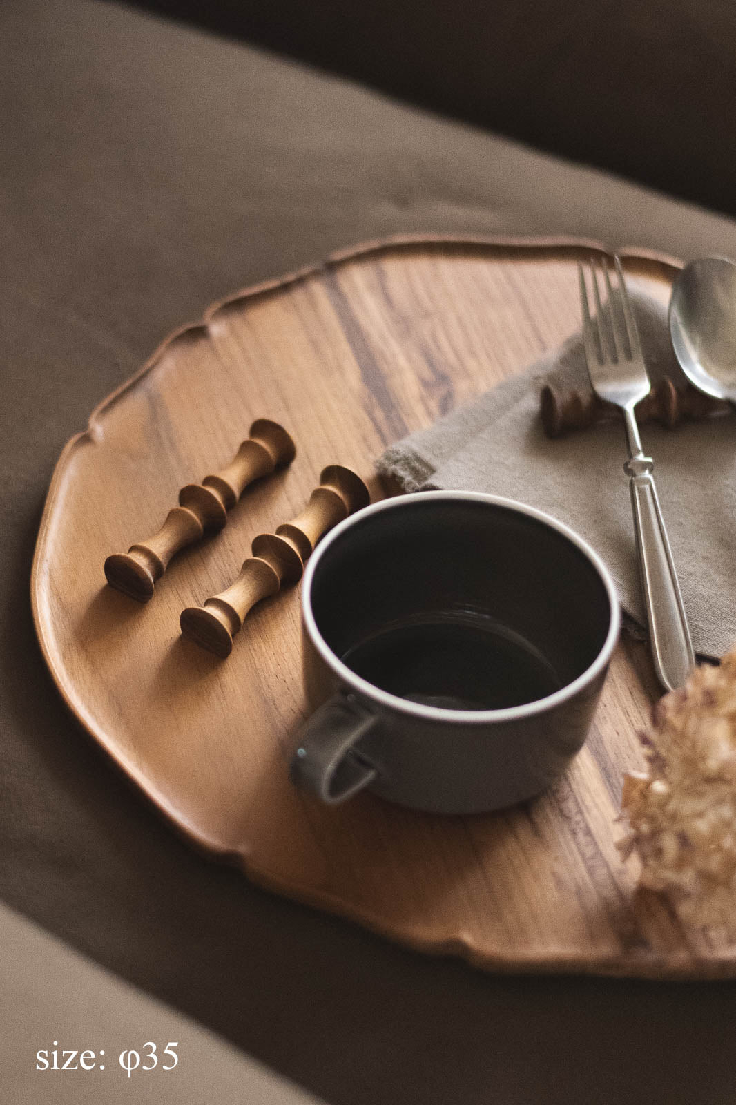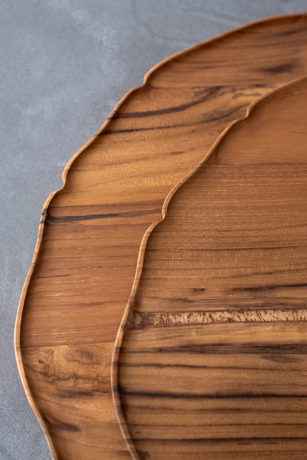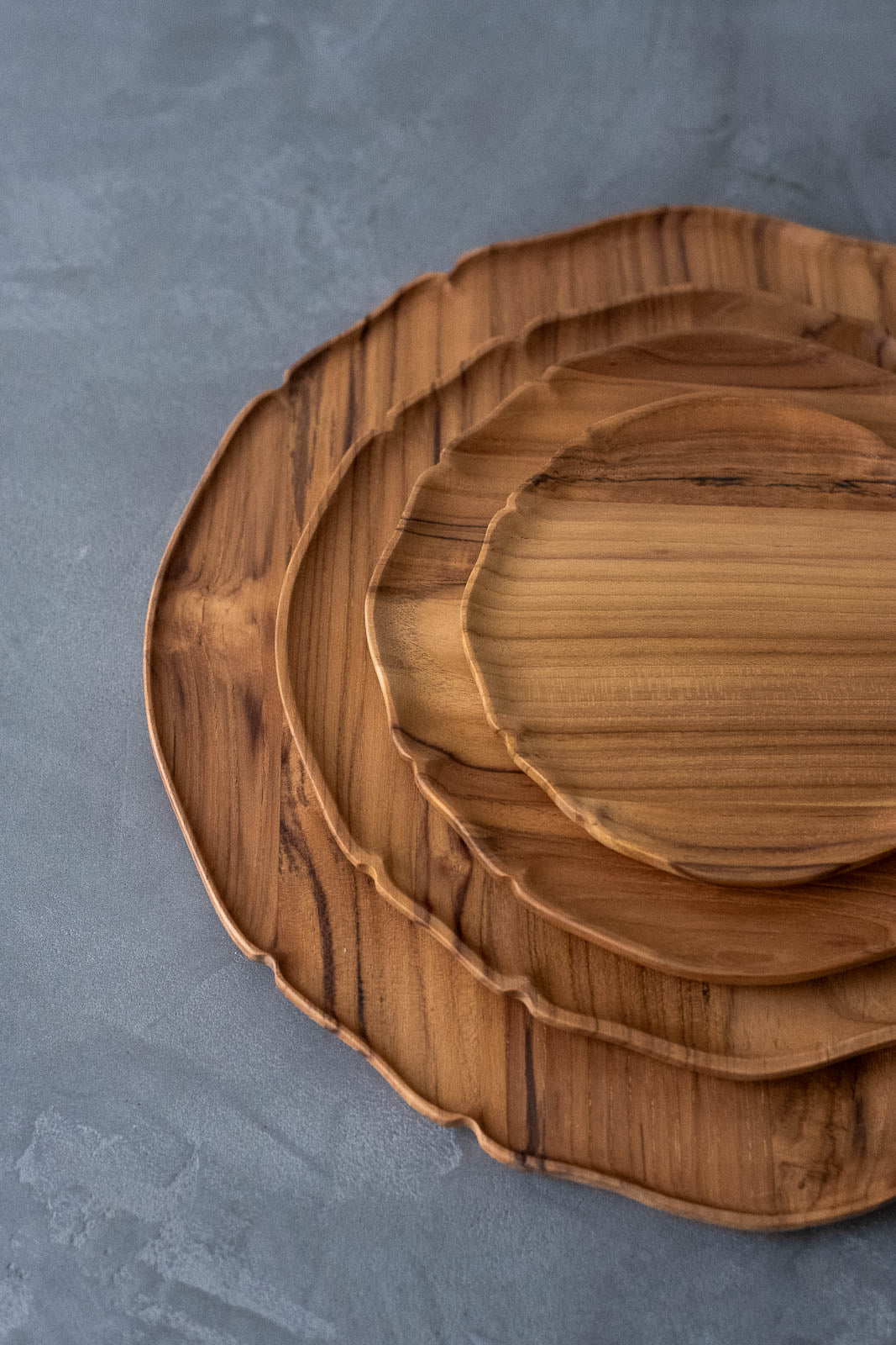上質なチーク材を使用し、自然の風合いを生かしながら縁にやわらかな動きをつけた円形のトレイ。木を感じる手触りと、美しい木目が特徴です。シンプルなデザインは、日常使いはもちろん、空間のアクセントとしても活躍します。
