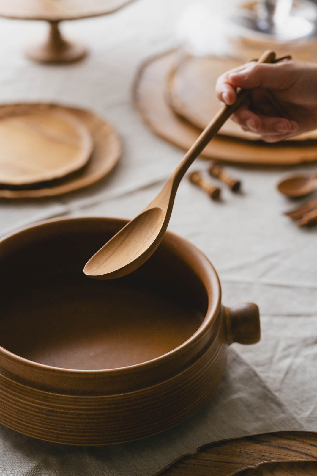 チーク無垢材を加工した贅沢な作りの「NIDO(ニド)」調理スプーンは、船や建材などにも用いられる高級木材であるチークならではの堅牢なつくり。木材本来の自然な風合いと滑らかな手触りが、使うたびに心地よさを感じさせ、日々にちょっとした贅沢を添えてくれます。