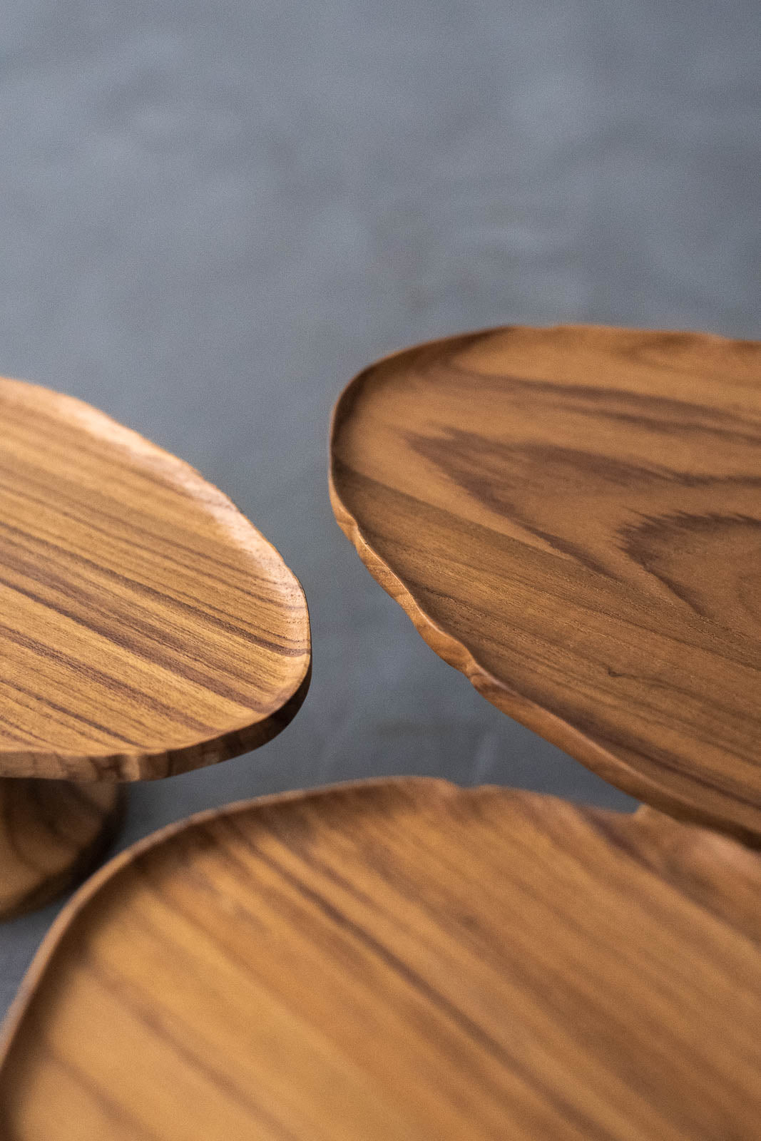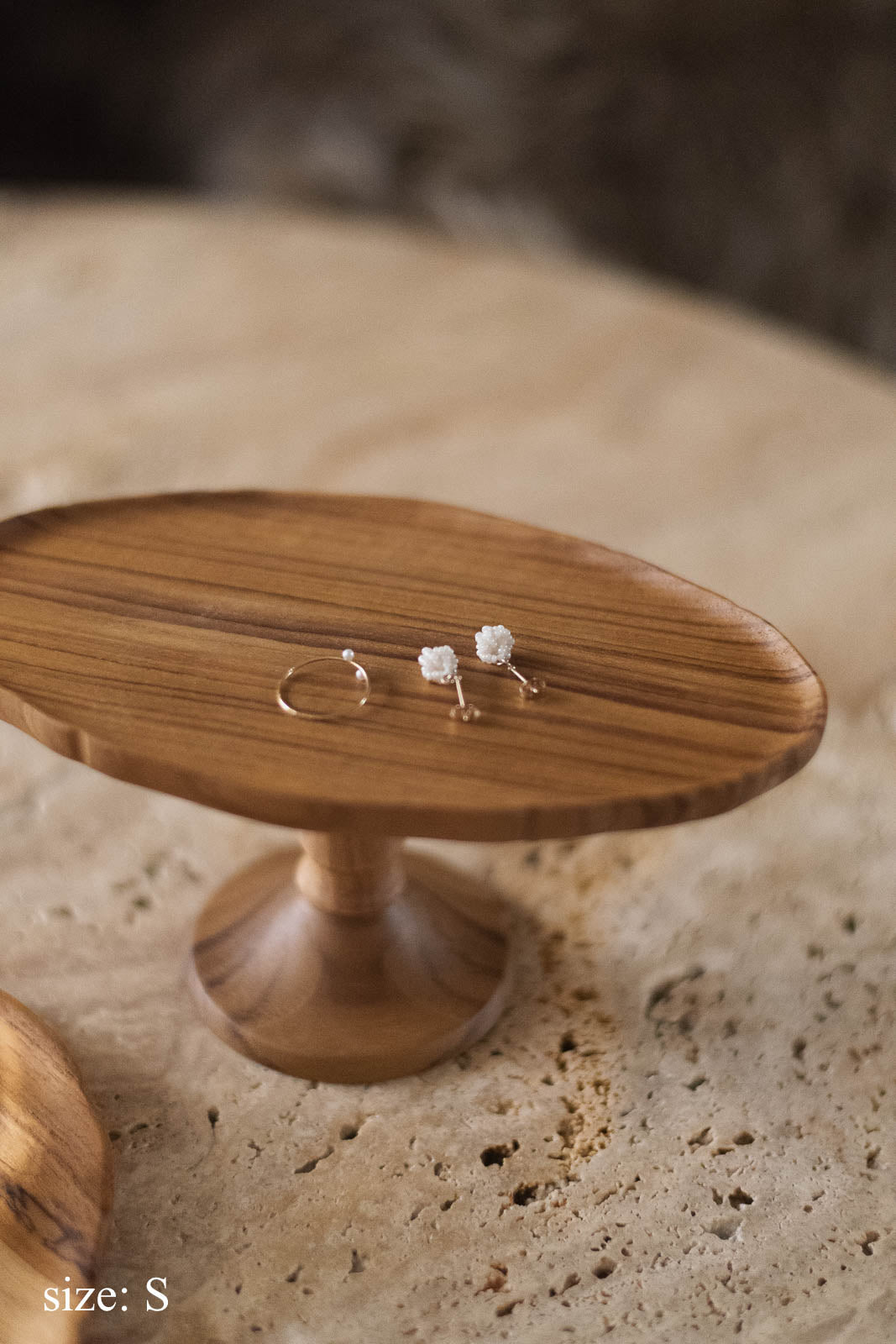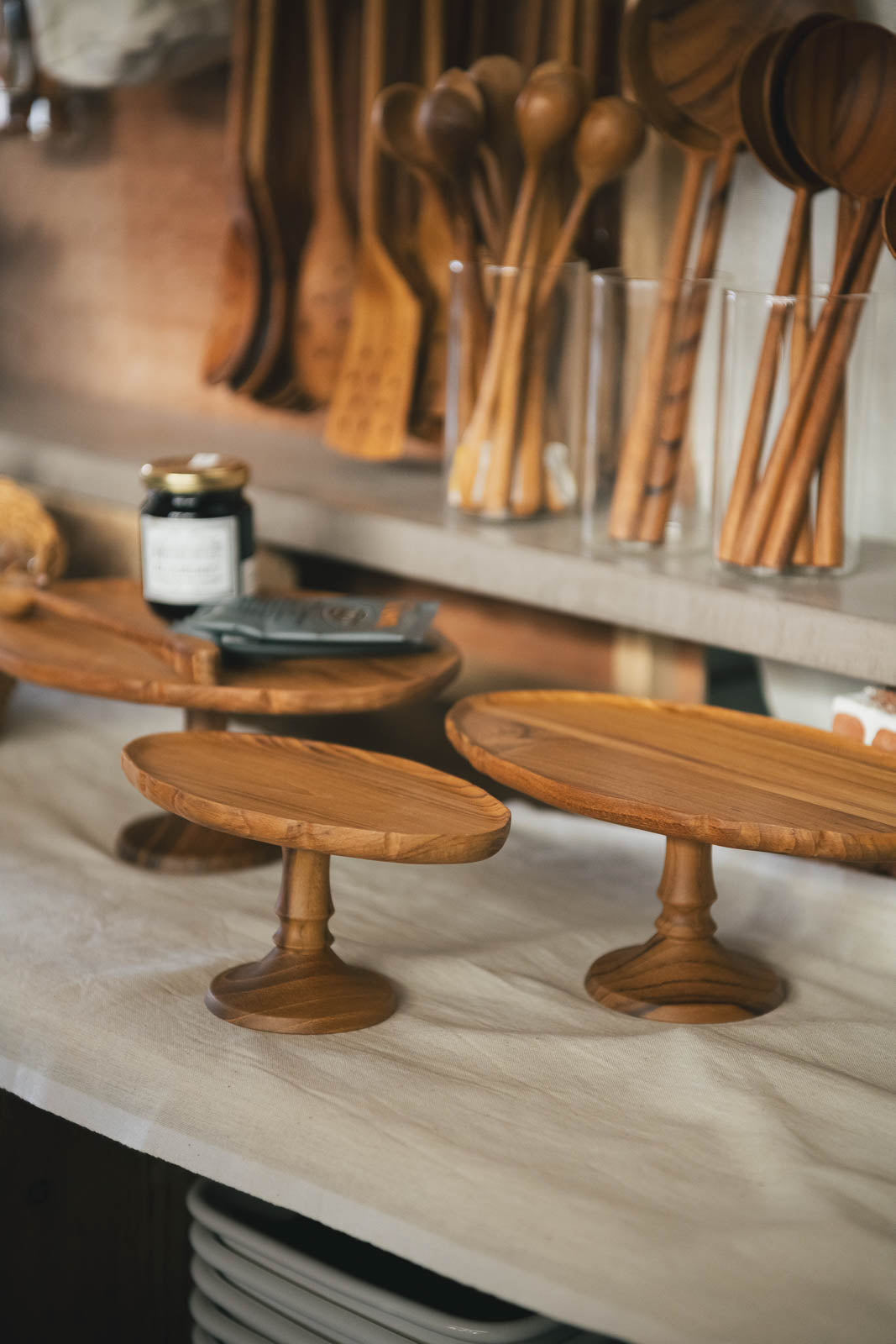 上質なチーク材の美しい木目と縁のゆるやかなカーブデザインが映える、クラシカルな印象のオーバル型のケーキスタンド。