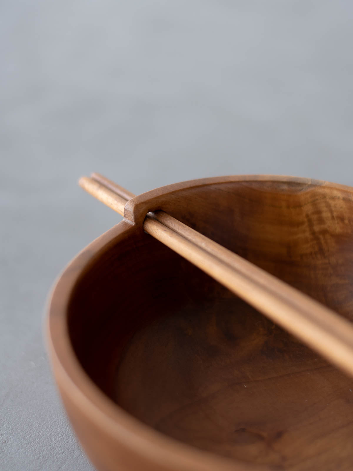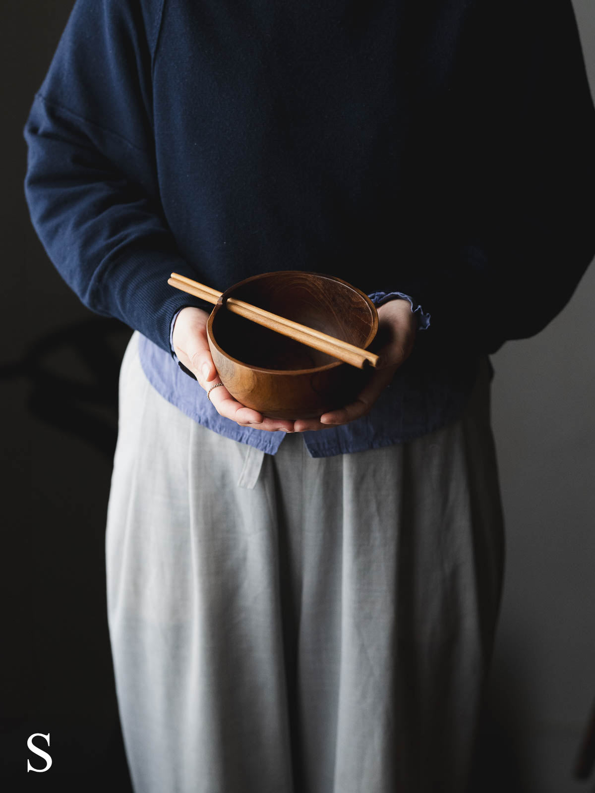 器の片側にはお箸を通すための穴がデザインされており、お箸を通すだけで箸置きとしても機能するユニークな構造。この一体型デザインにより、テーブルの上がスッキリと整います。シンプルな佇まいに機能性をプラスしたこのアイテムは使うたびに心地よさを感じさせてくれます。サイズはS(φ15cm)とL(φ20cm)の2種類をご用意。