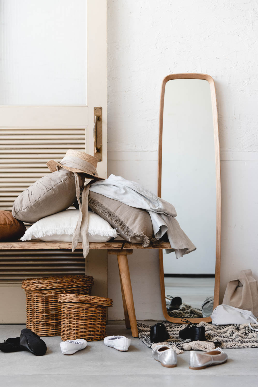 付属の金具をミラー背面に取り付けていただければ、横向き仕様にも。ドレッサーの上に掛けたり、置き方や使い方のアレンジも自由に楽しめます。ミラーは光をやさしく取り込み、お部屋に明るさとぬくもりを添えてくれるので、玄関に置けば、空間が開放的な印象に。