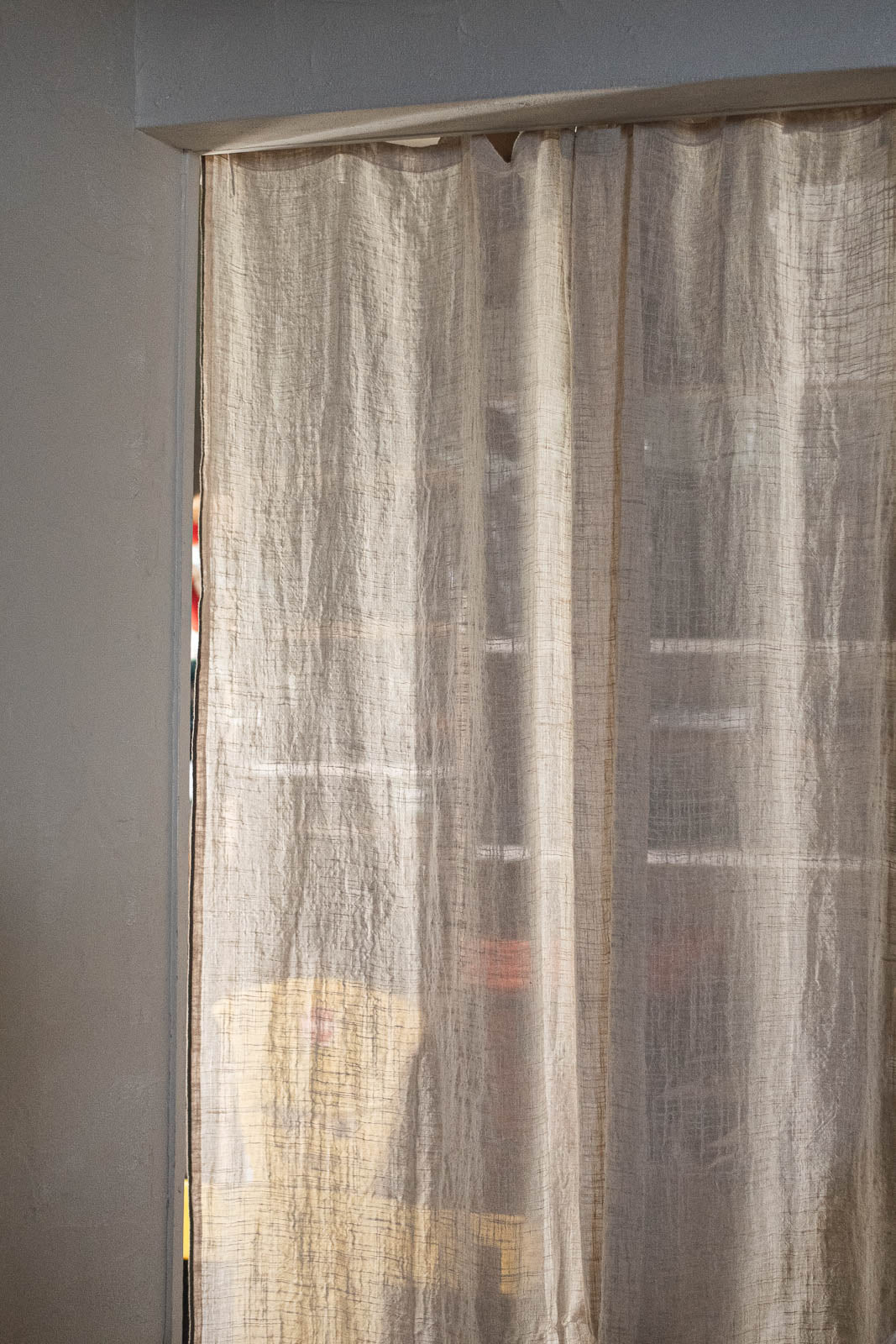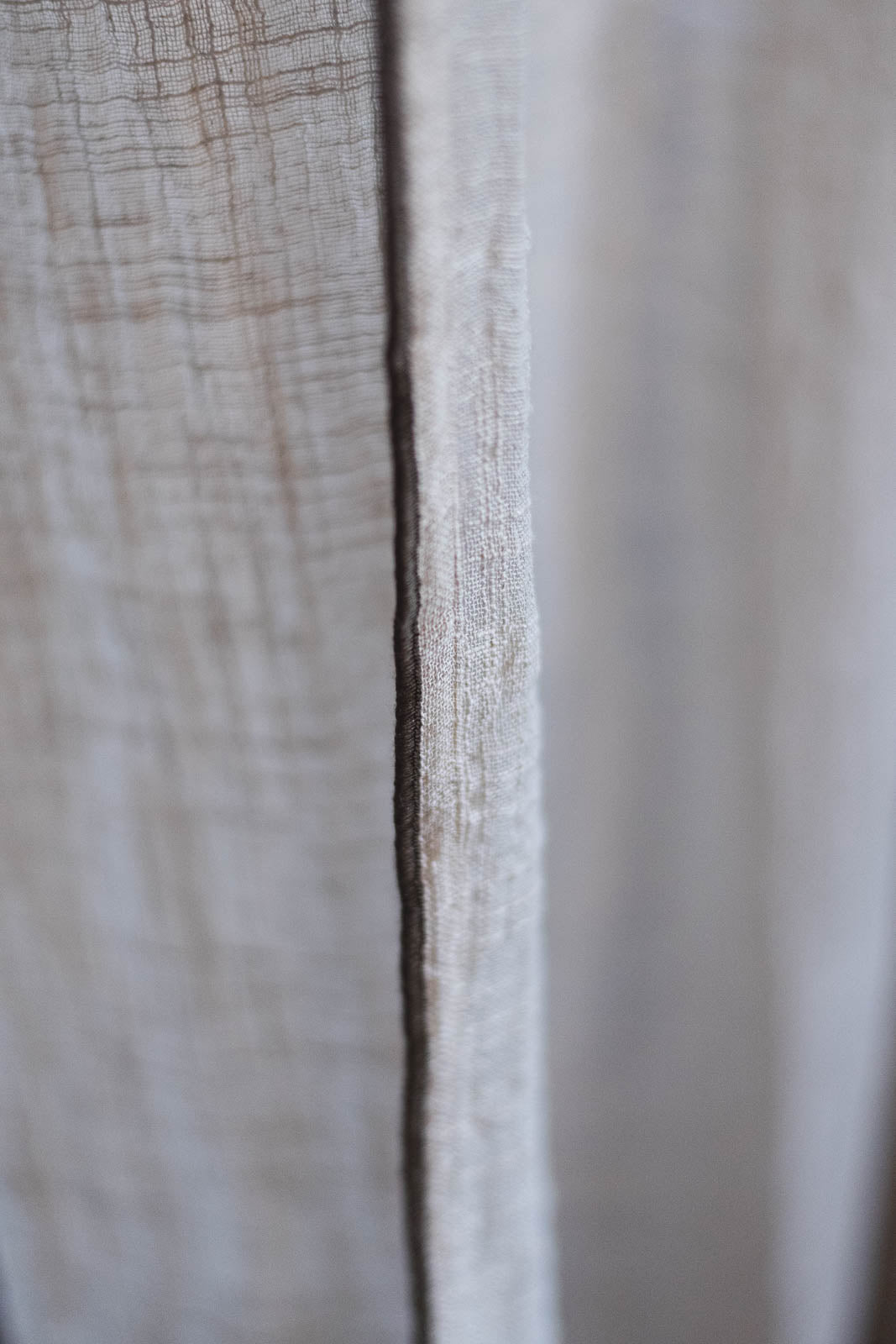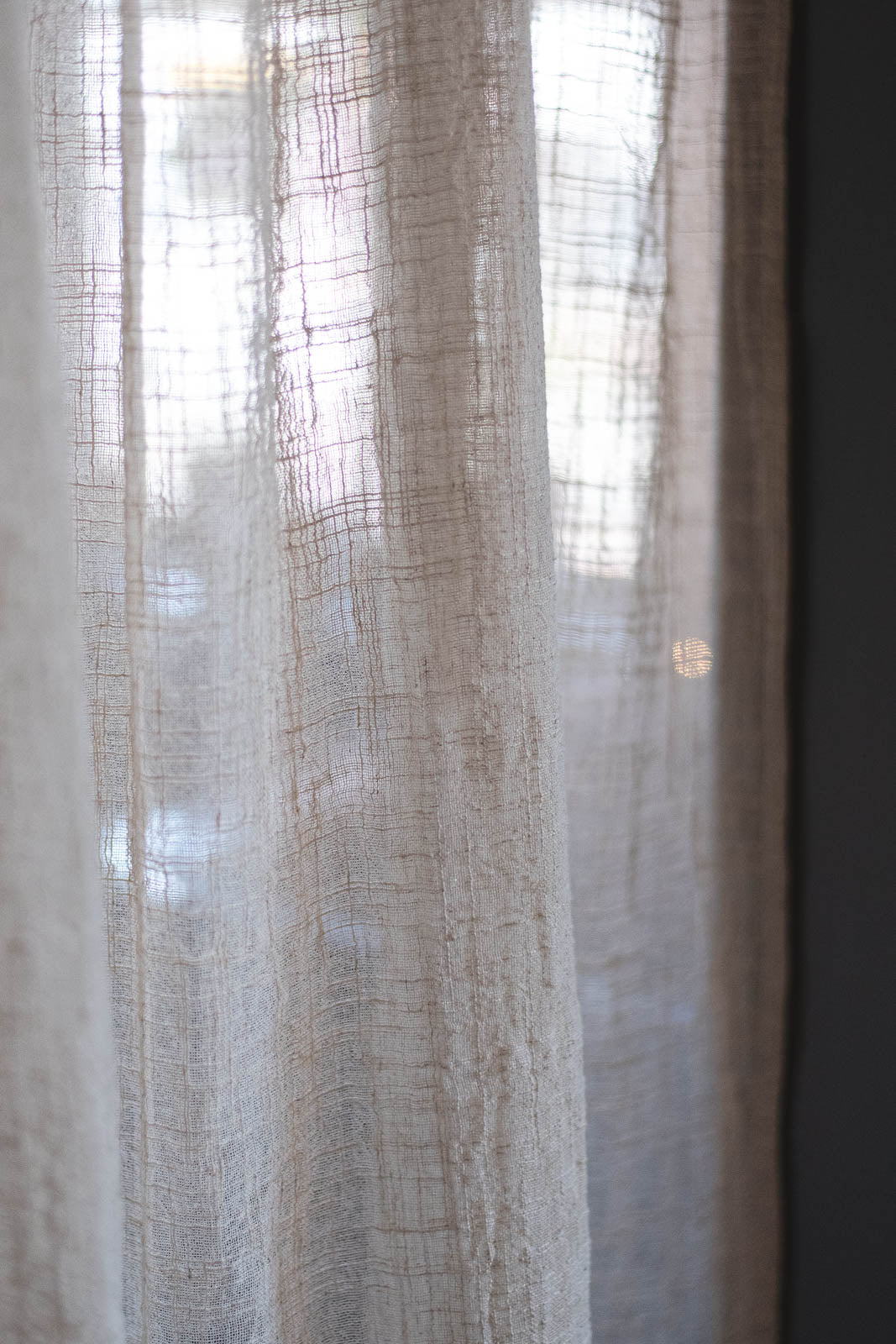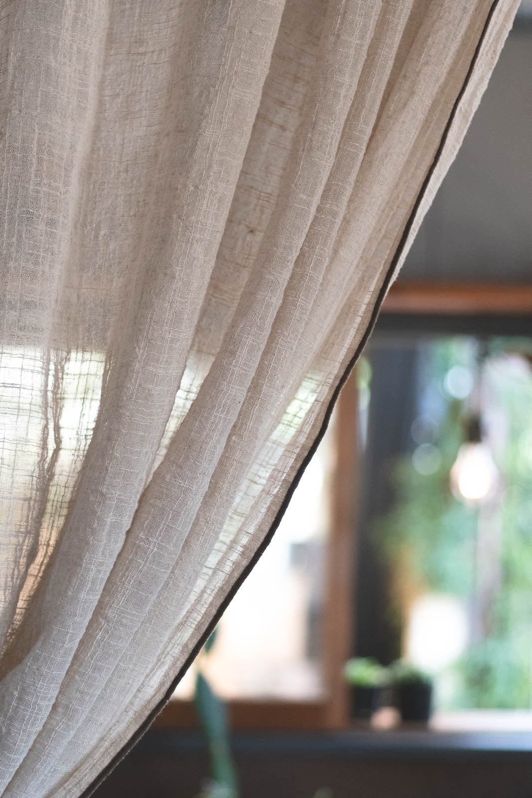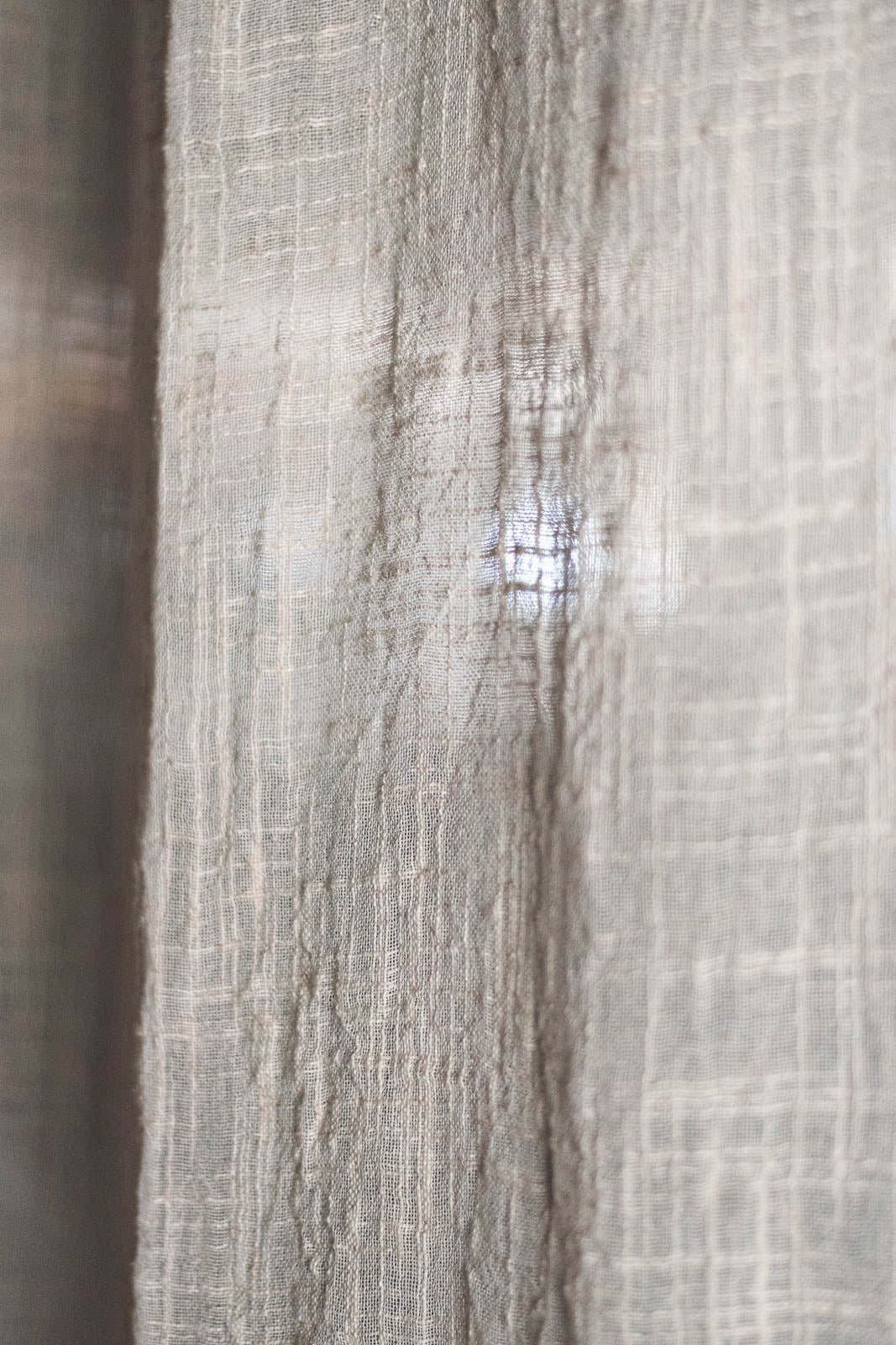 透けたときに浮かぶ織り模様は、スラブ生地ならではの味わい。細くなったり太くなったり——糸の自然なムラがやさしい表情を生み、お部屋にやわらかな空気感を添えてくれます。
