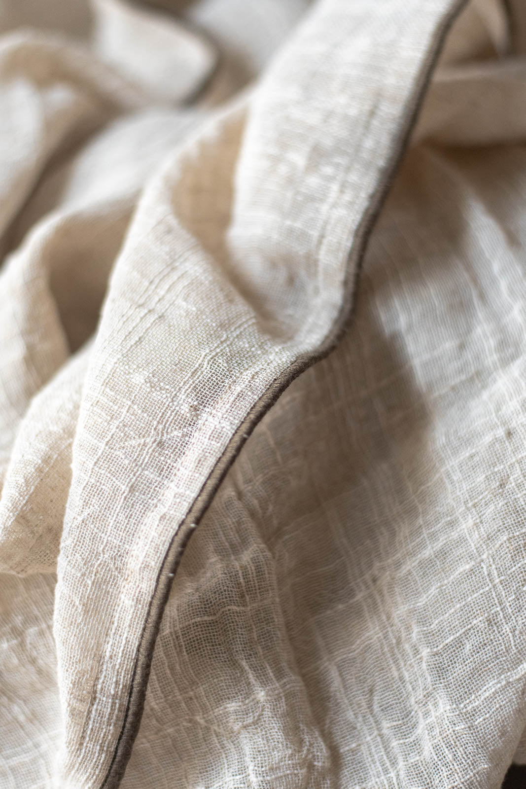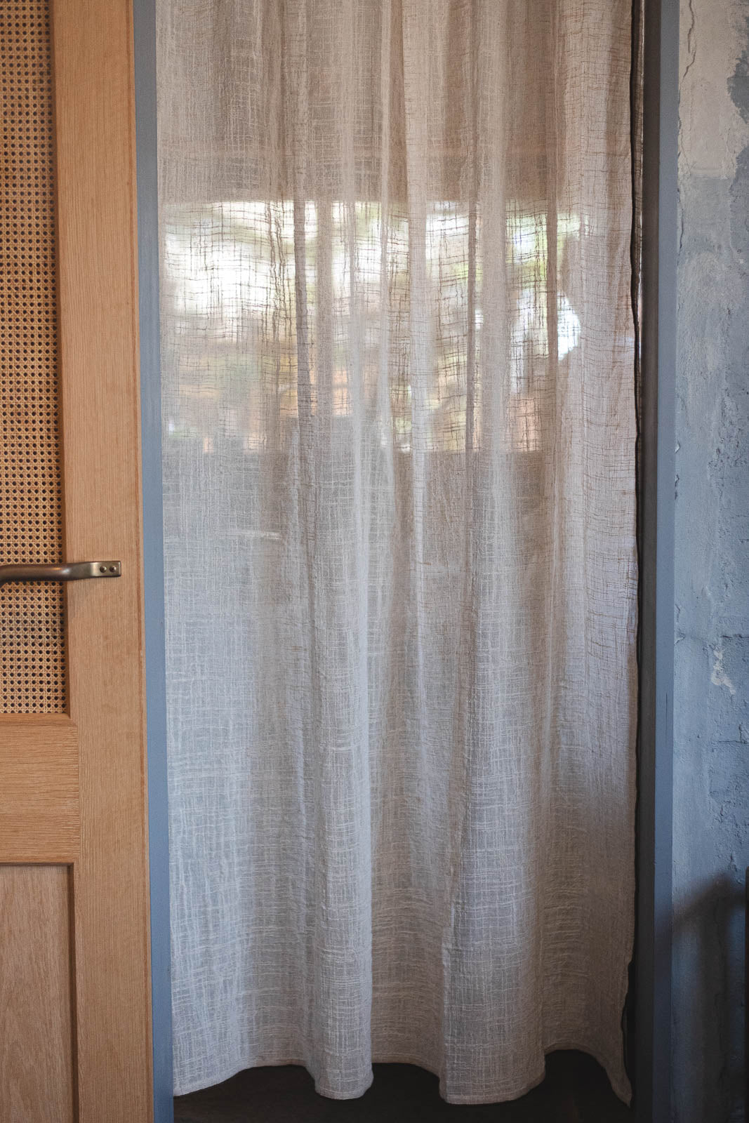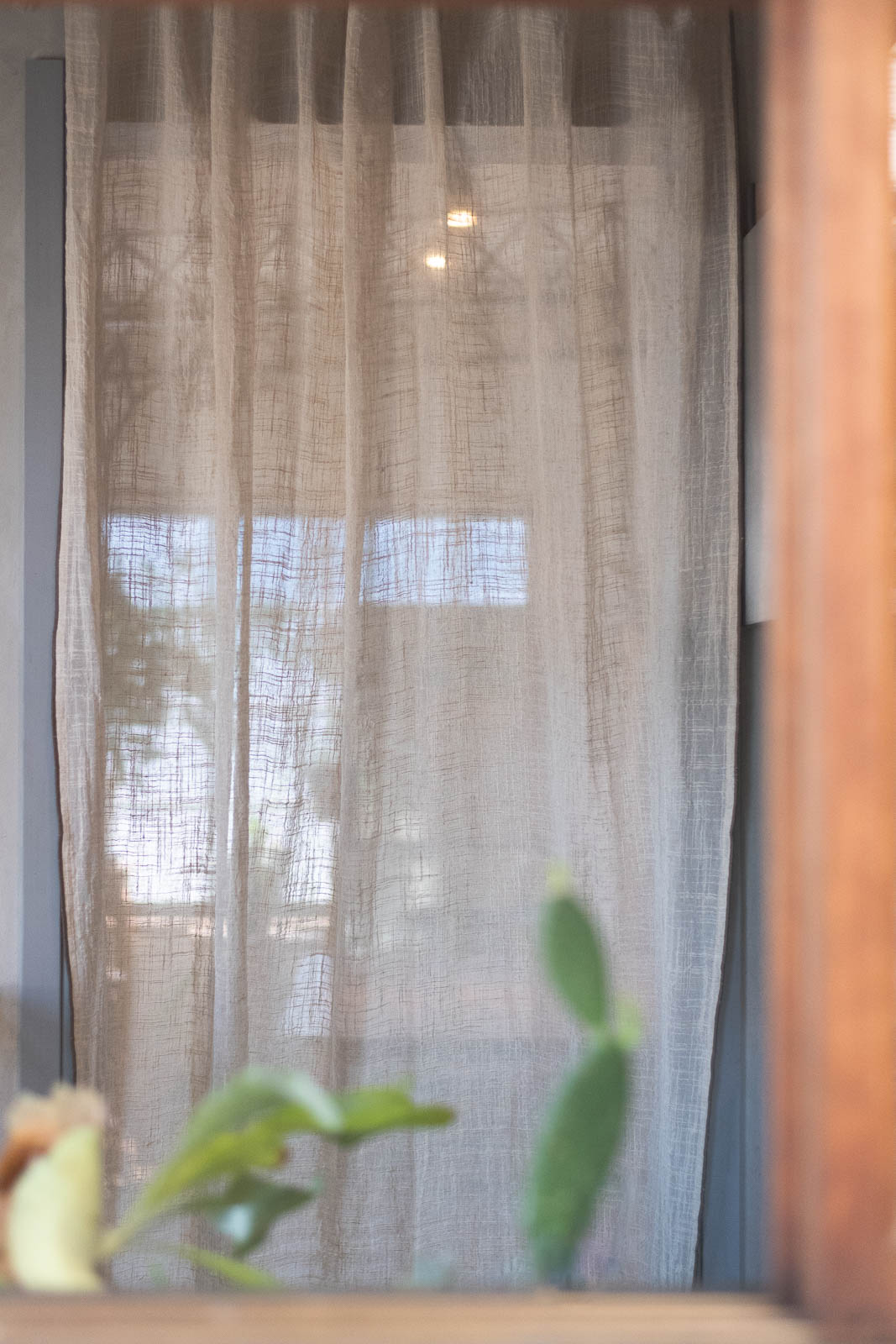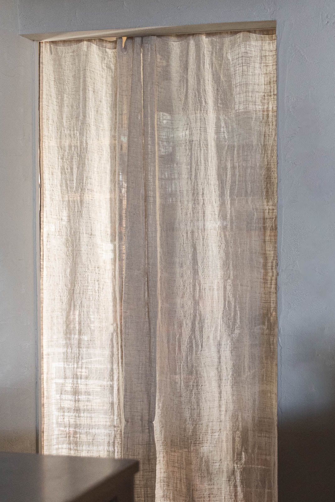 透けたときに浮かぶ織り模様は、スラブ生地ならではの味わい。細くなったり太くなったり——糸の自然なムラがやさしい表情を生み、お部屋にやわらかな空気感を添えてくれます。