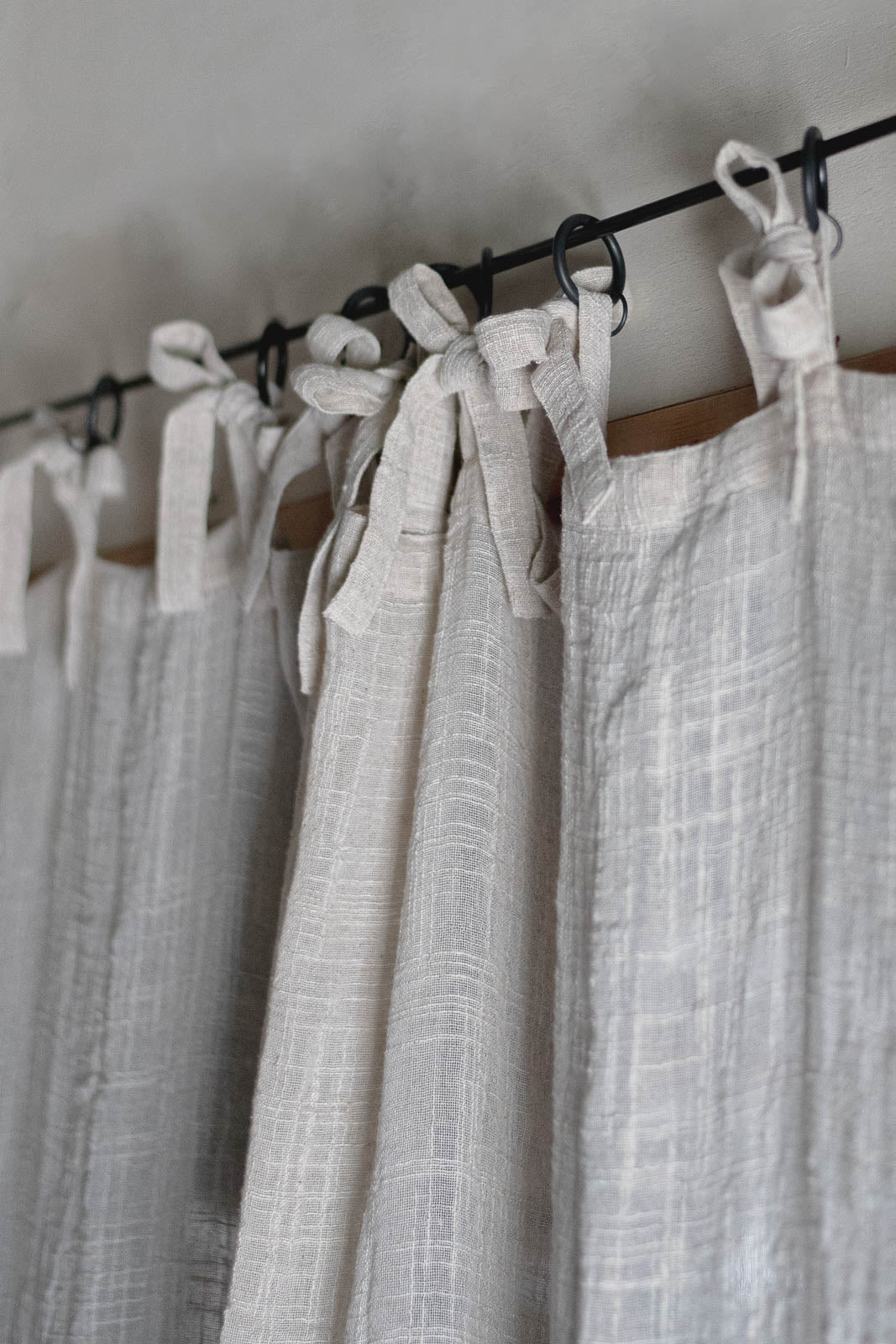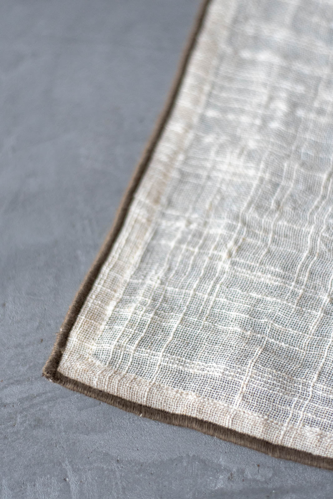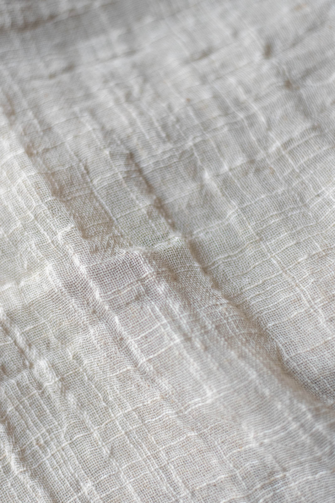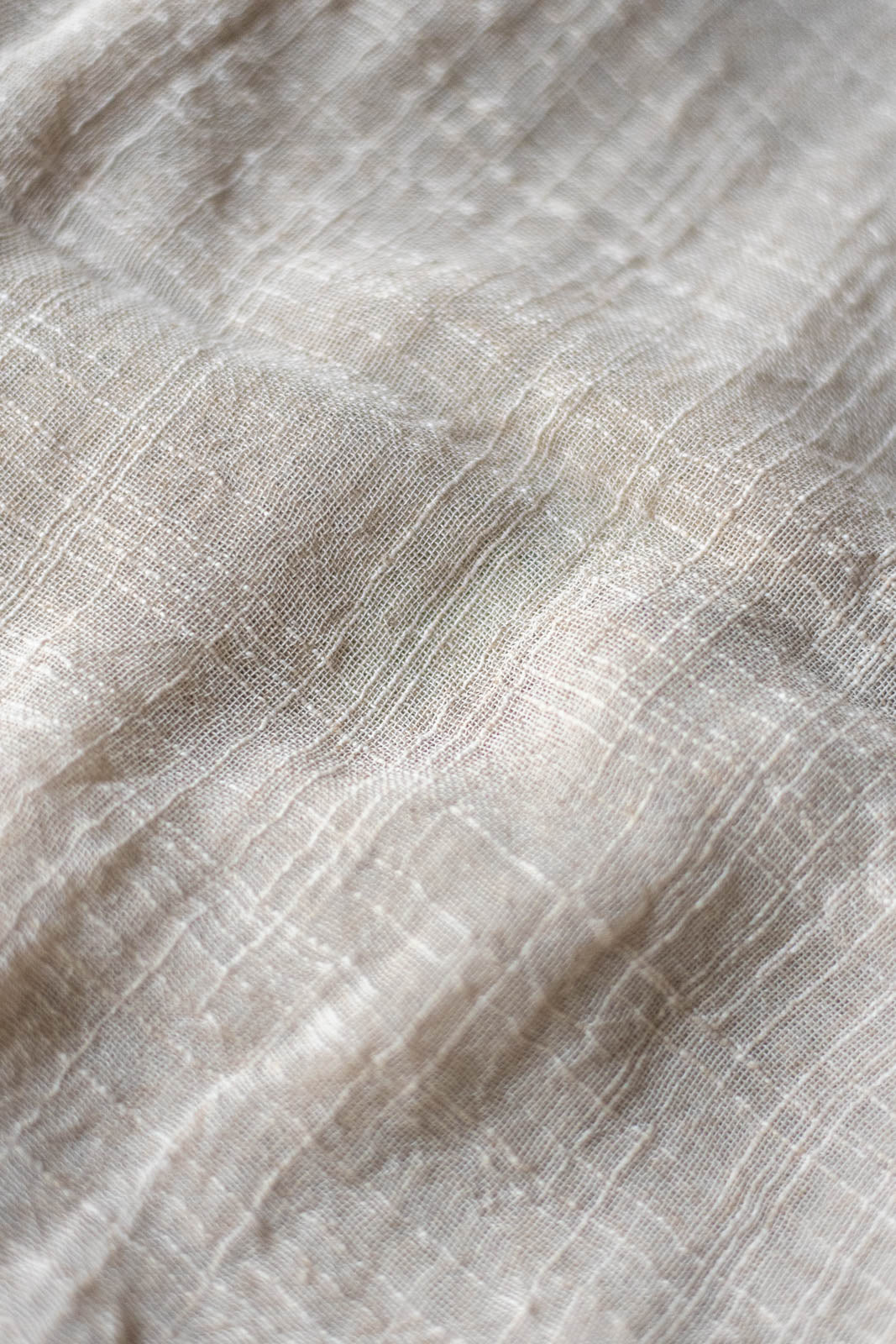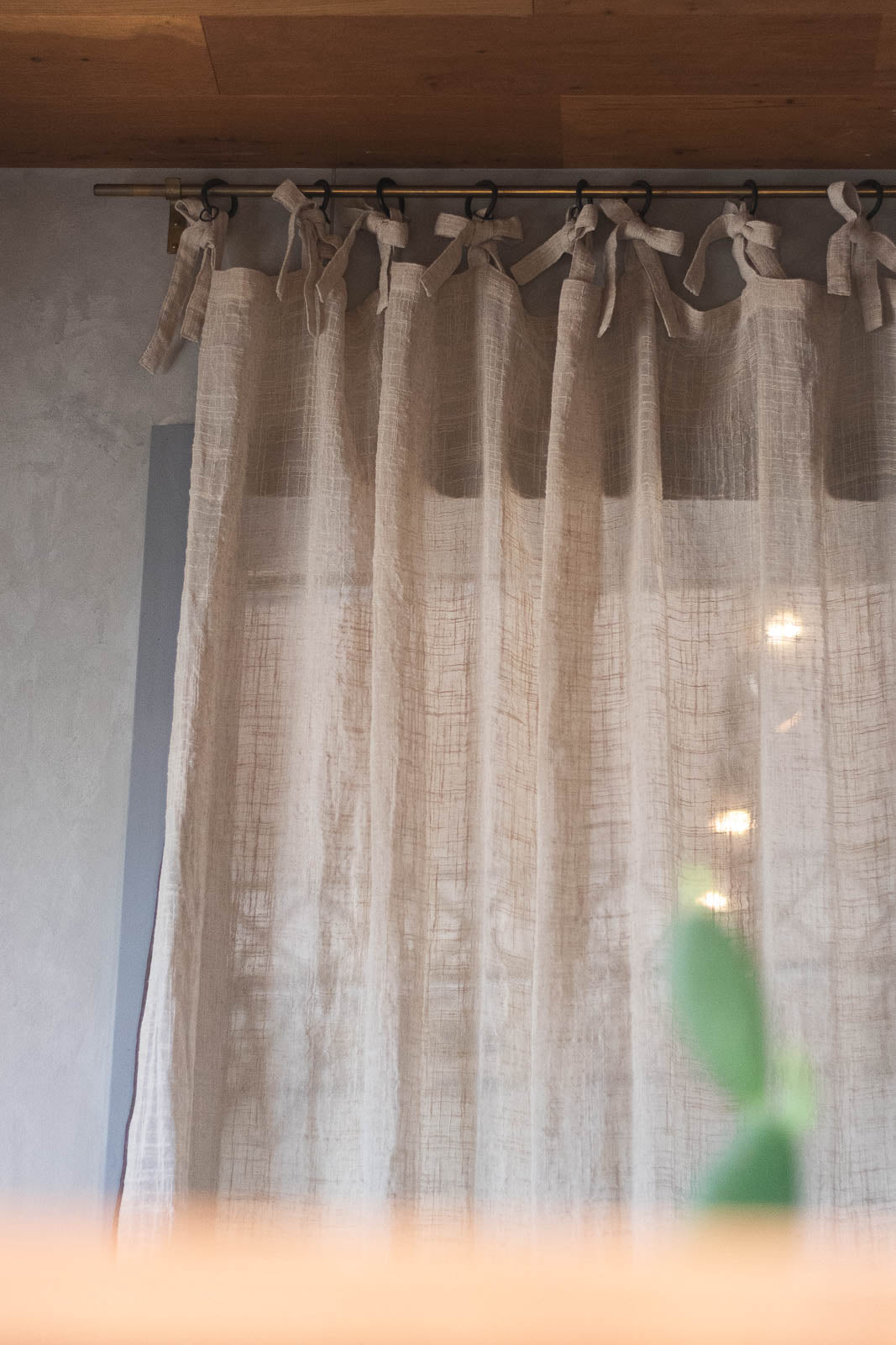 透けたときに浮かぶ織り模様は、スラブ生地ならではの味わい。細くなったり太くなったり——糸の自然なムラがやさしい表情を生み、お部屋にやわらかな空気感を添えてくれます。