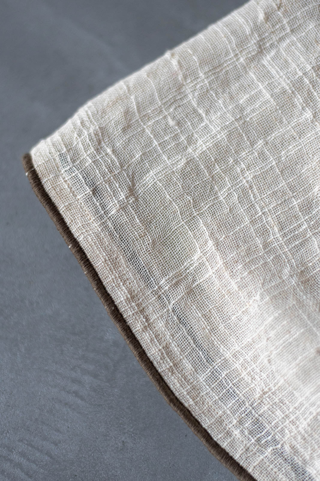 素朴な風合いのナチュラルカラーのスラブ生地に、ダークブラウンのステッチを添えた一枚です。