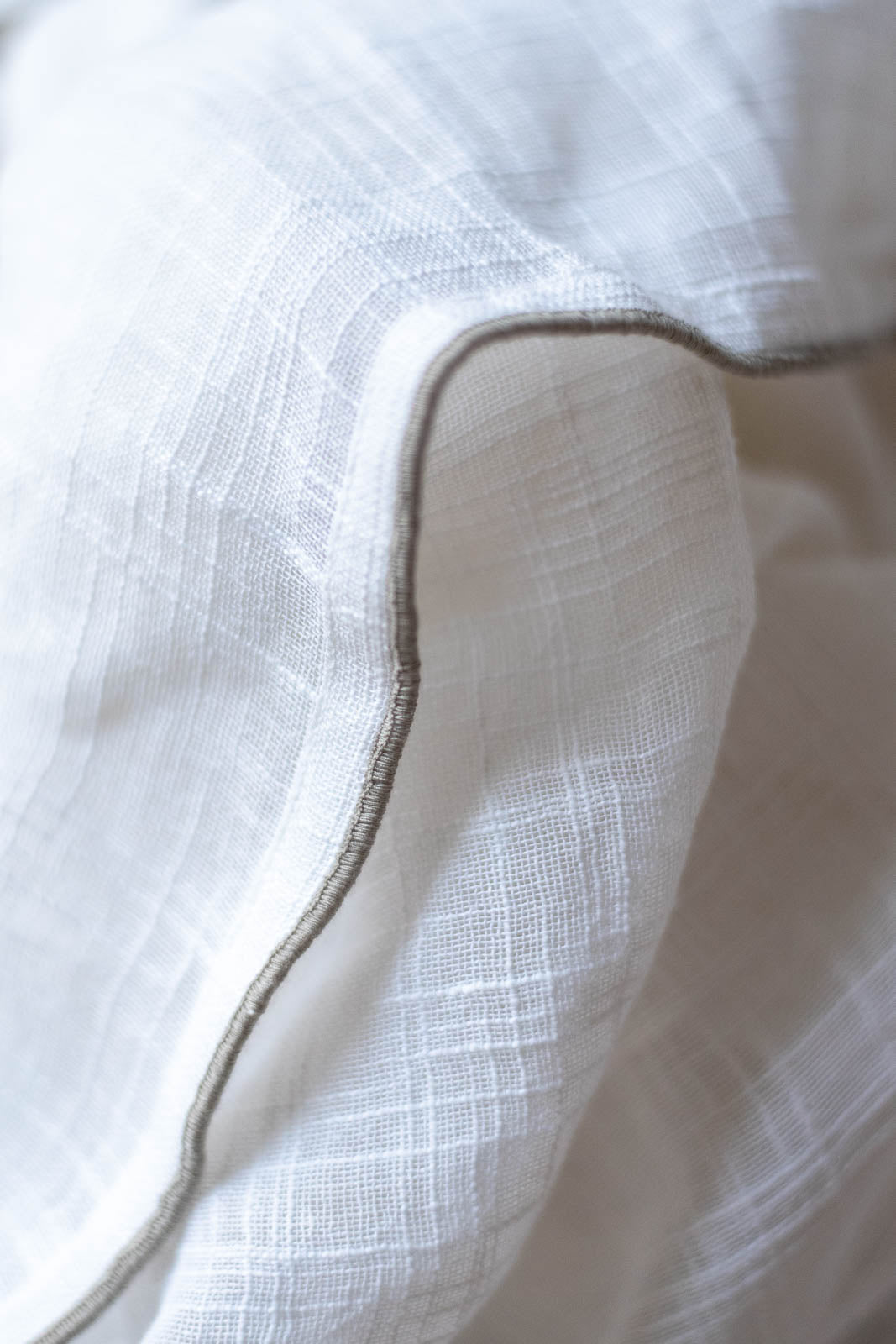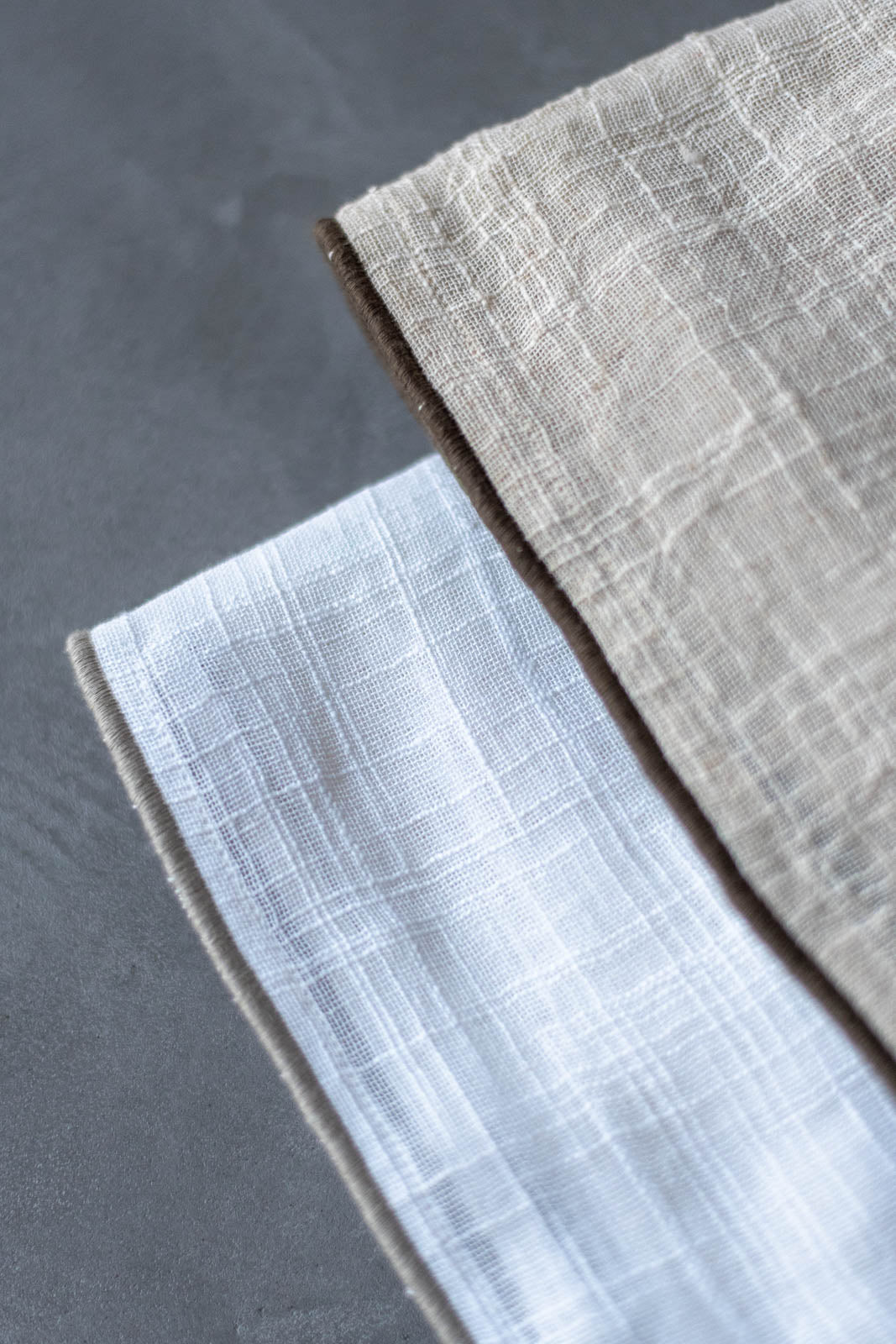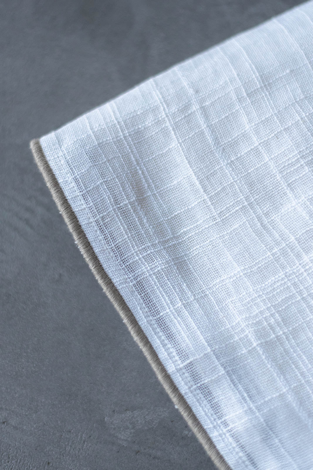 素朴な風合いのホワイトスラブ生地に、明るいグレーのステッチを添えた一枚です。