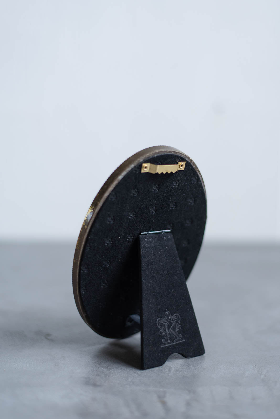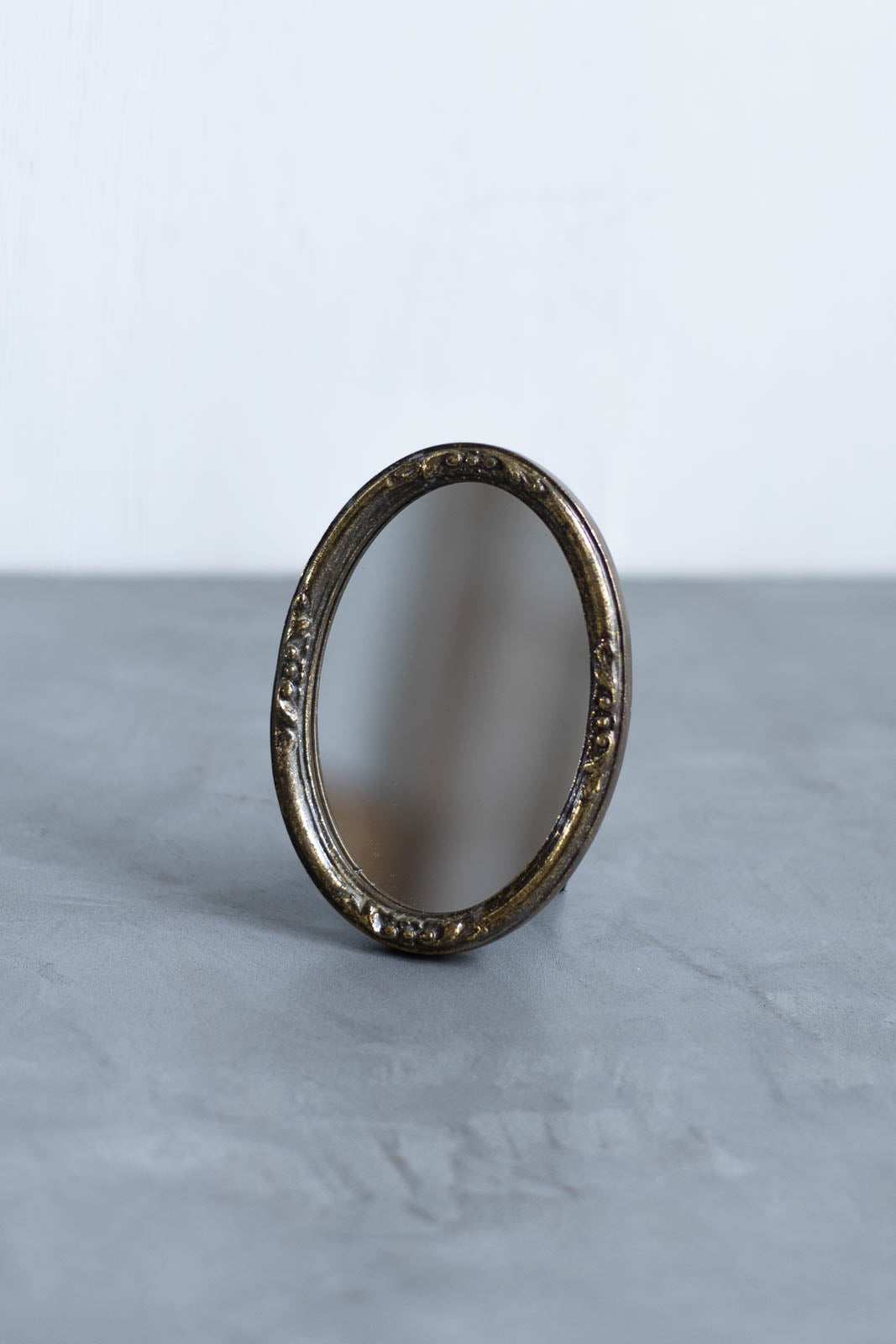 やわらかなアンティーク調の雰囲気が漂う、オーバル型のミニミラー。アカンサスの葉のデザインは、古代ギリシャの建築や装飾に使われたモチーフで、クラシカルで優雅な印象を添えます。デスクの上に立てたり、ウォールデコのように飾ったりすることで、空間にほどよいリズムとアクセントが生まれます。