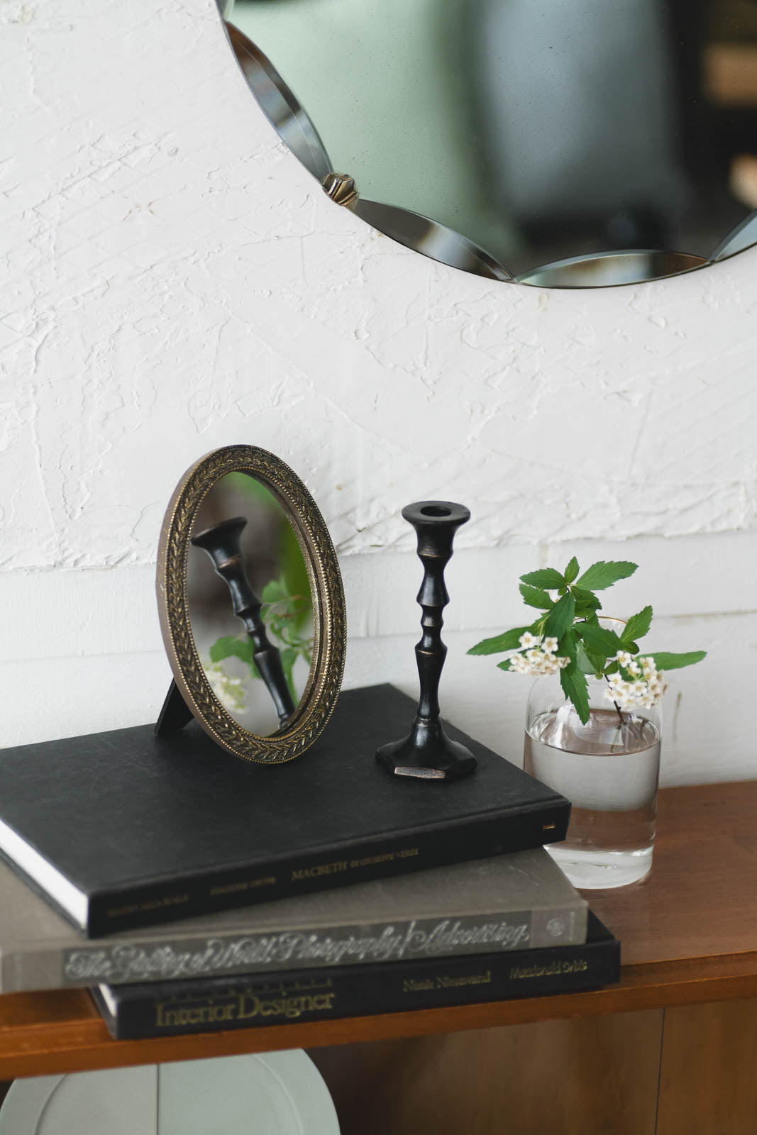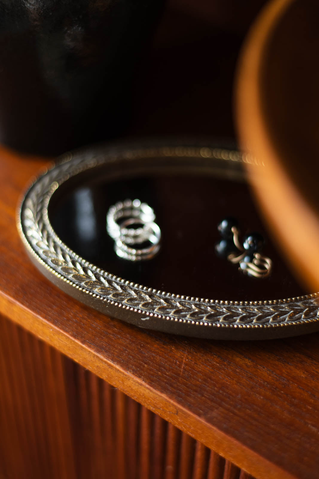 ドレッサーの上に縦置きすれば、アクセサリーをつけた後のバランスチェックにもぴったり。壁にかけて飾れば、繊細なフレームの存在感がインテリアに上品なニュアンスを加えてくれます。アクセサリーをのせるミラートレーとして使えば、何気ない日常にも静かな華やかさを添えてくれます。