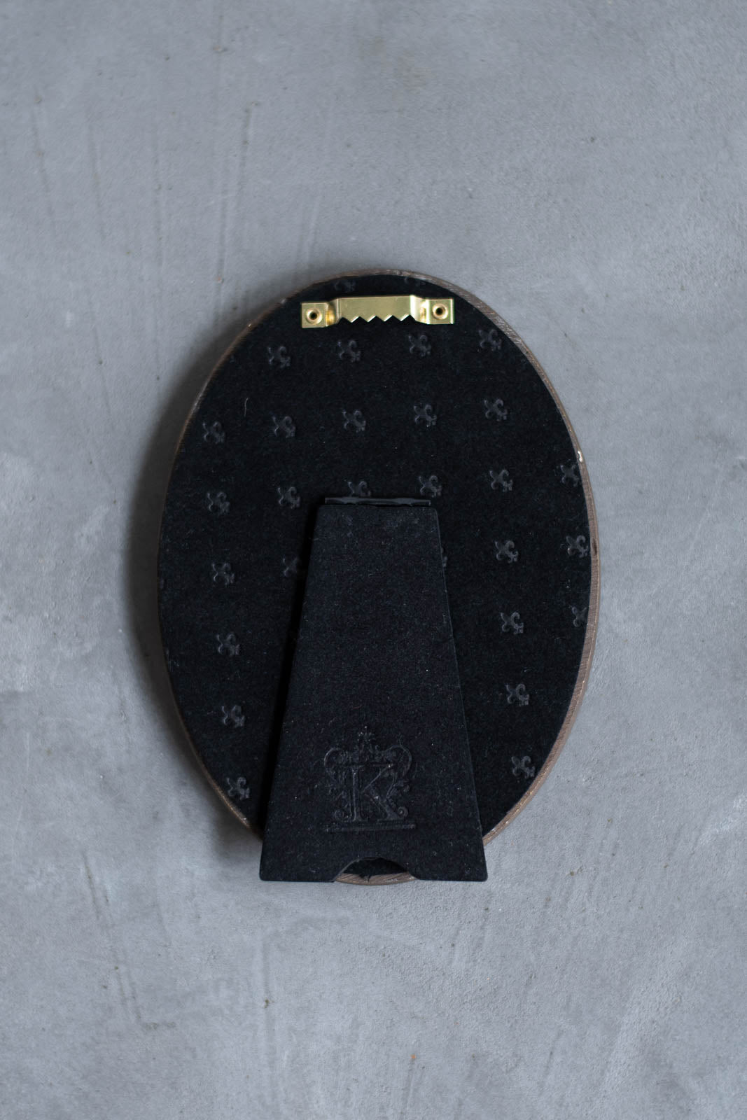 やわらかなアンティーク調の雰囲気が漂う、オーバル型のミニミラー。クラシカルなリーフモチーフの縁取りが上品な印象を添えます。デスクの上に立てたり、ウォールデコのように飾ったりすることで、空間にほどよいリズムとアクセントが生まれます。