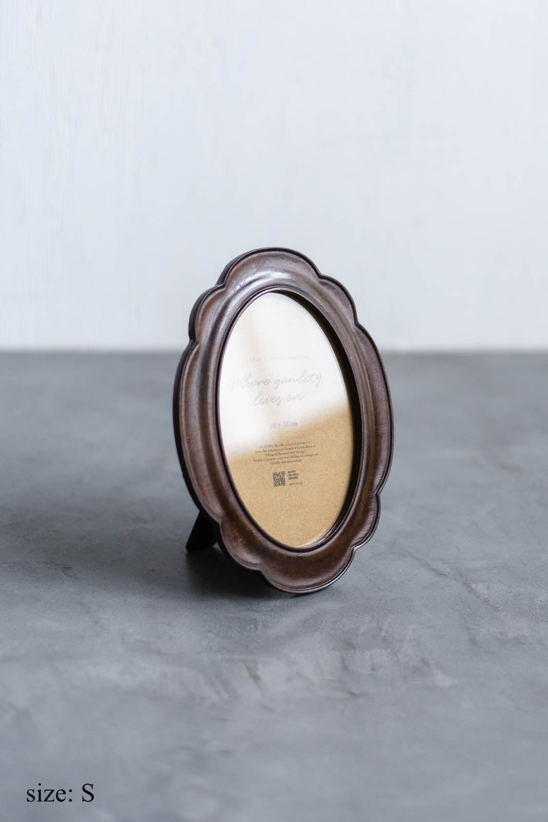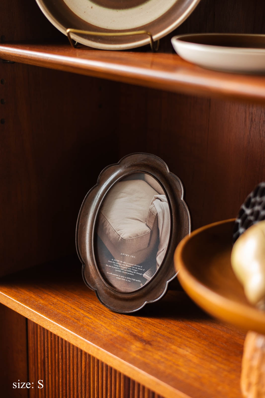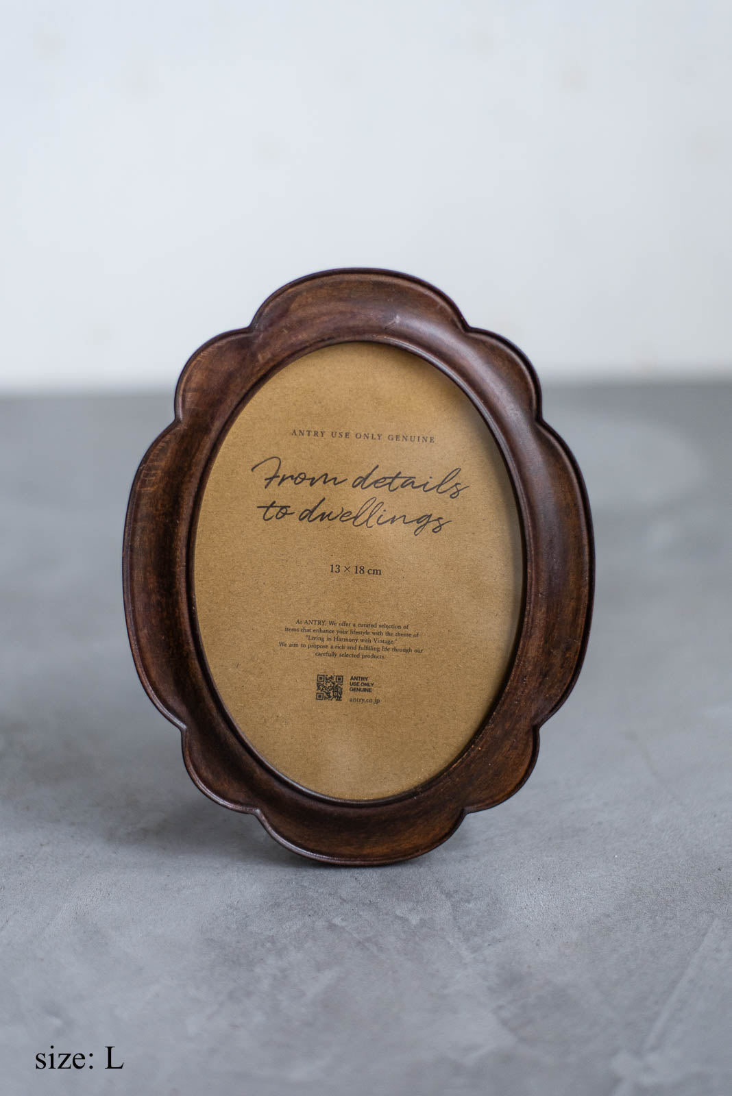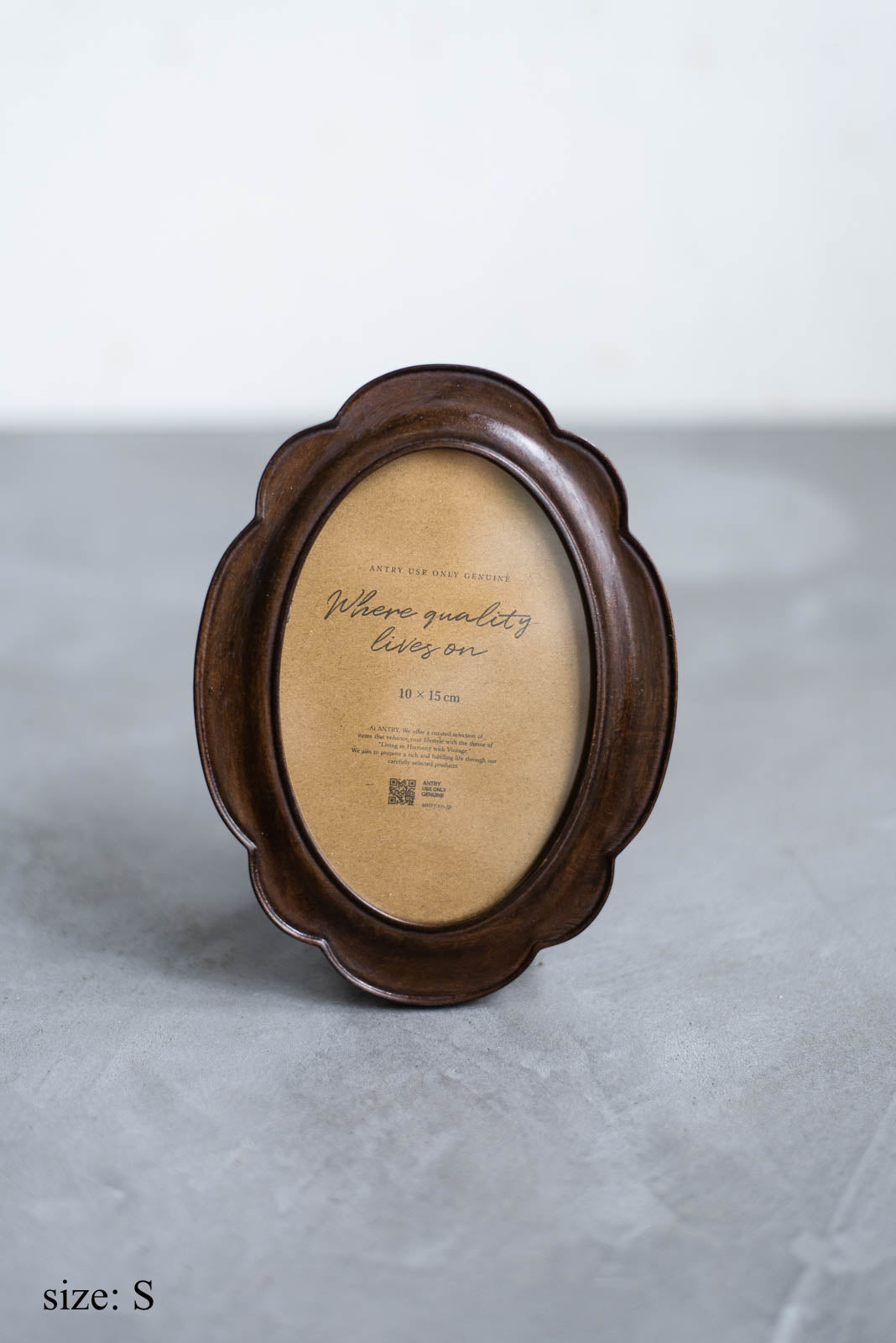 やわらかなアンティーク調の雰囲気が漂う、オーバル型のフォトフレーム。周囲を囲う花弁のような形状は古いフランスの生活道具などに多く見受けられるデザイン。愛らしくも可愛くなりすぎず、時を経たヴィンテージフレームのような佇まいです。