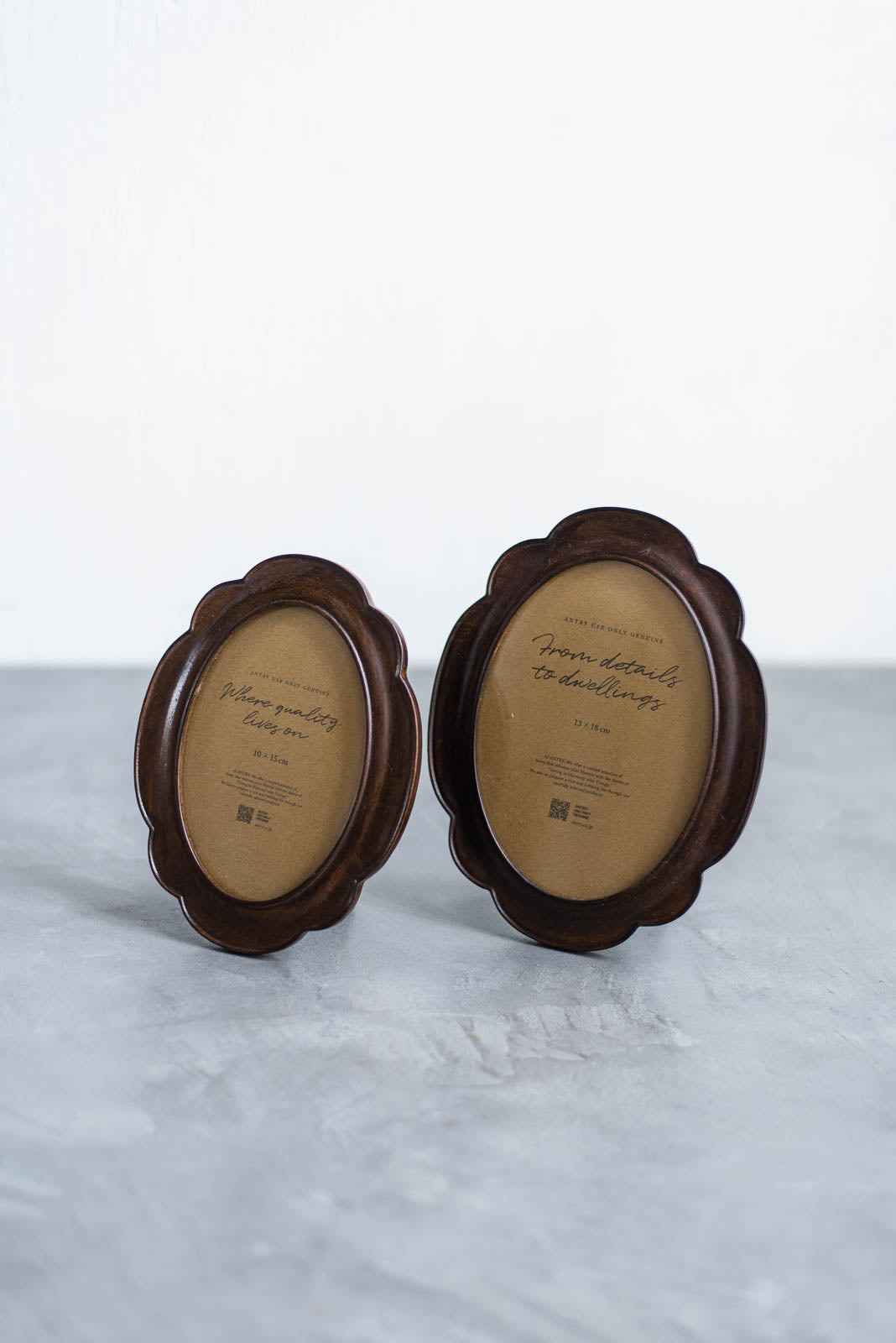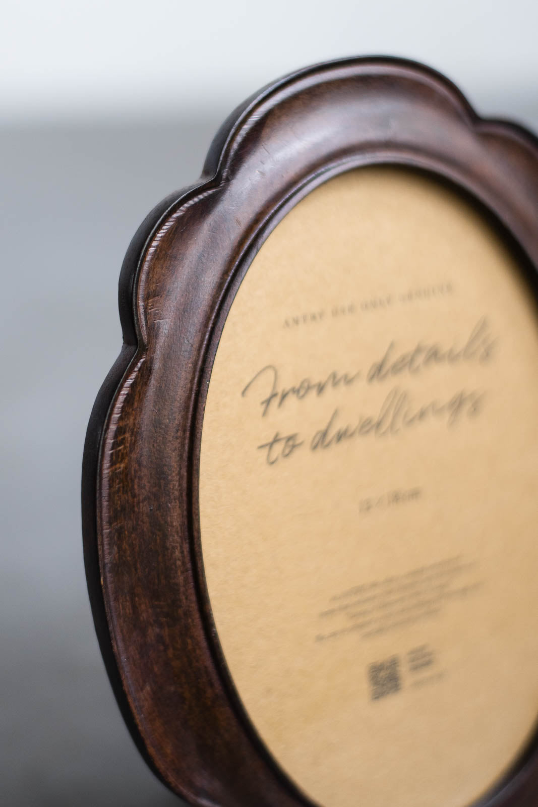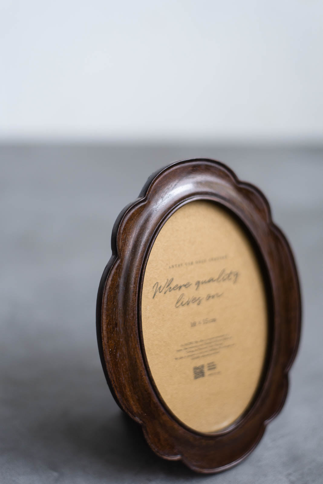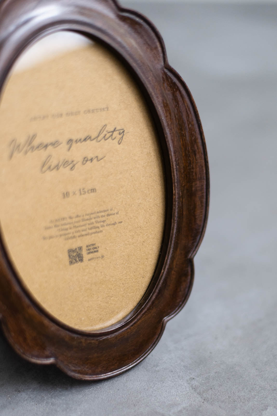 やわらかなアンティーク調の雰囲気が漂う、オーバル型のフォトフレーム。周囲を囲う花弁のような形状は古いフランスの生活道具などに多く見受けられるデザイン。愛らしくも可愛くなりすぎず、時を経たヴィンテージフレームのような佇まいです。