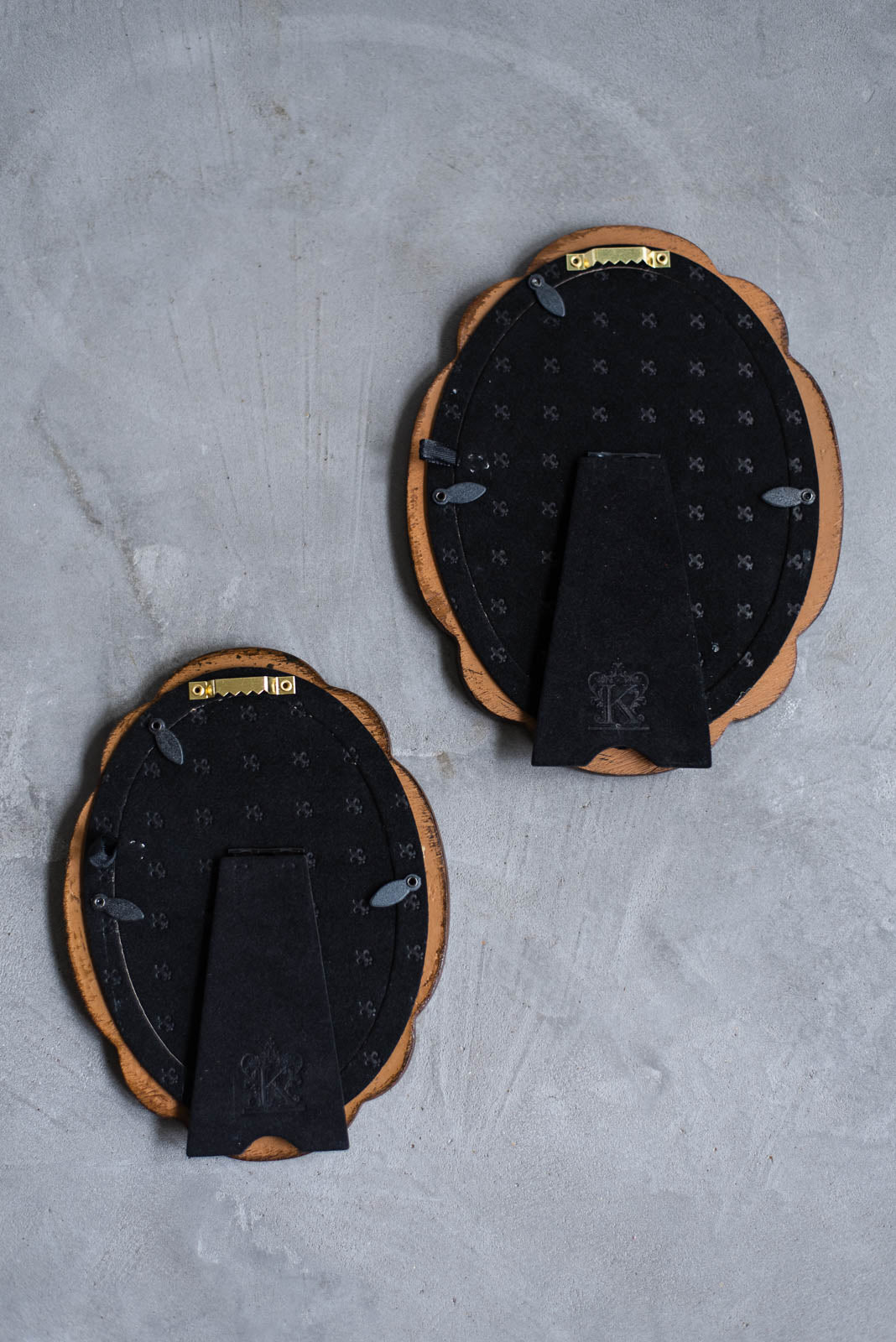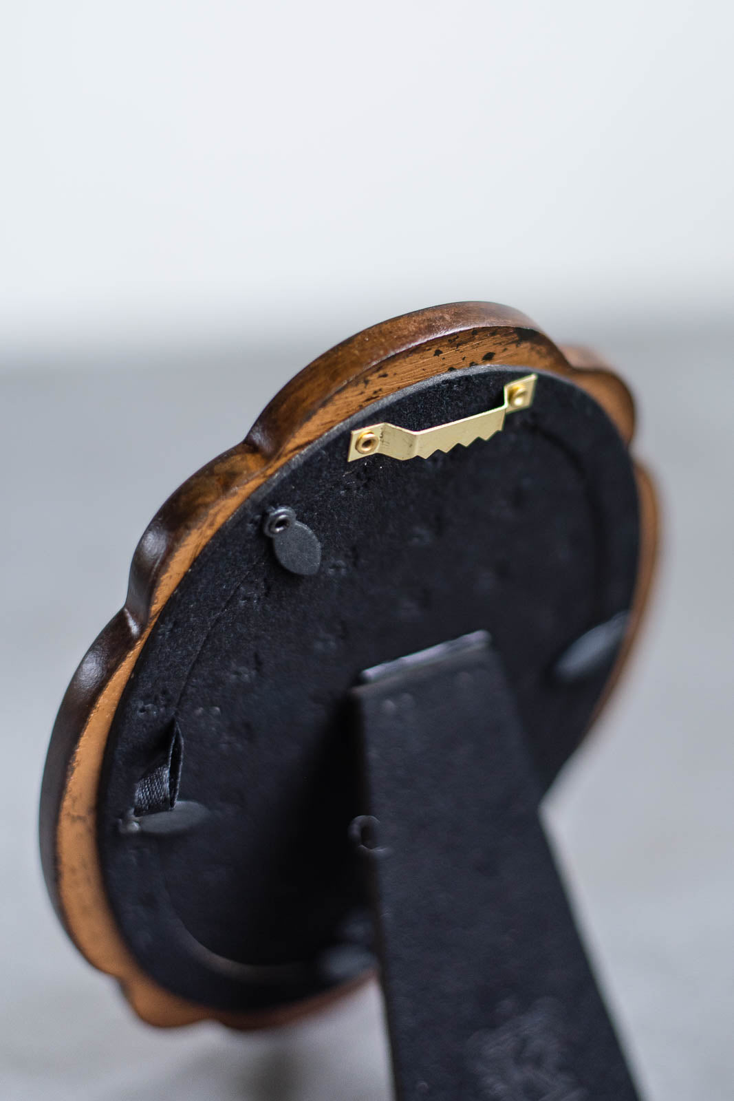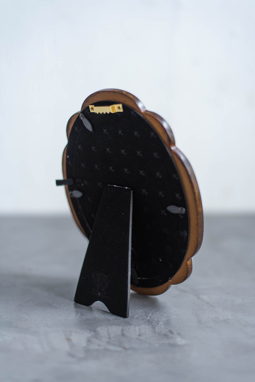 繊細な装飾や陰影を美しく映し出すのは、レジン素材ならではの魅力。木製と見紛うほど精巧に作られたフレームはインテリアに上品なニュアンスを加えてくれて、空間に溶け込みながらも目を引く存在感を放ちます。