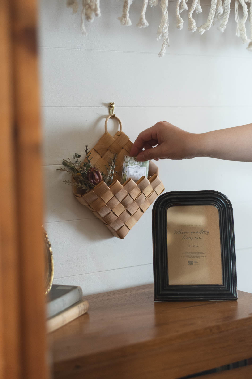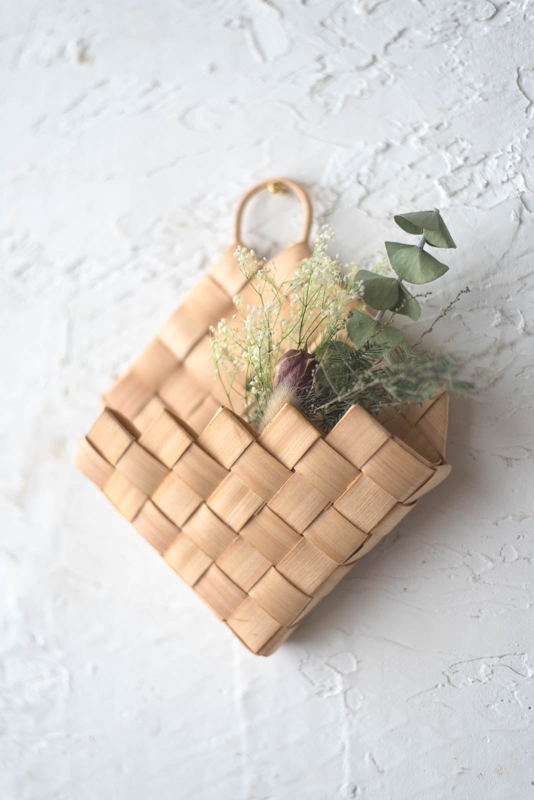 ユーカリなどのドライフラワーやエアプランツを入れて玄関やお部屋の壁に飾れば、自然の彩りが加わり、ナチュラルで穏やかな雰囲気に◎