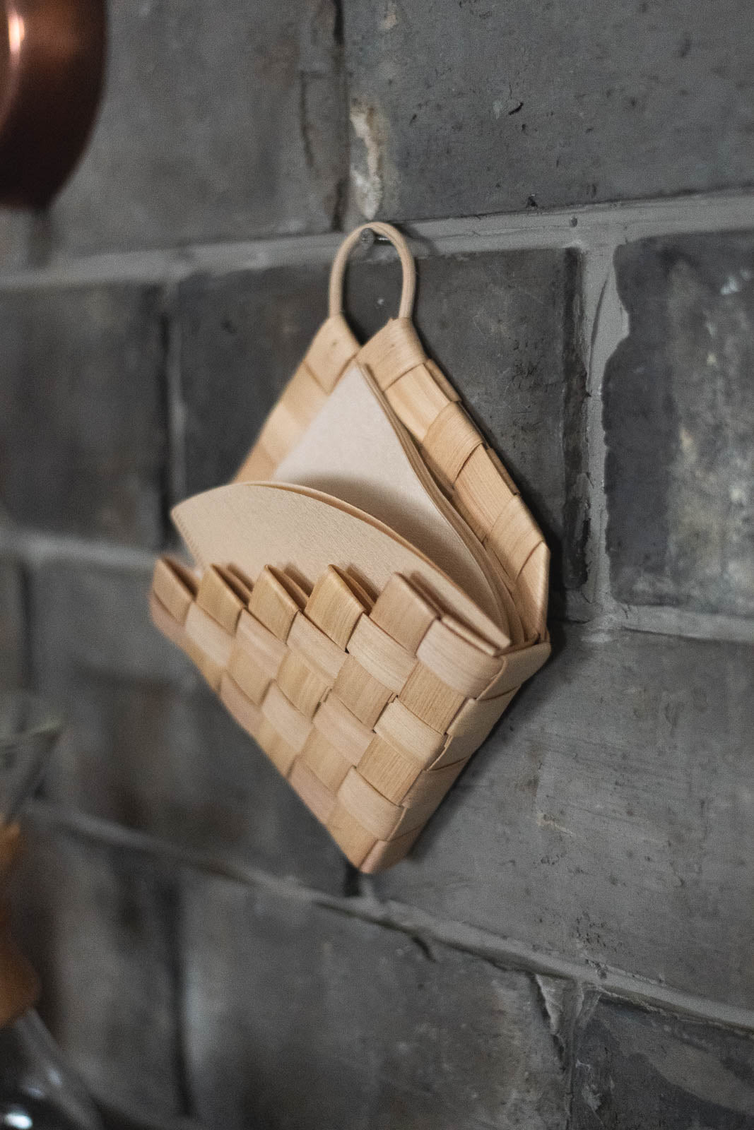 サイズは約横幅18cm×奥行き6cm×高さ18cm。マチ付きで、コーヒーフィルターがすっぽり収まる大きさです。キッチンの壁に掛けておけば、使いたいときにさっと取り出せて便利。