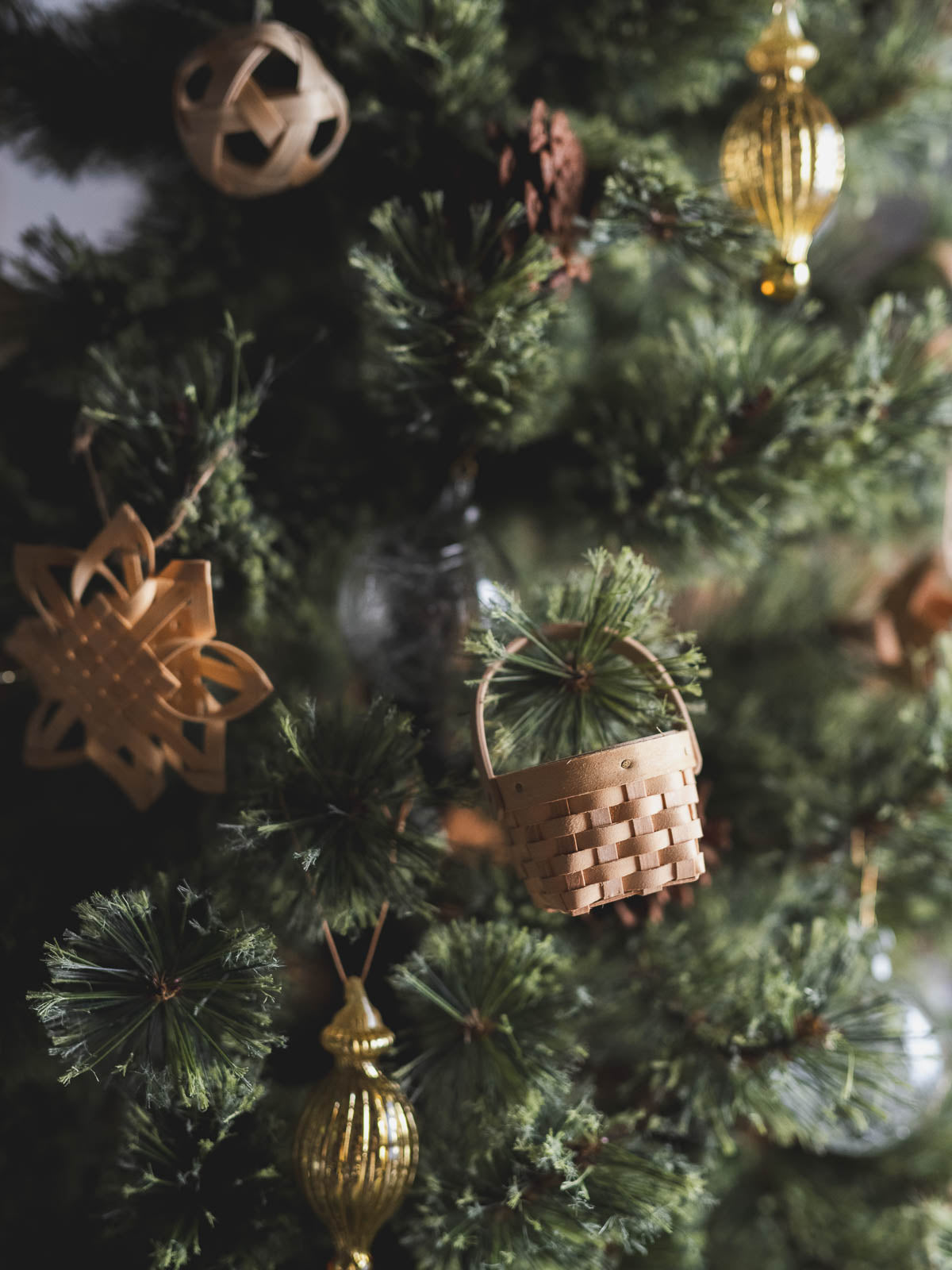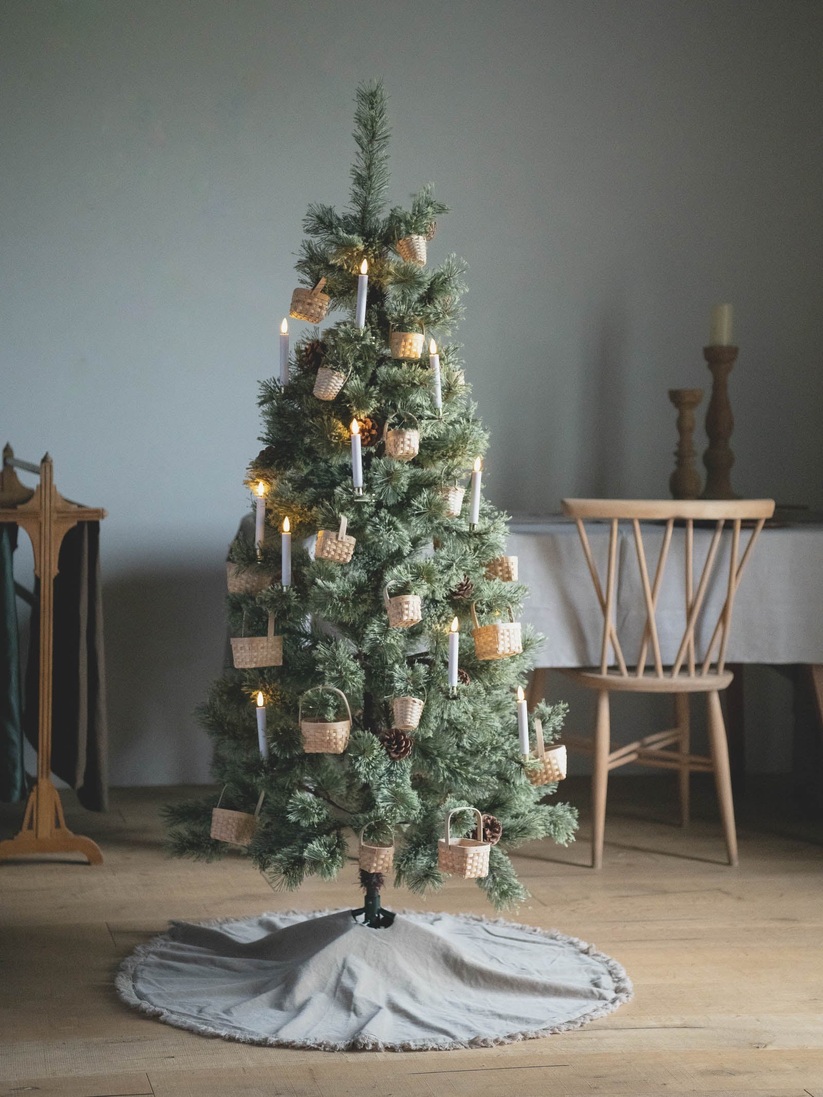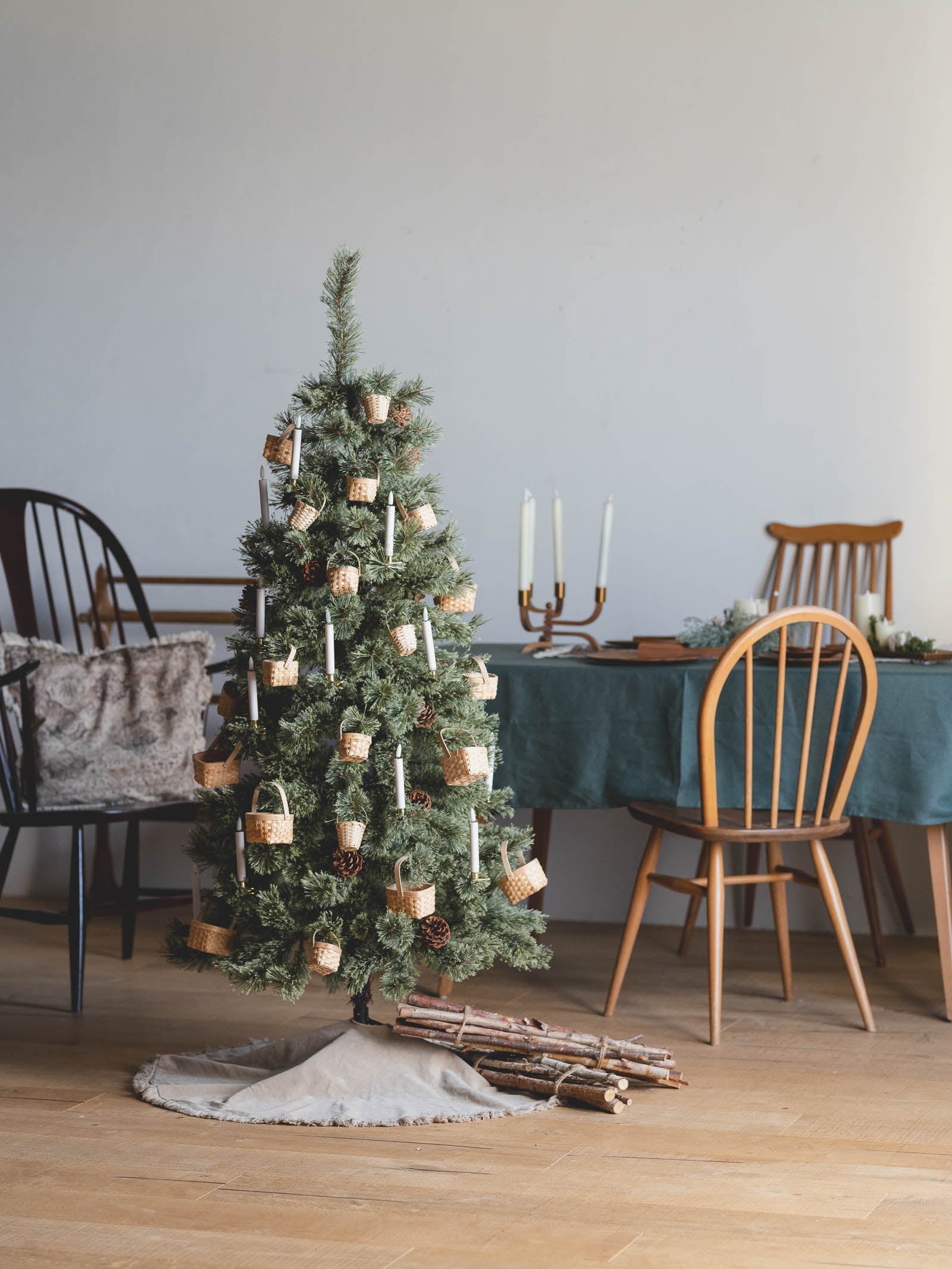 一見涼やかな素材感ですが、自然素材ならではのおおらかな佇まいはHUONE TREEやURHO TREEにもぴったり。北欧のファミリーが楽しむクリスマスのような、ほっこり優しい雰囲気を演出してくれます。使い込んだマシンで素材を割り、職人が一つひとつ手編みしてお作りしています。