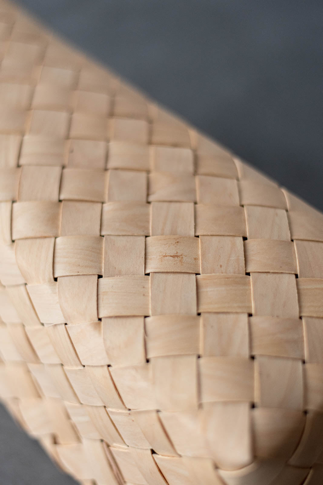 職人の手しごとによって、一つ一つ編まれた編み目。木肌に刻まれた年輪が重なり合うことで生まれる、やわらかな表情。ところどころ混じる色の揺らぎが、どこかほっとするような、やさしく穏やかな空気をまとっています。