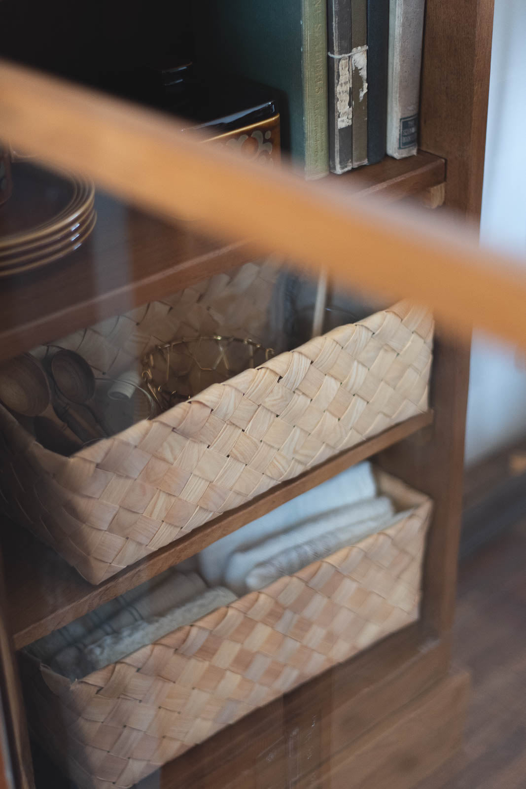 日用品だけでなく、カトラリーやランチョンマットの定位置としてもおすすめ。来客時には、さっと取り出してそのままテーブルに置いても様になる、スマートな収納アイテムです。