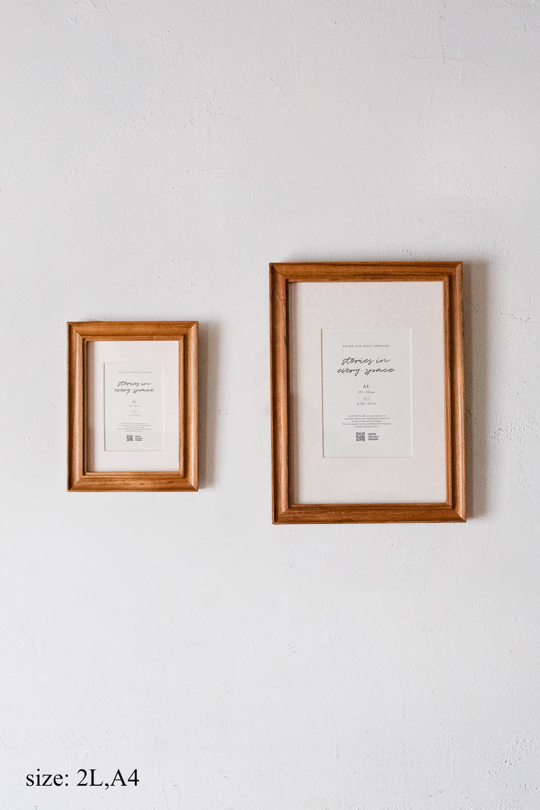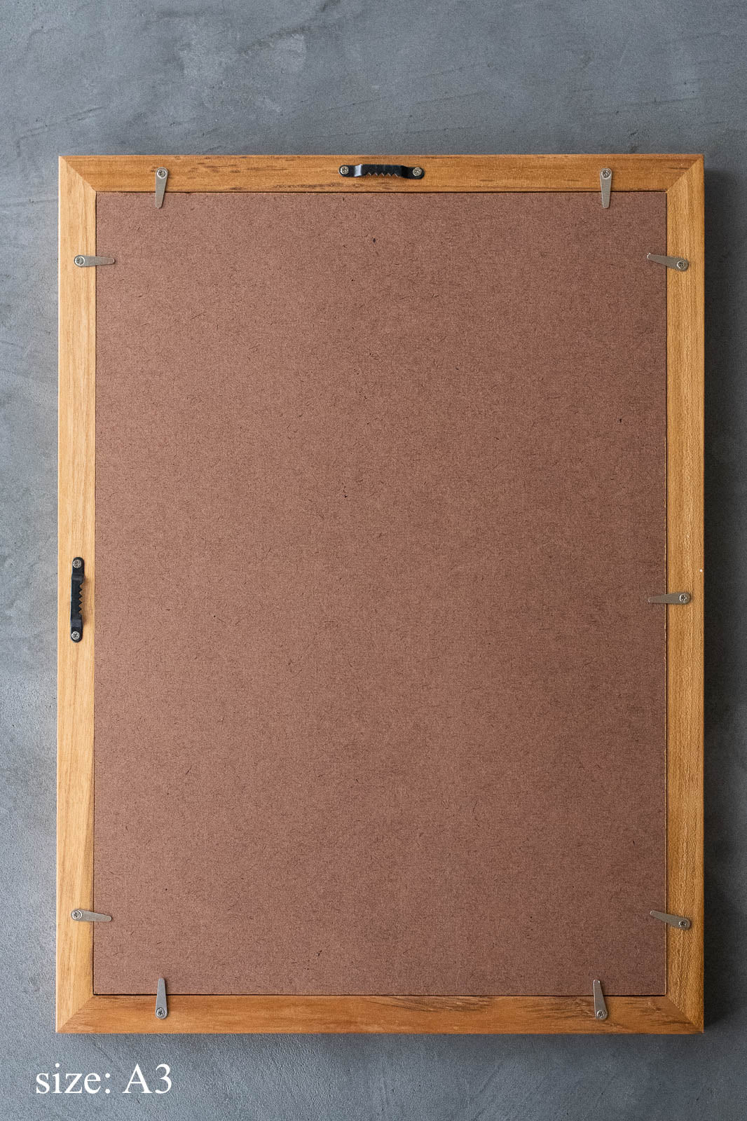 写真2L判(127×178mm)/ A4用紙(210×297mm)/ A3用紙(297×420mm)のサイズでお作りしています。フレームパネル付きなのでそれぞれより小さめの写真やカードを入れて、余白を見せて飾っても素敵です。